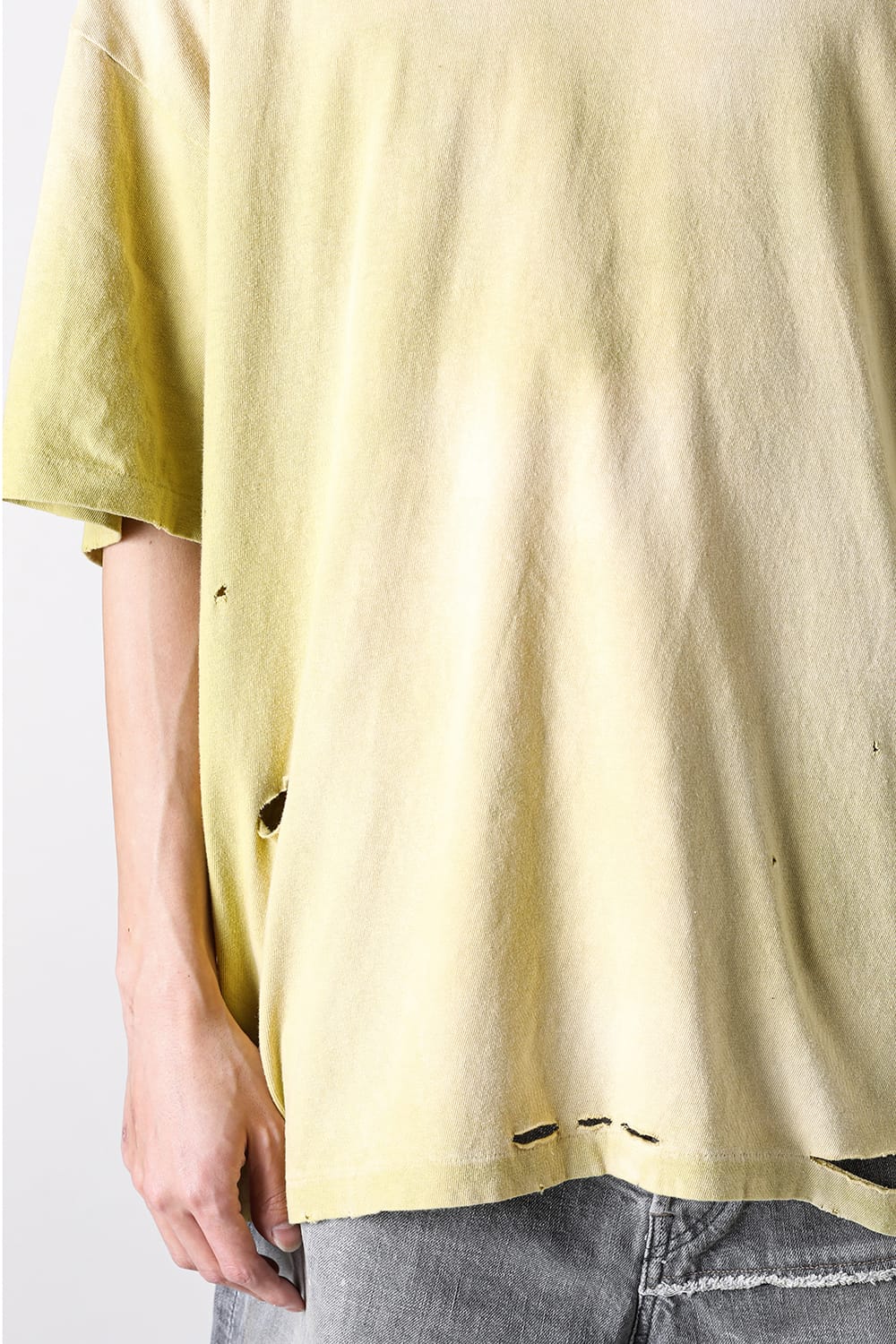 大胆に施されたダメージ加工も見逃せないポイントで、コーディネートに存在感と奥行きをプラス。