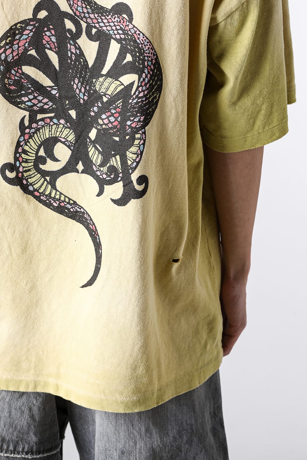 KAMIYAが手掛ける「カミヤスネークディストレストTシャツ」は、背面に配されたオリジナルのスネークグラフィックが印象的な一枚です。