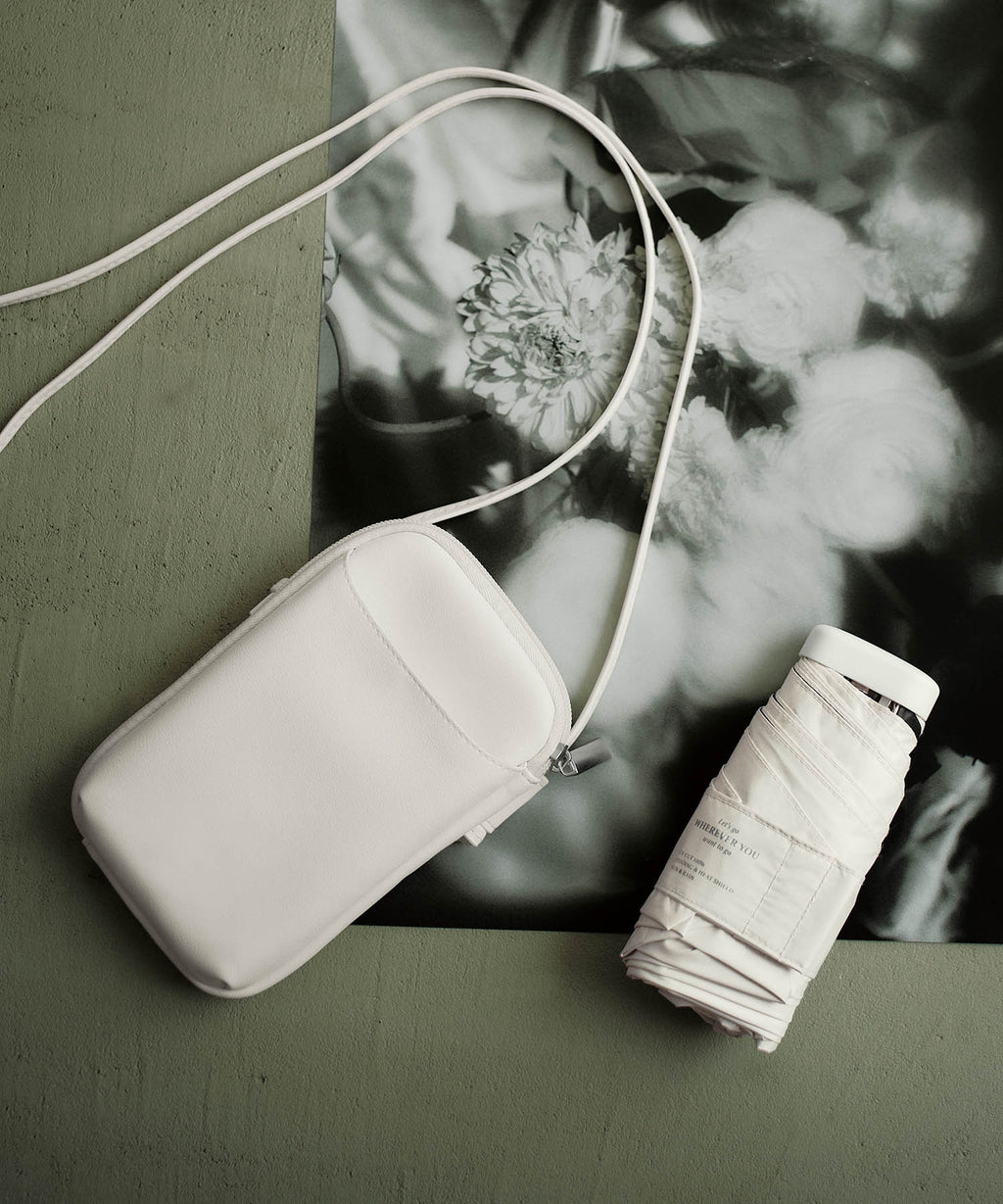 ショルダータイプの収納ポーチは、傘だけでなくスマホや小物も一緒に収納できる実用性の高いデザイン。