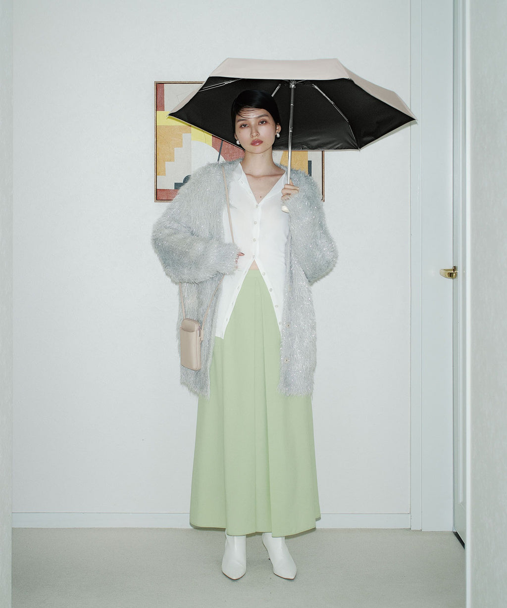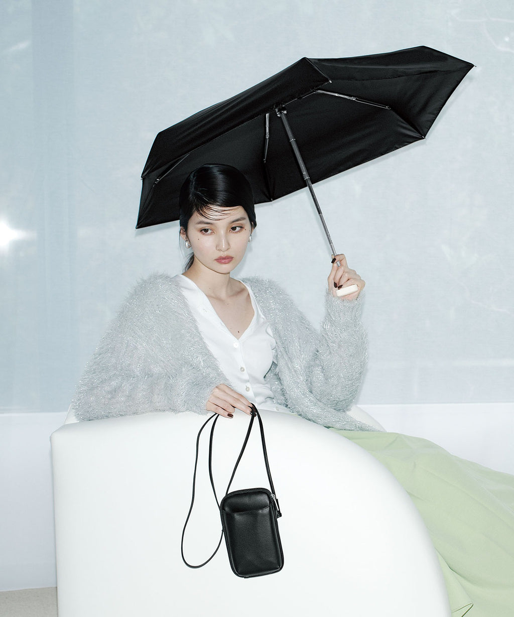 上品なPU素材のショルダーポーチにすっきり収まるミニ折りたたみ傘