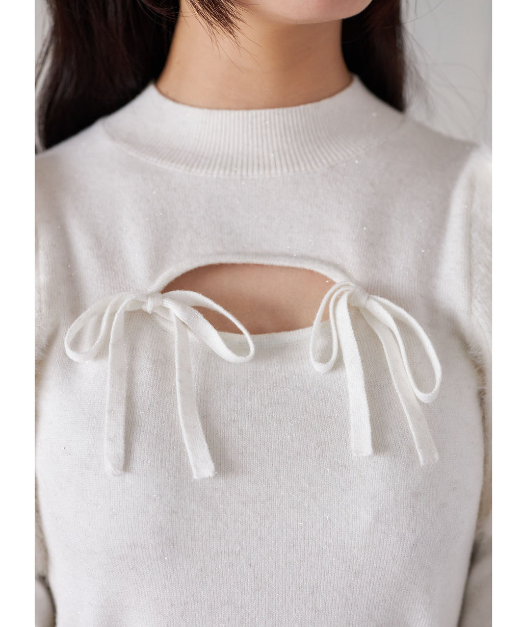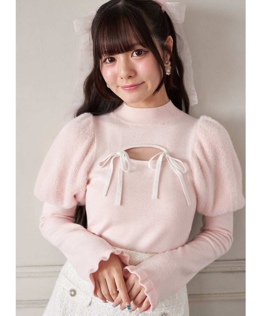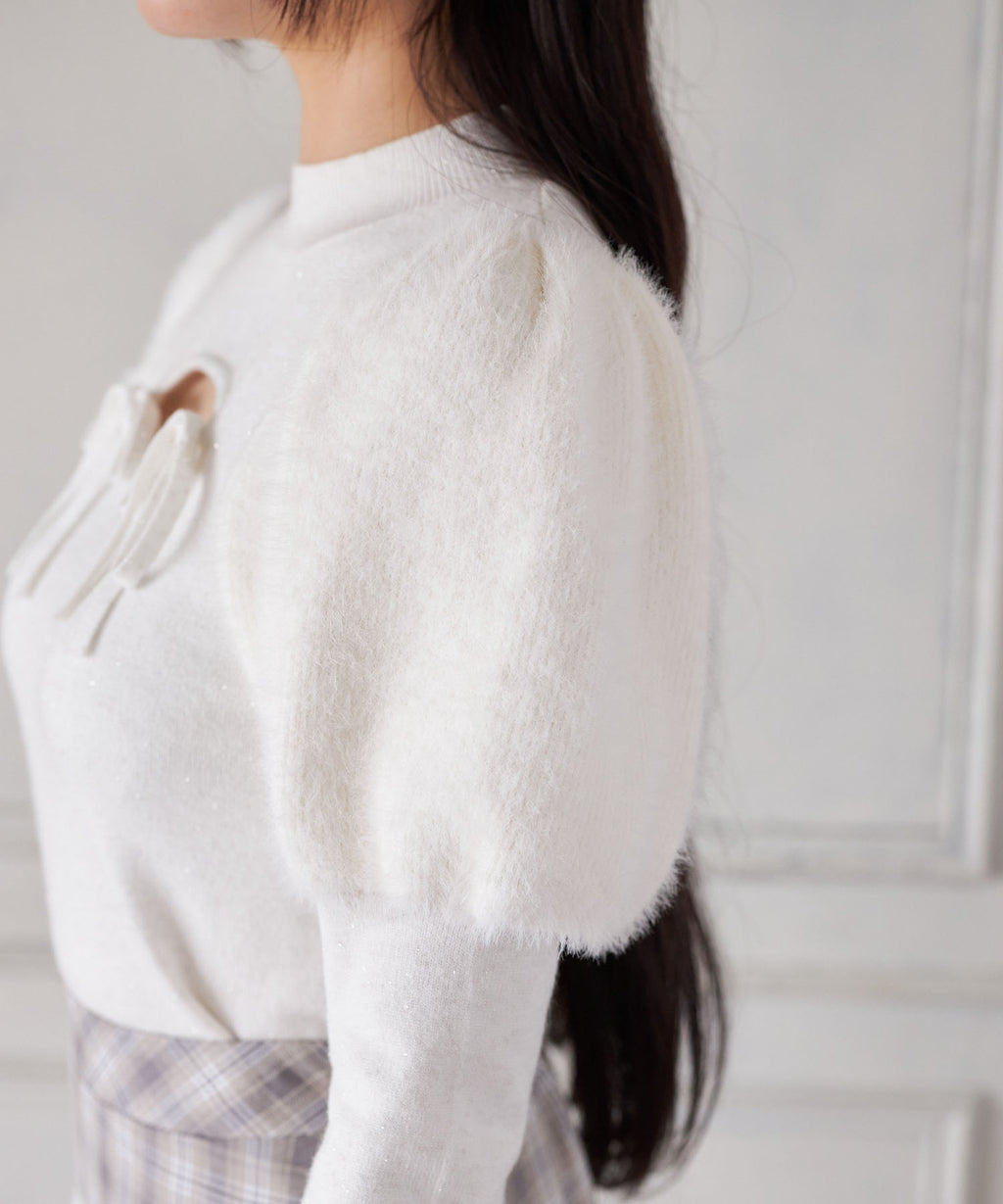 スユン Suyunn リボン付きパフスリーブラメシャギーニットプルオーバー