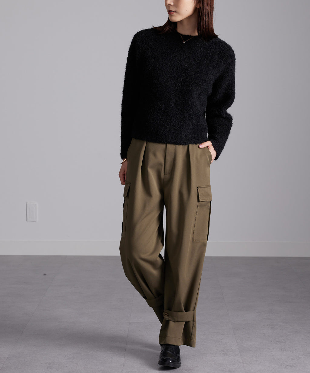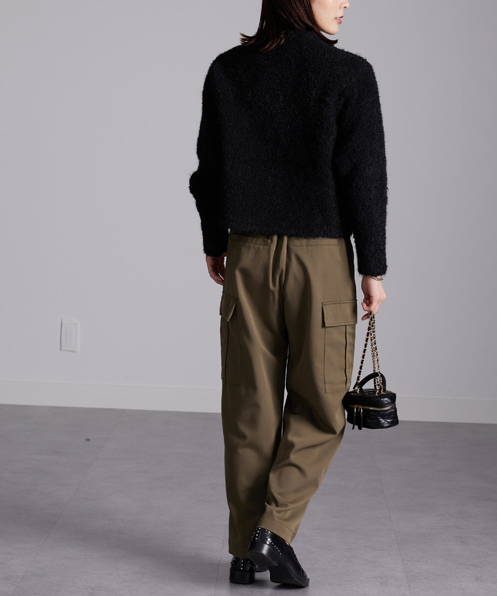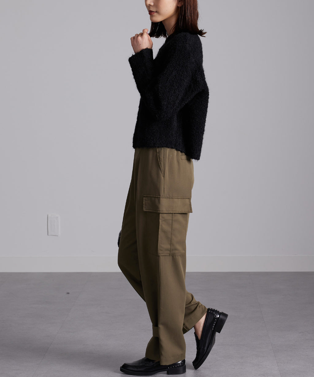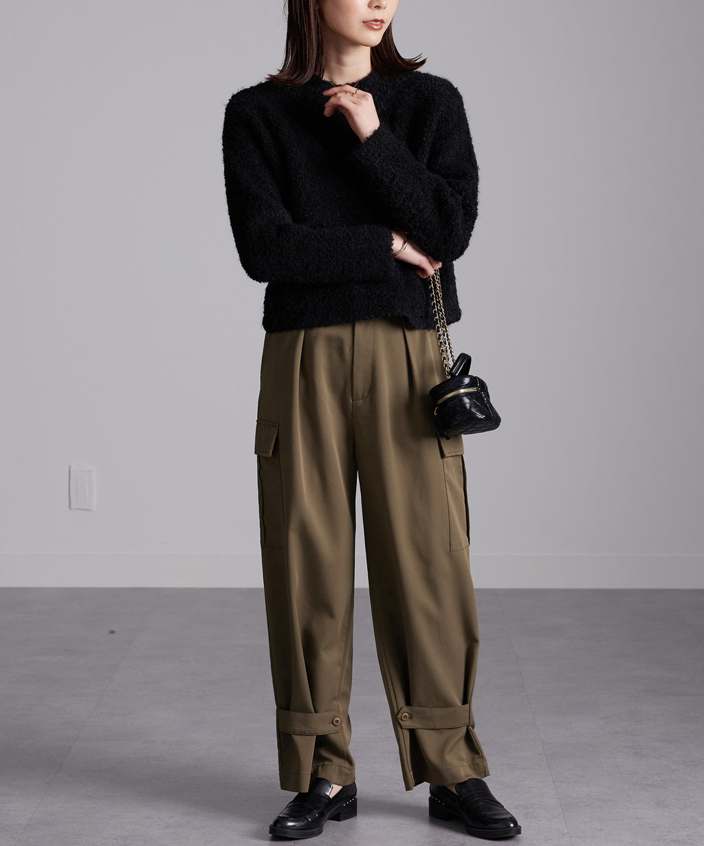 トレンドのカーゴパンツをきれいめ素材で女性らしい印象に。
