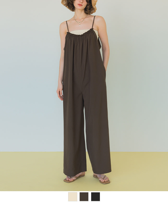 ・ロング丈バンドゥとハイウエストショーツ×とろみ感のあるワイドシルエットのキャミソールオールインワンの3点セットビキニ。