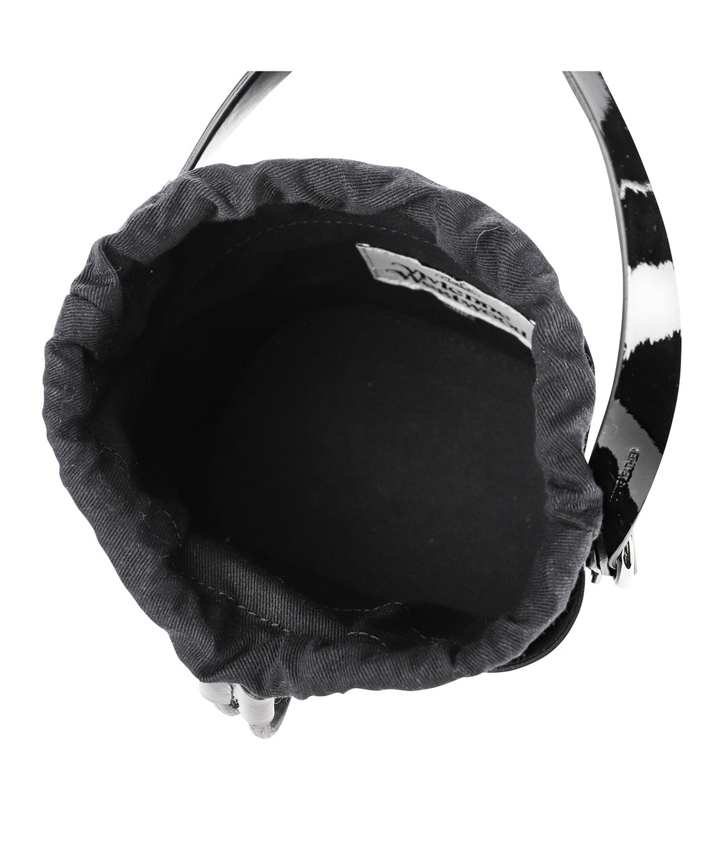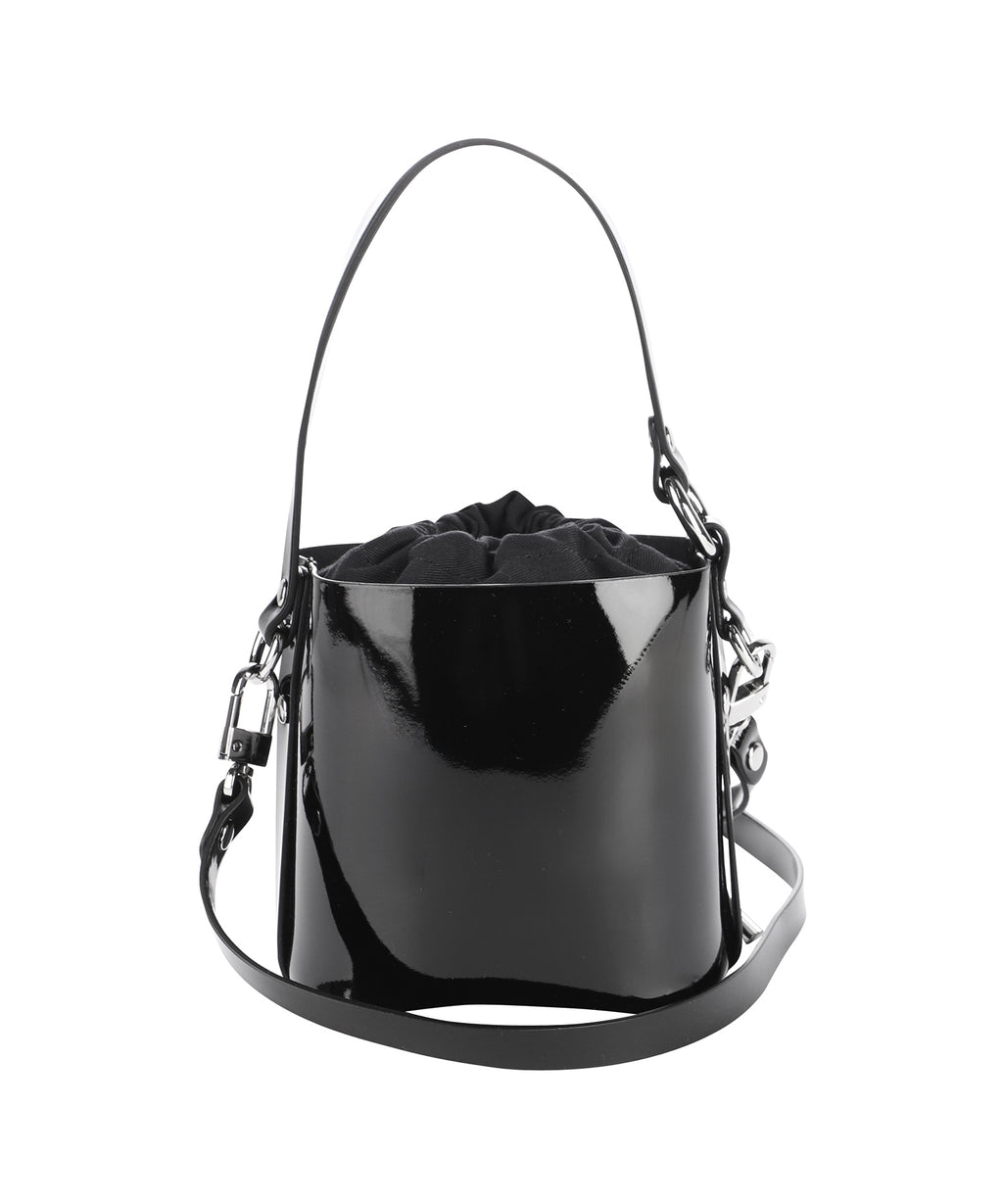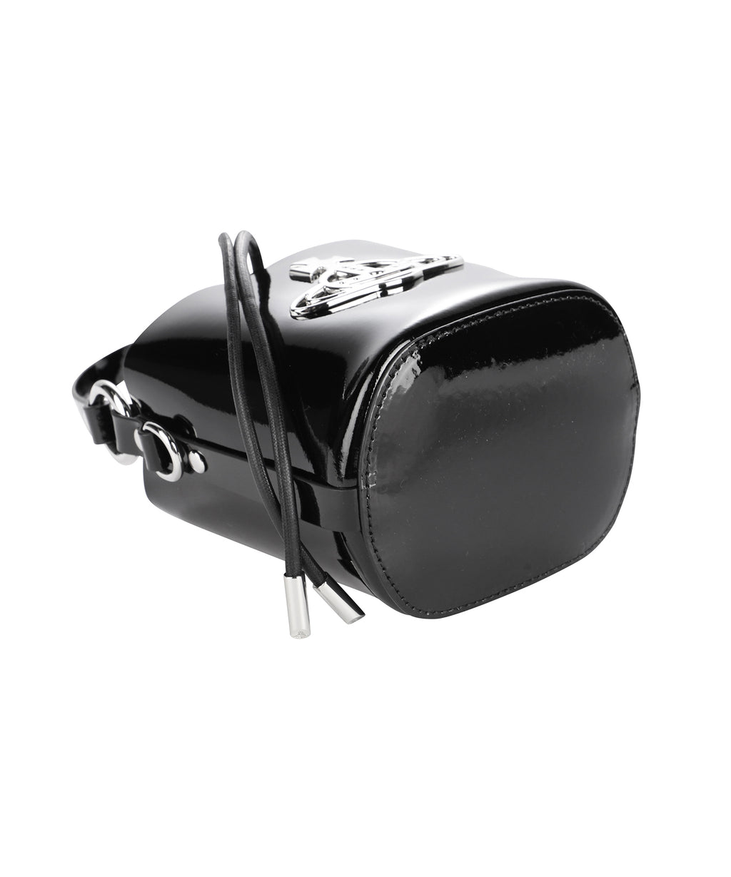 光沢のあるパテントレザーを使用したミニサイズのバケットバッグ。筒形のキュートなフォルムにオーバーサイズのオーブモチーフがインパクトあるアクセント。必要最小限が収納できるコンパクトタイプ。着脱可能なショルダーストラップが付属した2WAY仕様です。アクセサリー感覚でお使いいただけます。