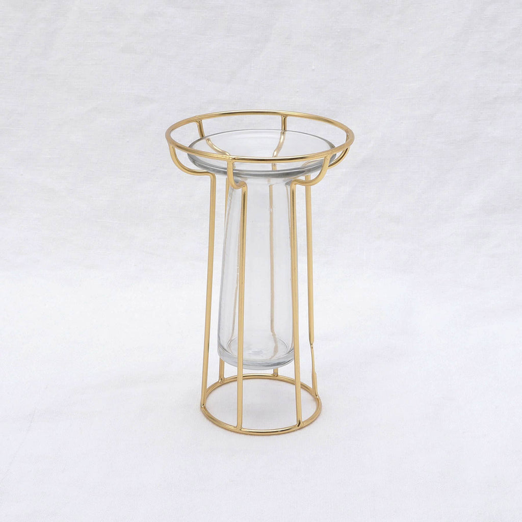 ゴールドのフレームとガラス管を組み合わせたフラワーベース。