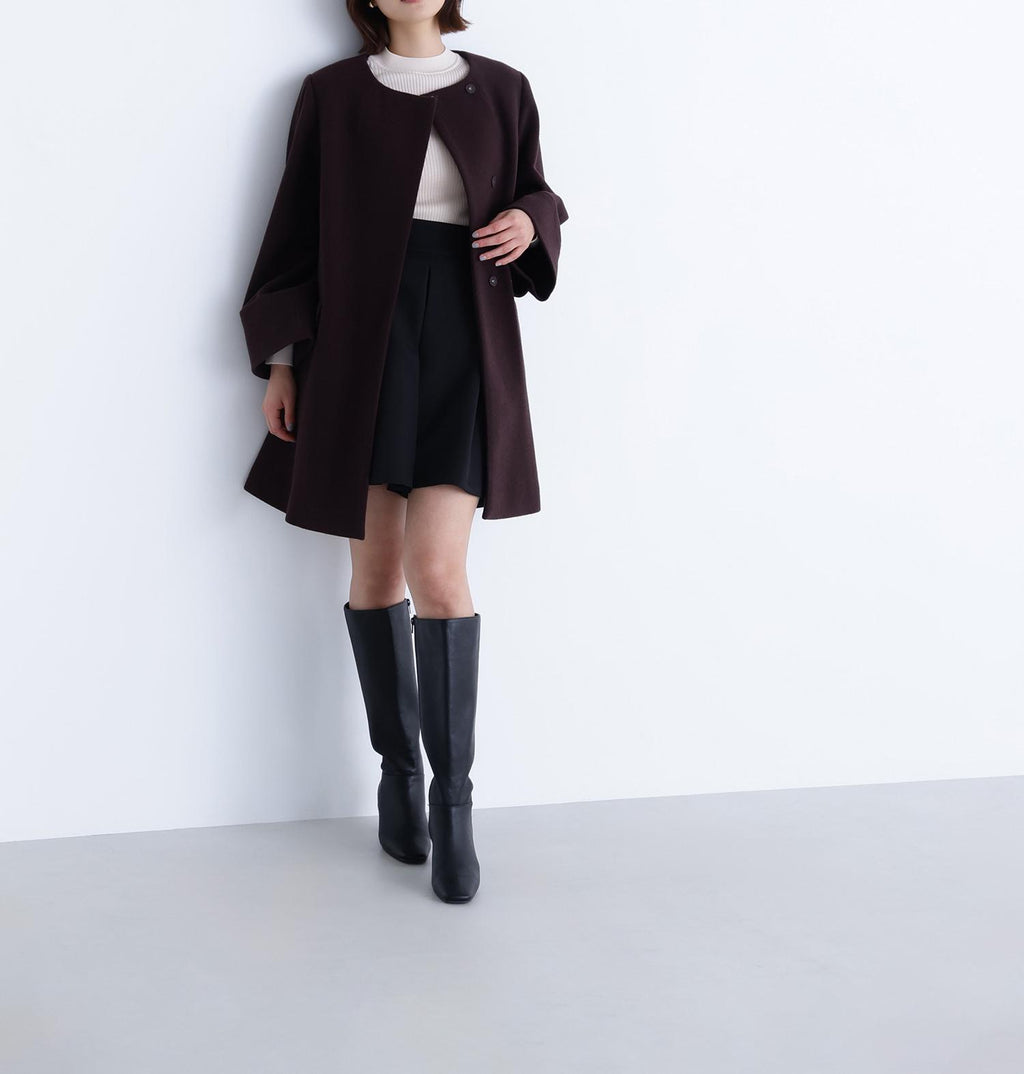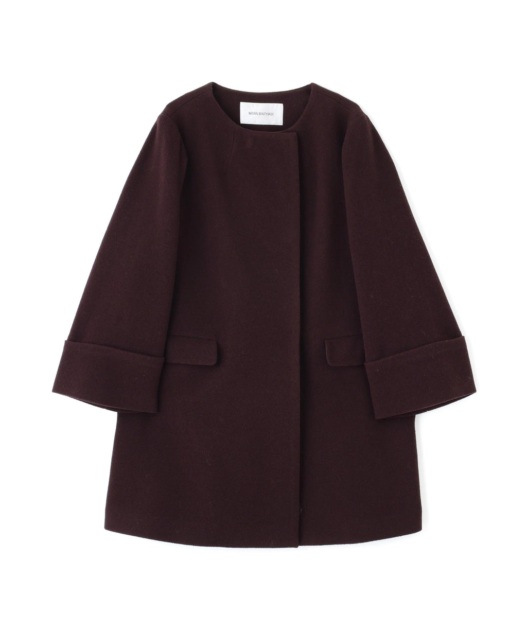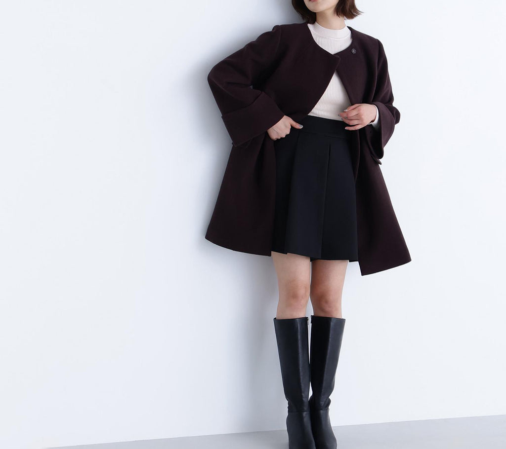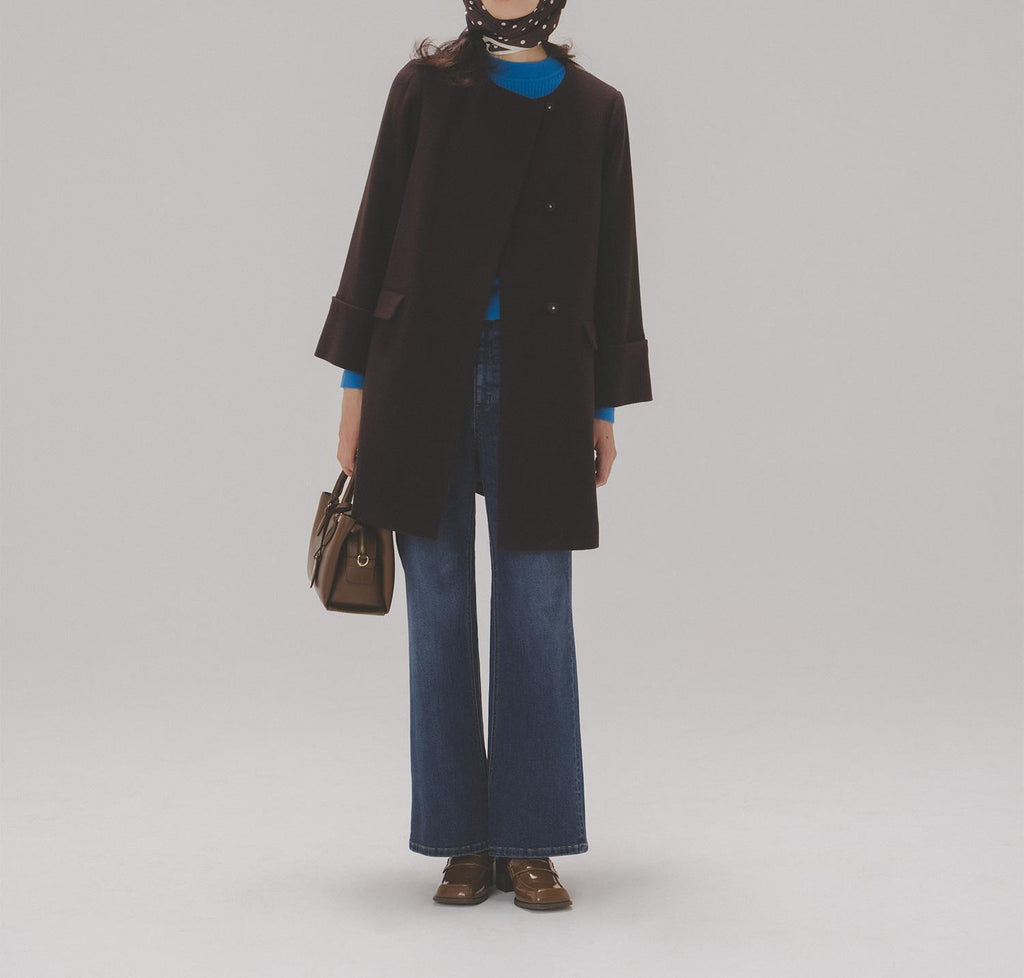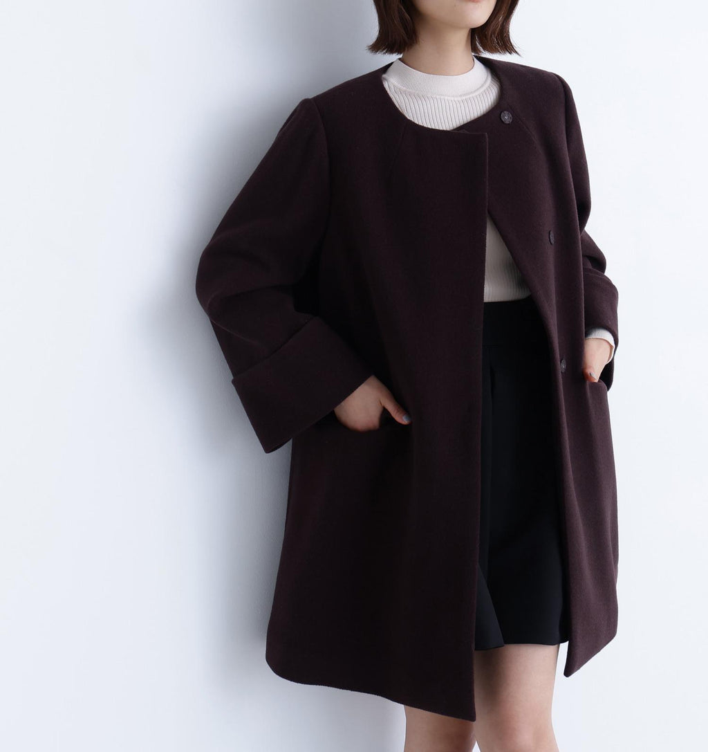 昨年人気だったコートを、よりフォルムが出る素敵な素材にアップデート!お尻が隠れるくらいのAラインシルエットが上品なコートです。女性らしい印象に見せてくれるワイドな袖口がポイントで、ボリュームのあるニットなども合わせやすい仕上がりに。襟元はノーカラーでミニマルなためマフラーなど首まわりの小物とも好相性。フロントはスナップ釦のダブル仕様が品よく、シンプルでどんなアイテムとも合わせやすいデザインです。