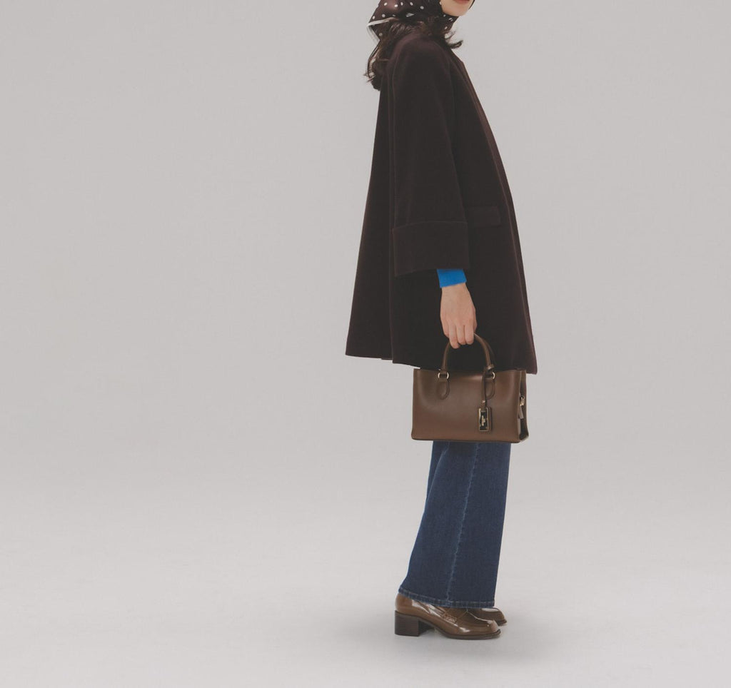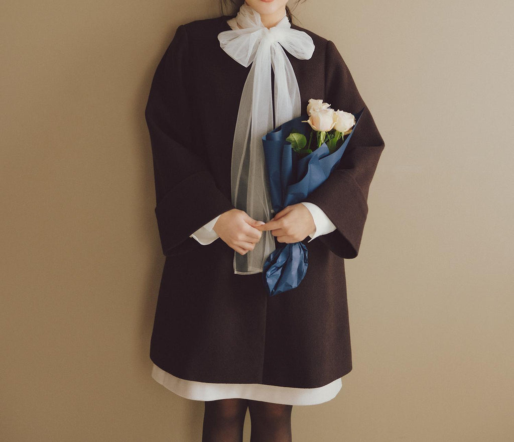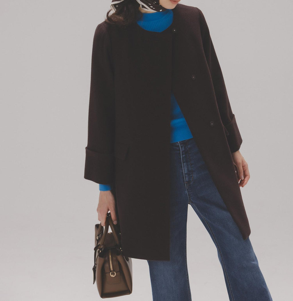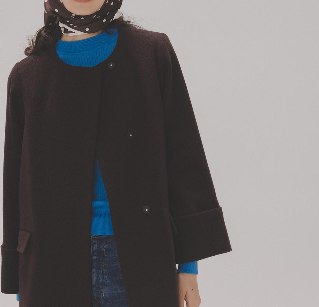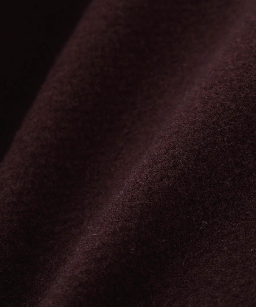 昨年人気だったコートを、よりフォルムが出る素敵な素材にアップデート!お尻が隠れるくらいのAラインシルエットが上品なコートです。女性らしい印象に見せてくれるワイドな袖口がポイントで、ボリュームのあるニットなども合わせやすい仕上がりに。襟元はノーカラーでミニマルなためマフラーなど首まわりの小物とも好相性。フロントはスナップ釦のダブル仕様が品よく、シンプルでどんなアイテムとも合わせやすいデザインです。