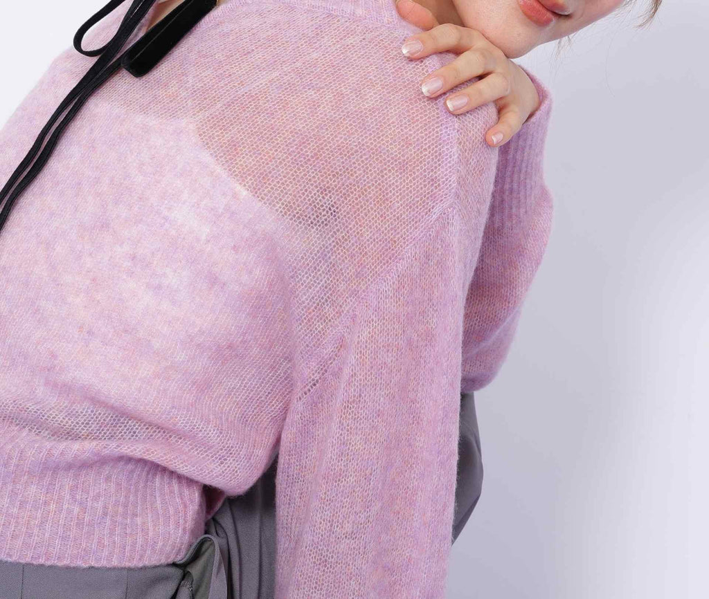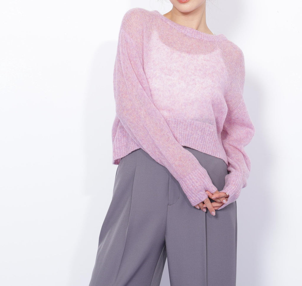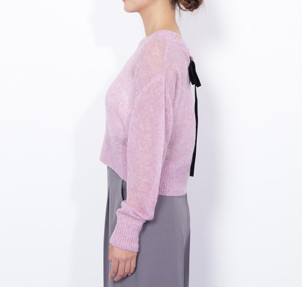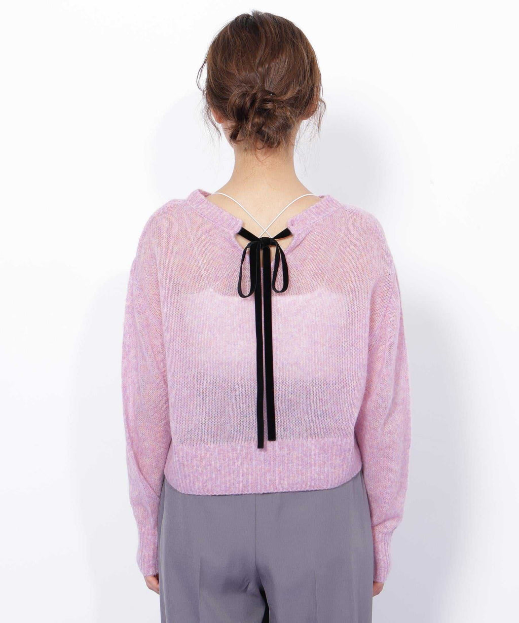 ニットのふんわり感とほんのり透けるシアー感を両立したレディな短丈ニット。背中には繊細なベロアリボンを付けており、後ろ姿まで抜かりない可愛さを演出。透ける素材感なのでお持ちのインナーをご着用ください。デニム合わせでカジュアルにも、スカート合わせでフェミニンにも着回せます。※撮影時照明の関係により、色味が違って見える場合がございます。