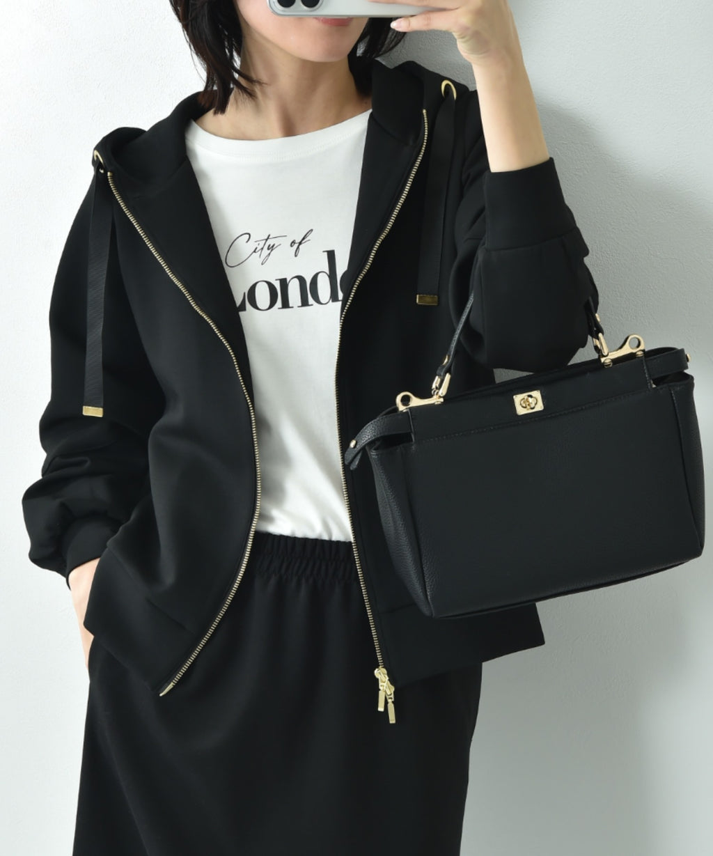 フロントはジップ仕様で着脱しやすく、ドローコードの先端に施された金具がさりげないアクセントに。