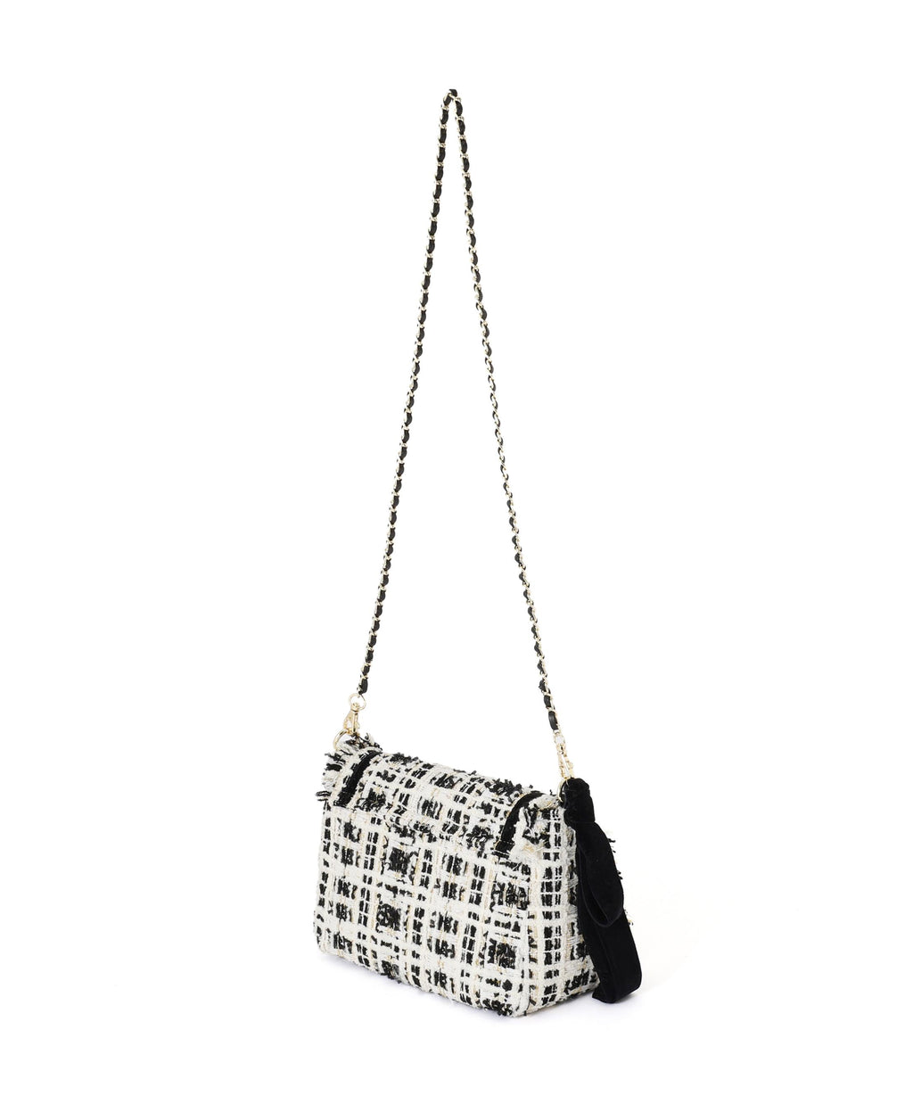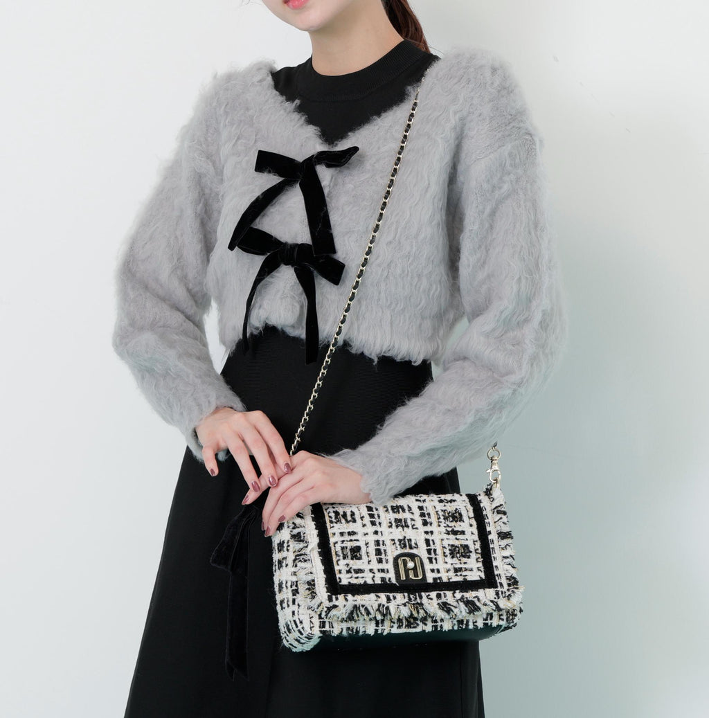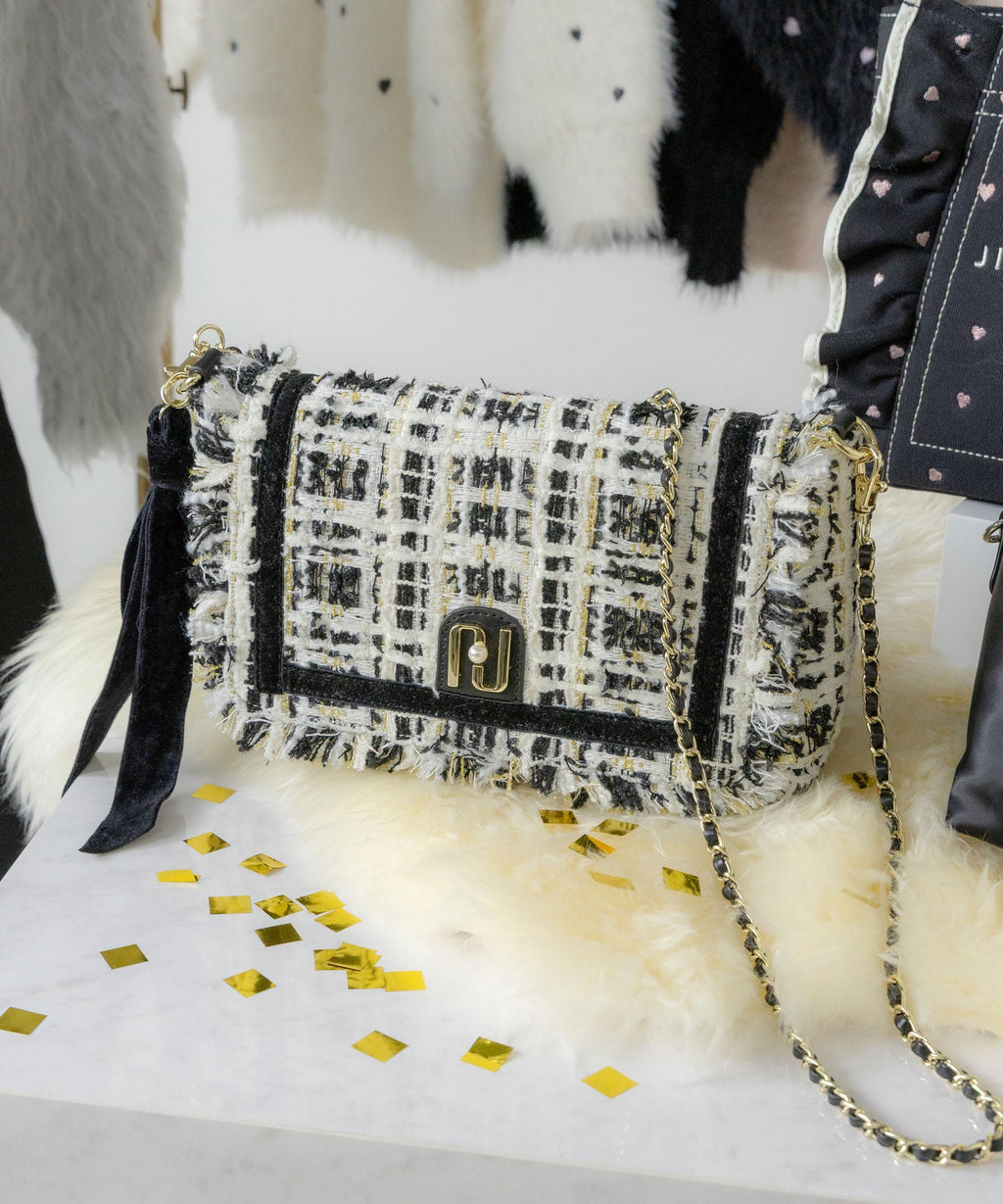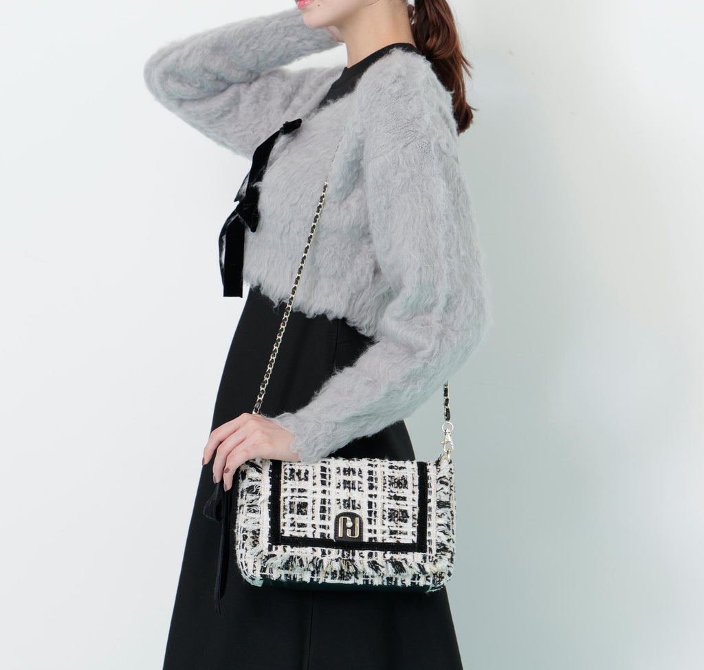 「レディライクなムード漂う上品なツイードバッグ」ざっくりとしたモノトーンミックスカラーのツイードを使用し大人っぽく品のある佇まいです。大きなフラップデザインがクラシカルな印象。フリンジ使いとベルベットの縁取りをアクセントにしています。マグネット仕様のフラップが大きく開くため、荷物の出し入れもしやすいです。ゴールドカラーのチェーンやJモチーフのパーツで高級感のあるバッグは、デイリーも特別な日もおすすめ。ピンクの裏地とハート型のネームがついたスペシャル仕様です。※撮影時照明の関係により、色味が違って見える場合がございます。