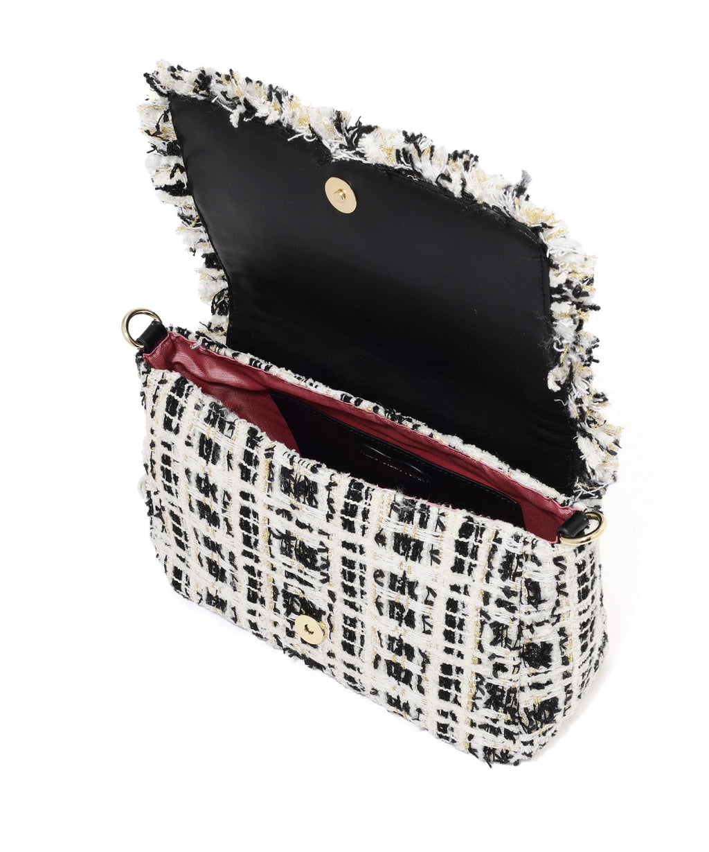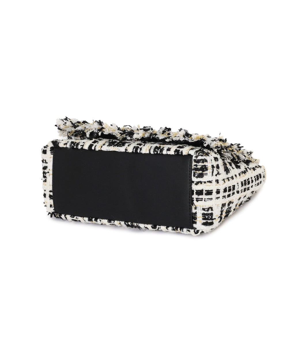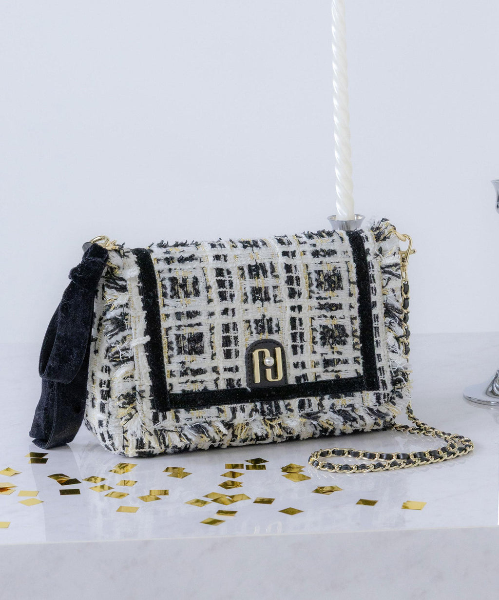 「レディライクなムード漂う上品なツイードバッグ」ざっくりとしたモノトーンミックスカラーのツイードを使用し大人っぽく品のある佇まいです。大きなフラップデザインがクラシカルな印象。フリンジ使いとベルベットの縁取りをアクセントにしています。マグネット仕様のフラップが大きく開くため、荷物の出し入れもしやすいです。ゴールドカラーのチェーンやJモチーフのパーツで高級感のあるバッグは、デイリーも特別な日もおすすめ。ピンクの裏地とハート型のネームがついたスペシャル仕様です。※撮影時照明の関係により、色味が違って見える場合がございます。