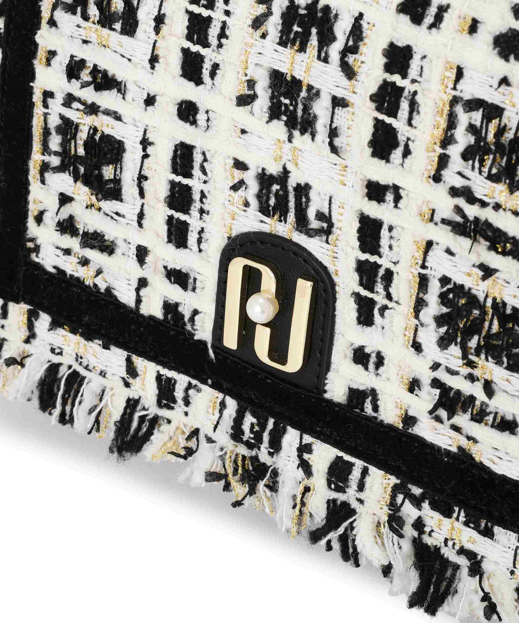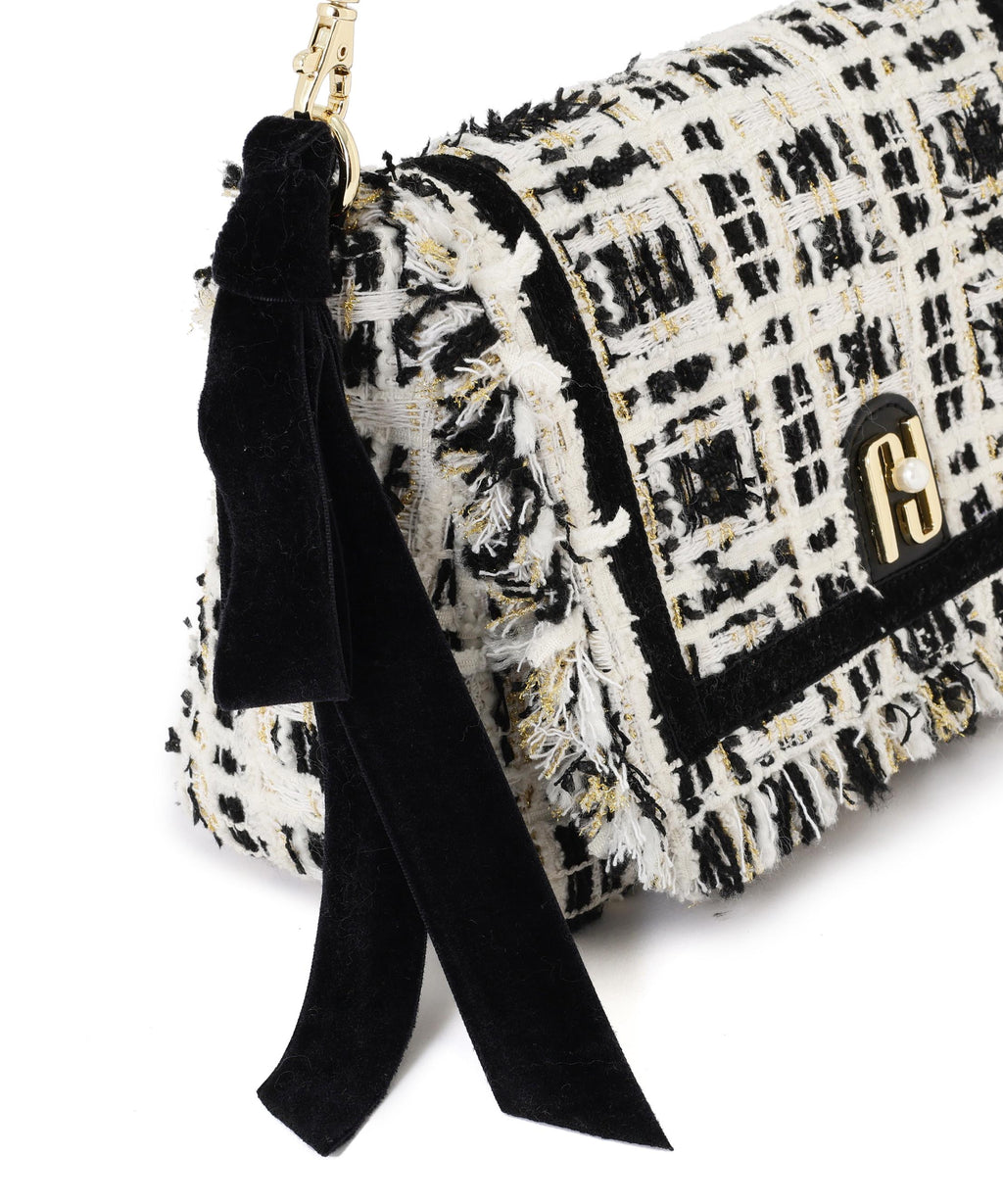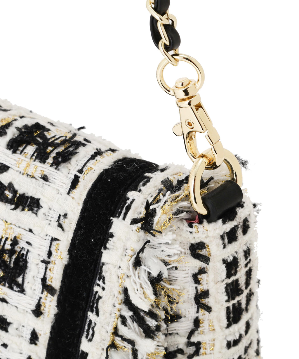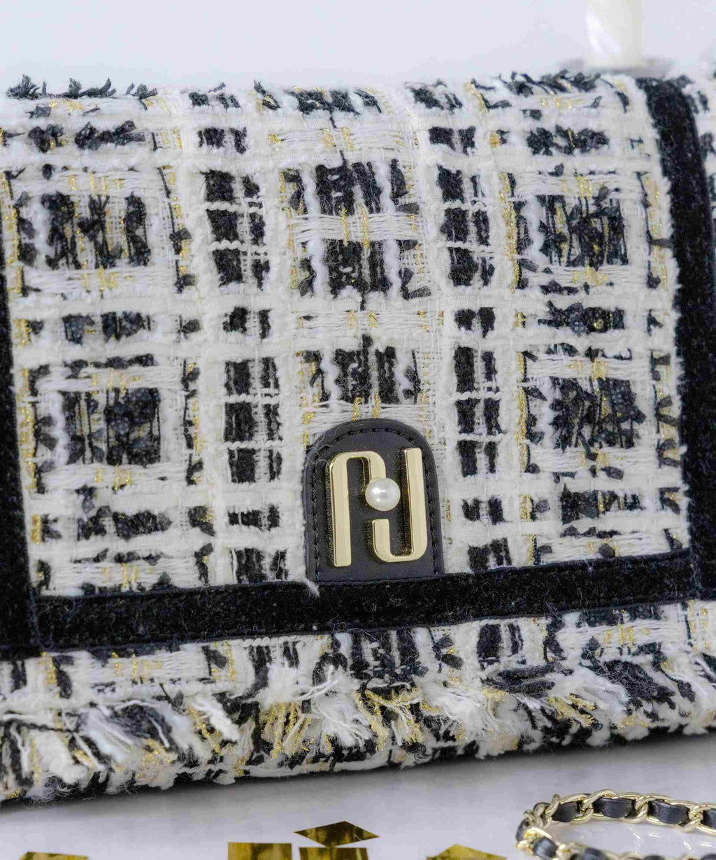 「レディライクなムード漂う上品なツイードバッグ」ざっくりとしたモノトーンミックスカラーのツイードを使用し大人っぽく品のある佇まいです。大きなフラップデザインがクラシカルな印象。フリンジ使いとベルベットの縁取りをアクセントにしています。マグネット仕様のフラップが大きく開くため、荷物の出し入れもしやすいです。ゴールドカラーのチェーンやJモチーフのパーツで高級感のあるバッグは、デイリーも特別な日もおすすめ。ピンクの裏地とハート型のネームがついたスペシャル仕様です。※撮影時照明の関係により、色味が違って見える場合がございます。