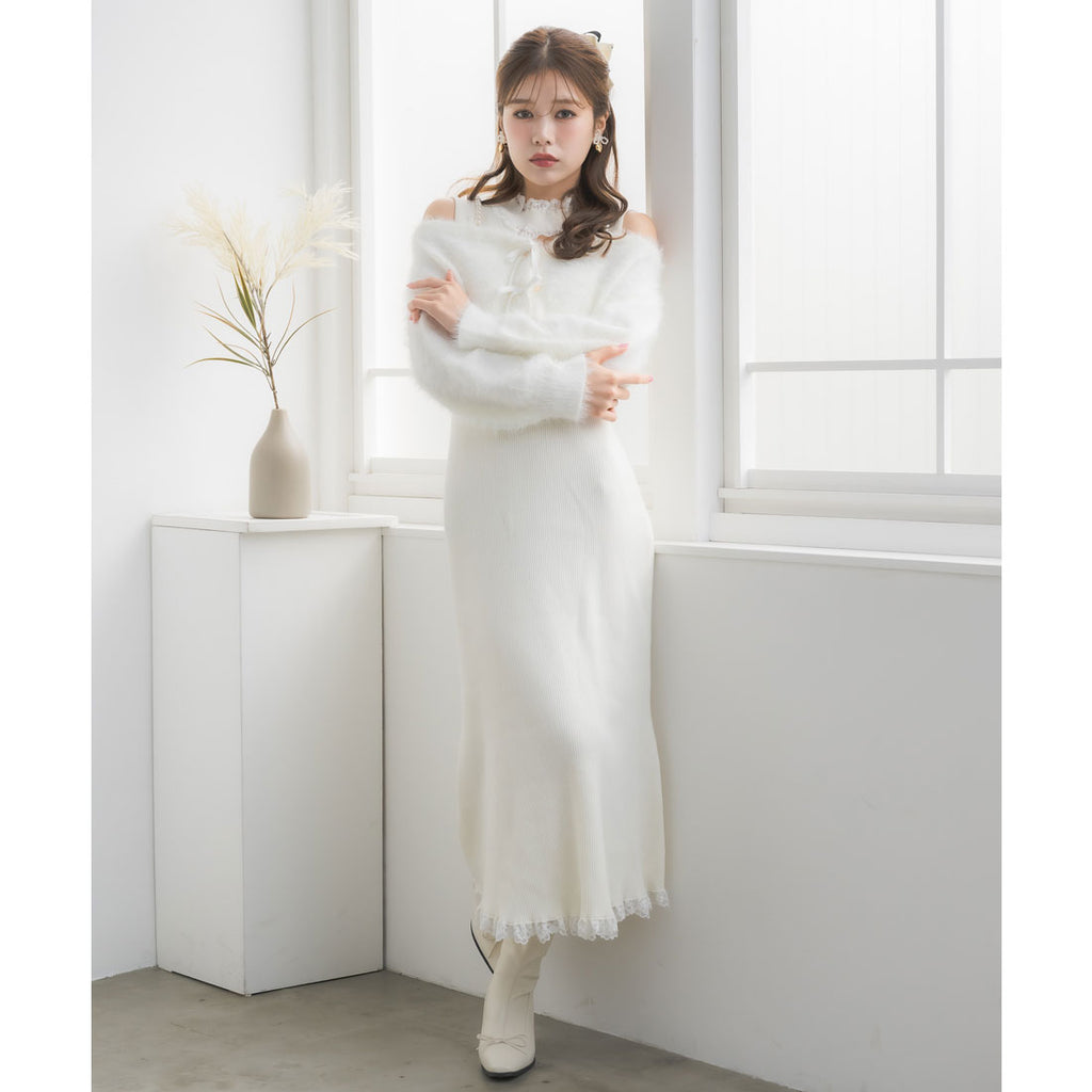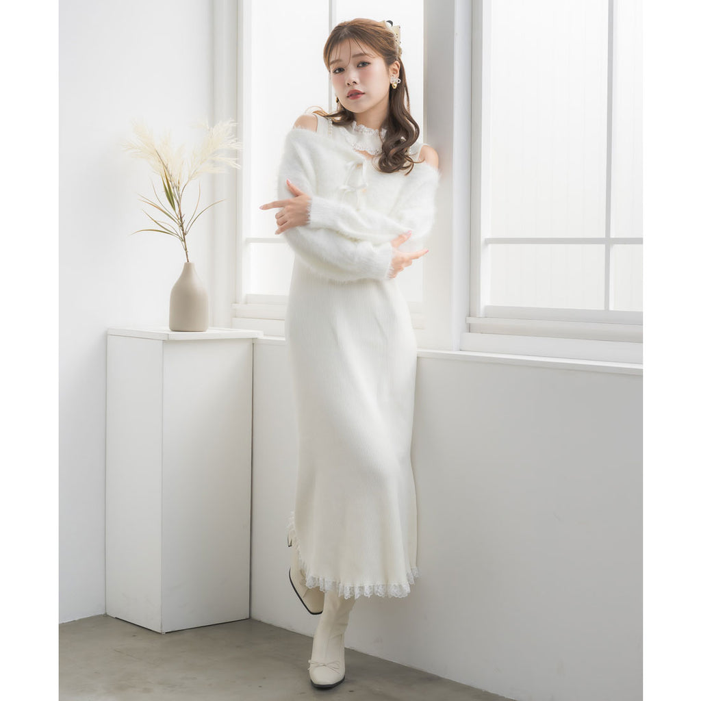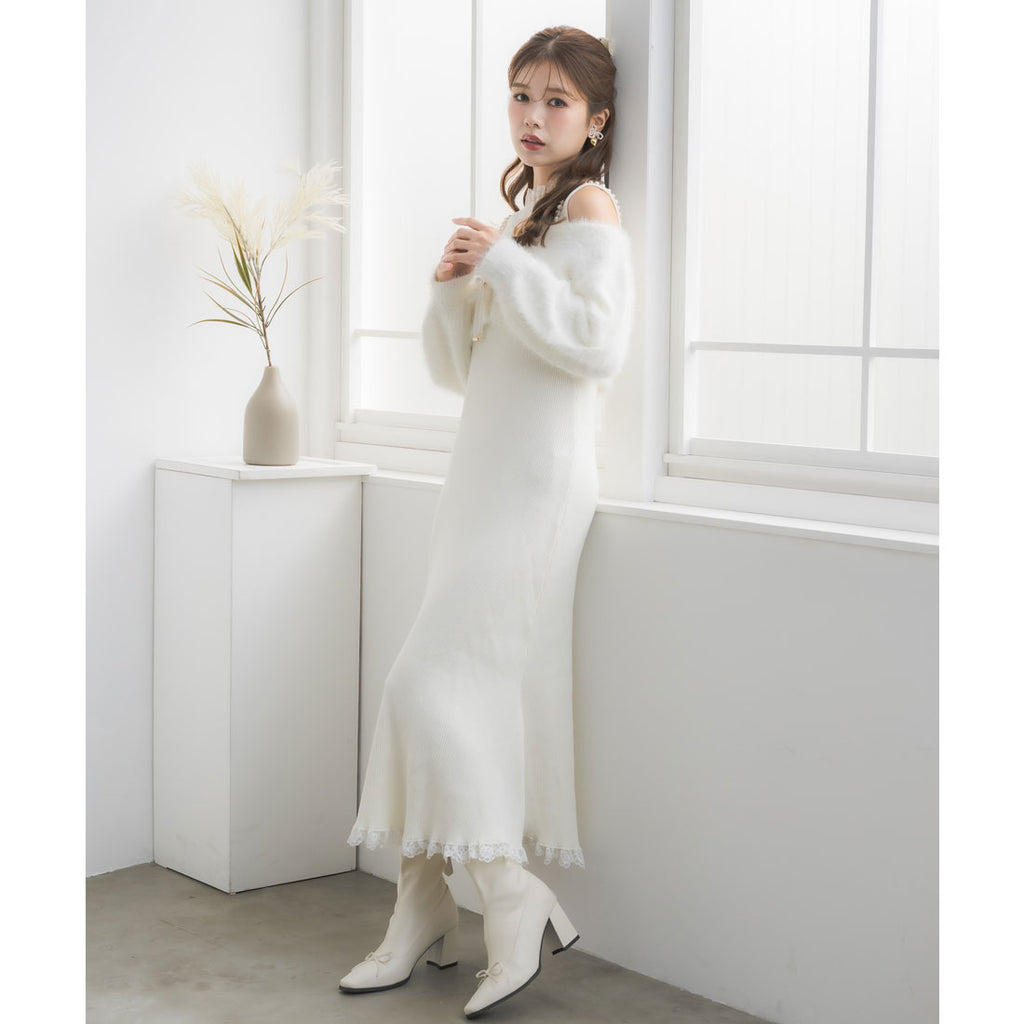タイトなロングワンピースがあざと可愛さ演出し、ふわふわのフェザーニットがつい触りたくなるビジュアルで冬のコーデを盛り上げます♪