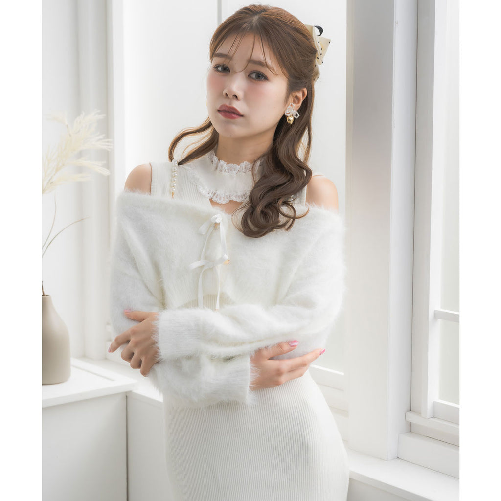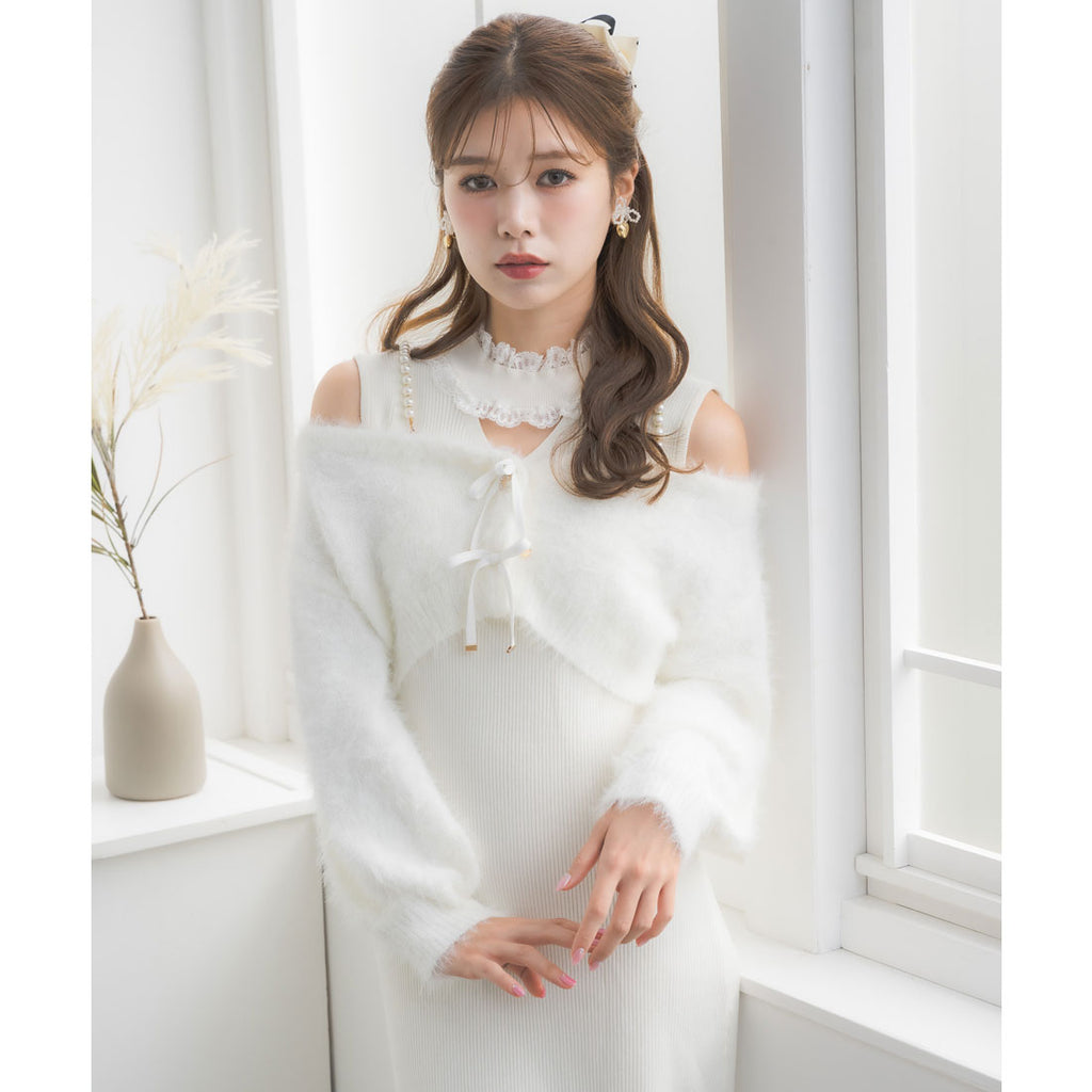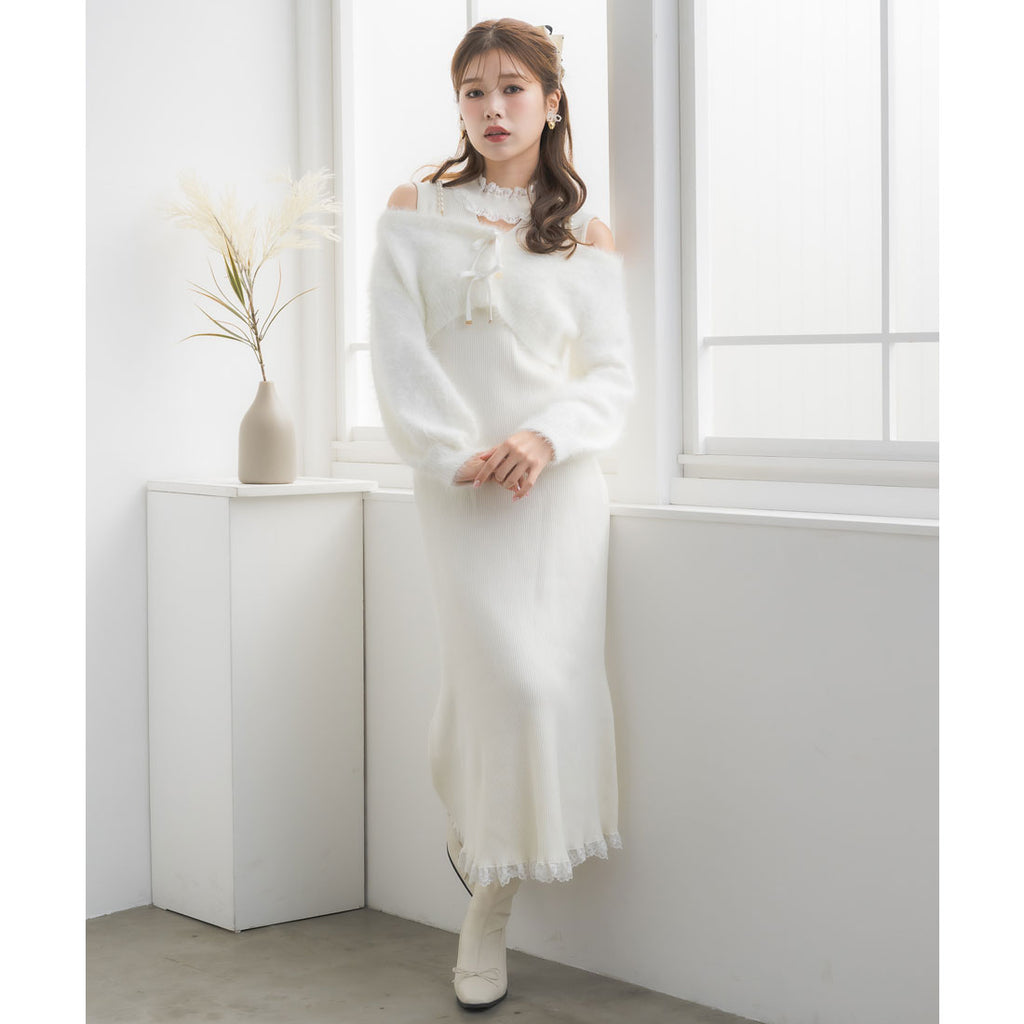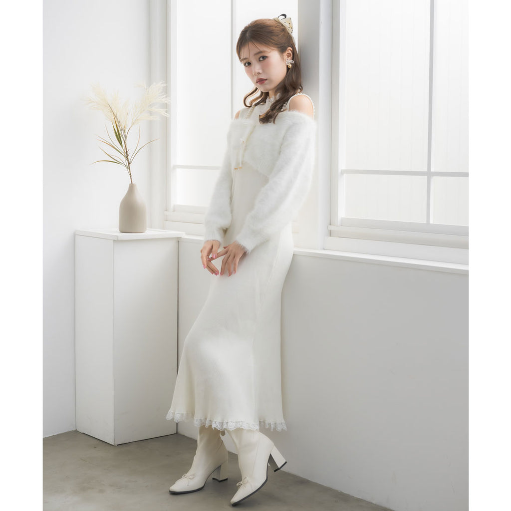 タイトなロングワンピースがあざと可愛さ演出し、ふわふわのフェザーニットがつい触りたくなるビジュアルで冬のコーデを盛り上げます♪