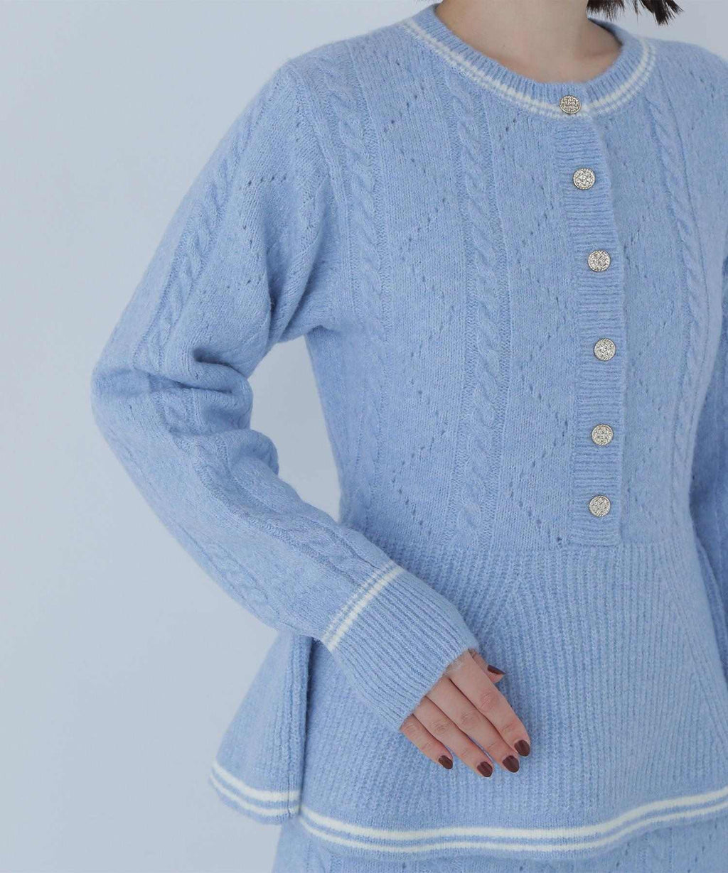 ペプラムシルエット×ケーブル編み×バイカラーの組み合わせで品のある冬スタイリングが叶うSETUP。レトロなボタンをアクセントに、配色ラインが引き締めポイントになっています。単品使いもできるデザインなので着回し力は抜群。スカートは裏地が付いているので安心して着ていただけます。
