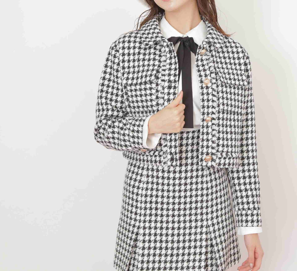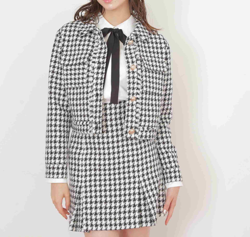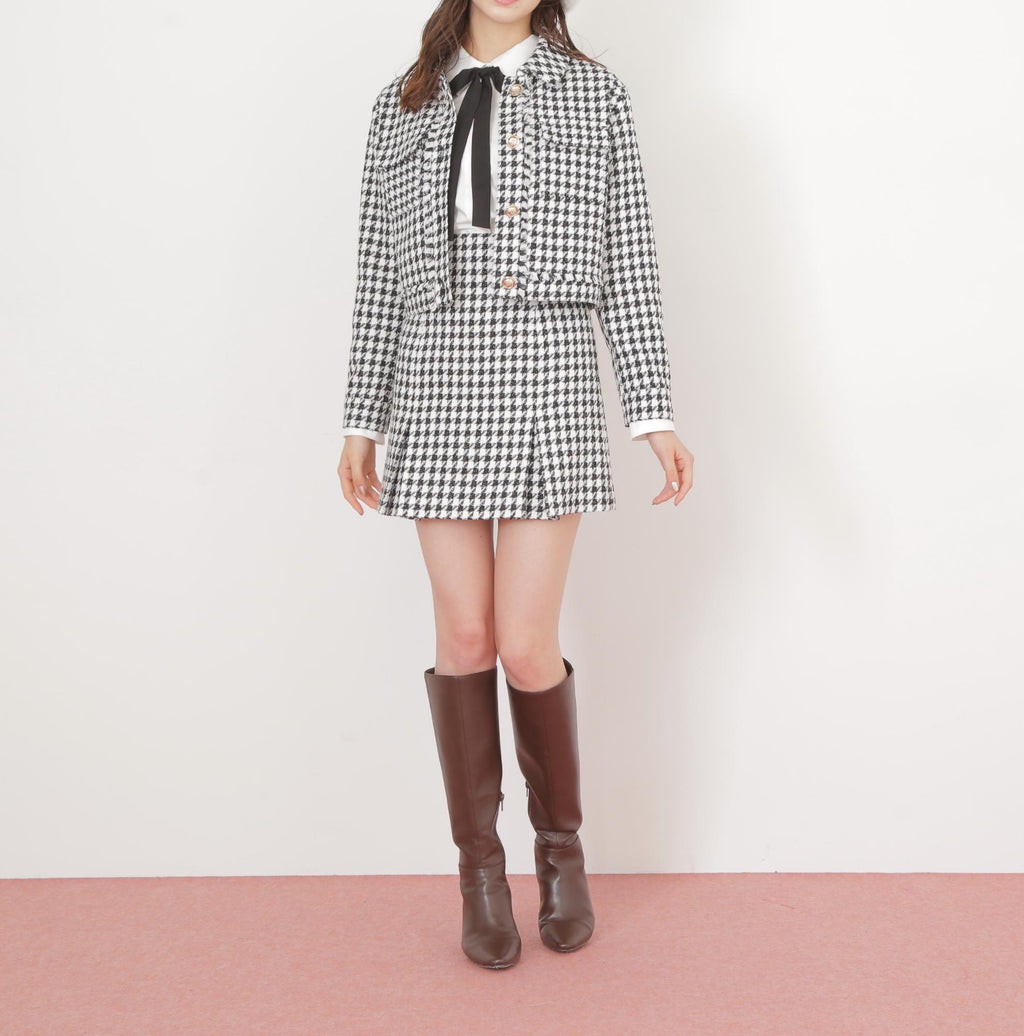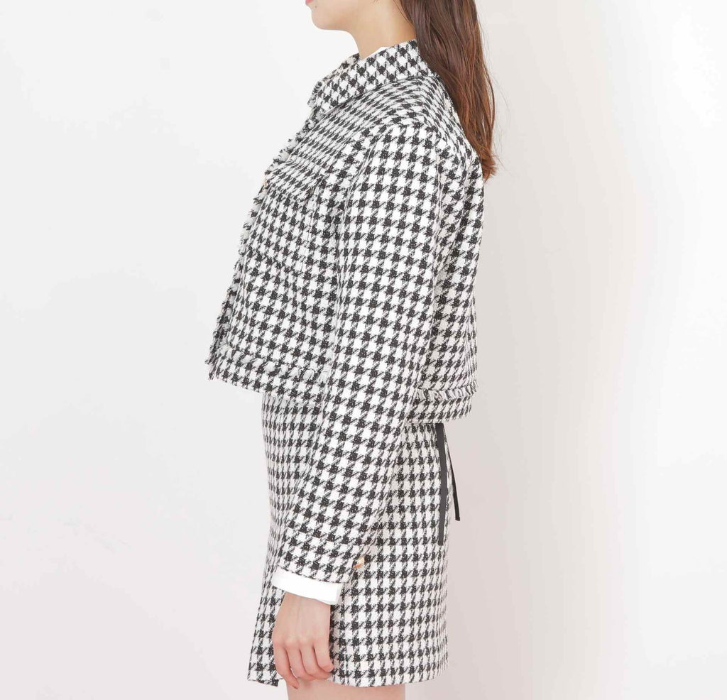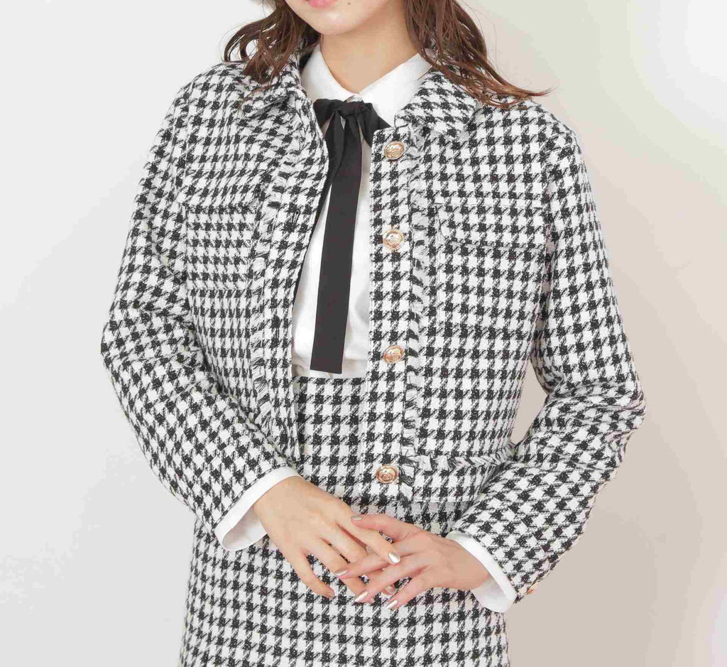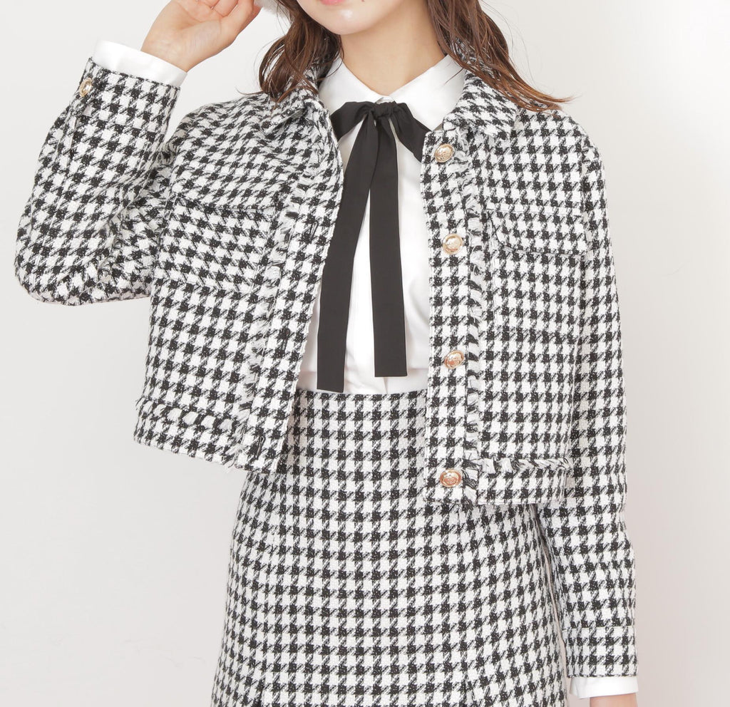 クラシカルな千鳥柄ツイードで仕立てたジャケット。コンパクトなシルエットでスタイルアップ効果を期待できます。ワンピース合わせでお呼ばれスタイルに、デニム合わせでカジュアルMIXスタイルにもおすすめ。オンオフ問わずに着回せる万能アウターです。同素材のミニスカート(店舗商品番号1255220057)もございます。※撮影時照明の関係により、色味が違って見える場合がございます。