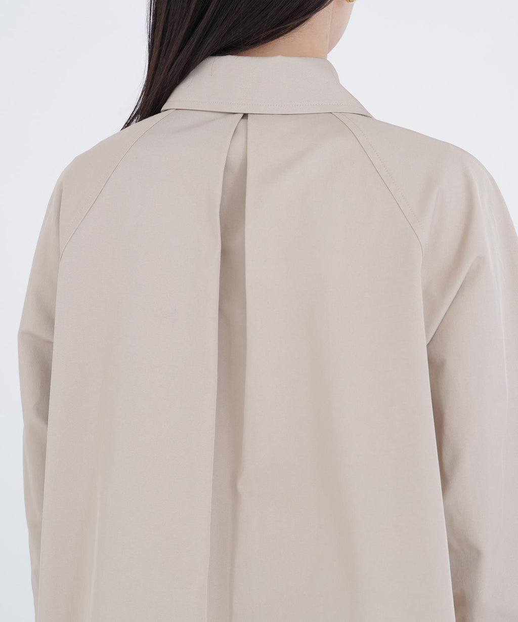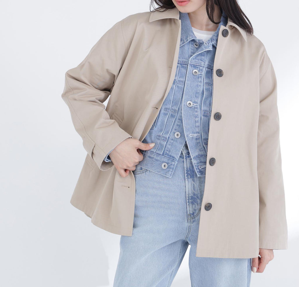 トレンドのステンカラーを取り入れた今季らしいハーフコート。程よい丈感で、パンツにもスカートにも合わせやすいバランスです。フロントには配色マーブルボタンをあしらい、シンプルな中にさりげないアクセントをプラス。裾にかけて広がるテントラインシルエットが、軽やかで女性らしい可愛さを演出します。