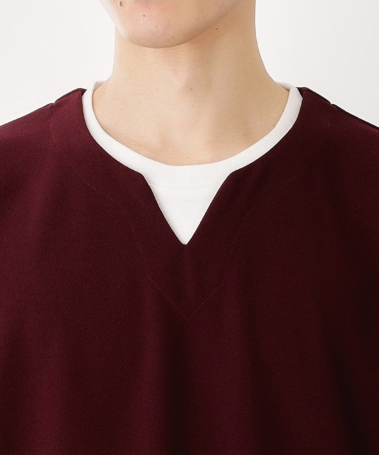 ツイル素材を使用した、きれい目なキーネックデザインの半袖プルオーバー。