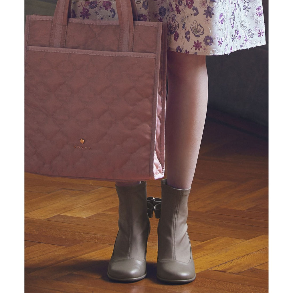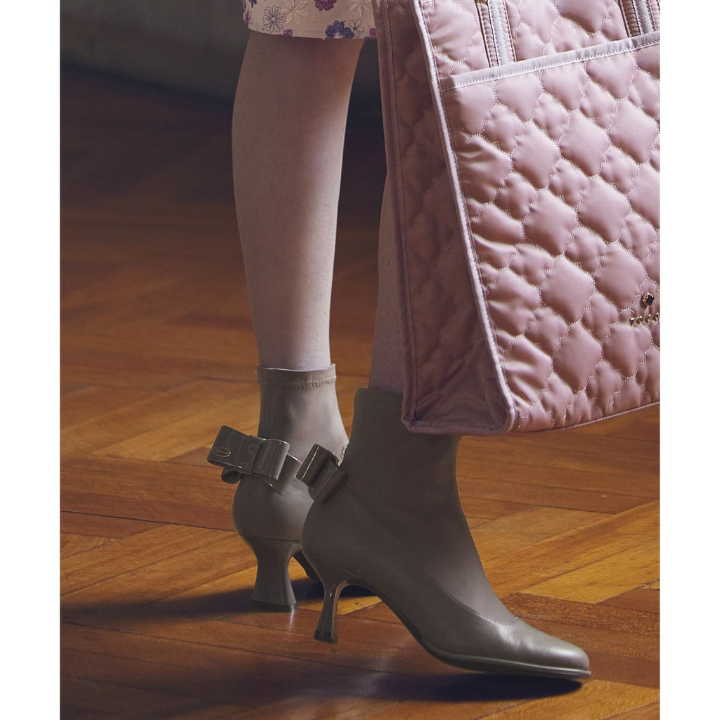 ほどよくフィットするストレッチタイプの筒周り、エレガントで安定感のあるヒール、バックポイントのリボンディテール。さりげなくフェミニン&エレガント見えするデザインにこだわった、まるでパンプスのようなショートブーツ。ボリューム感が出過ぎないのでどんなスタイリングともバランスが取れ、ドレスはもちろんパンツコーディネートのほんのり甘めなアクセントにもおすすめです。