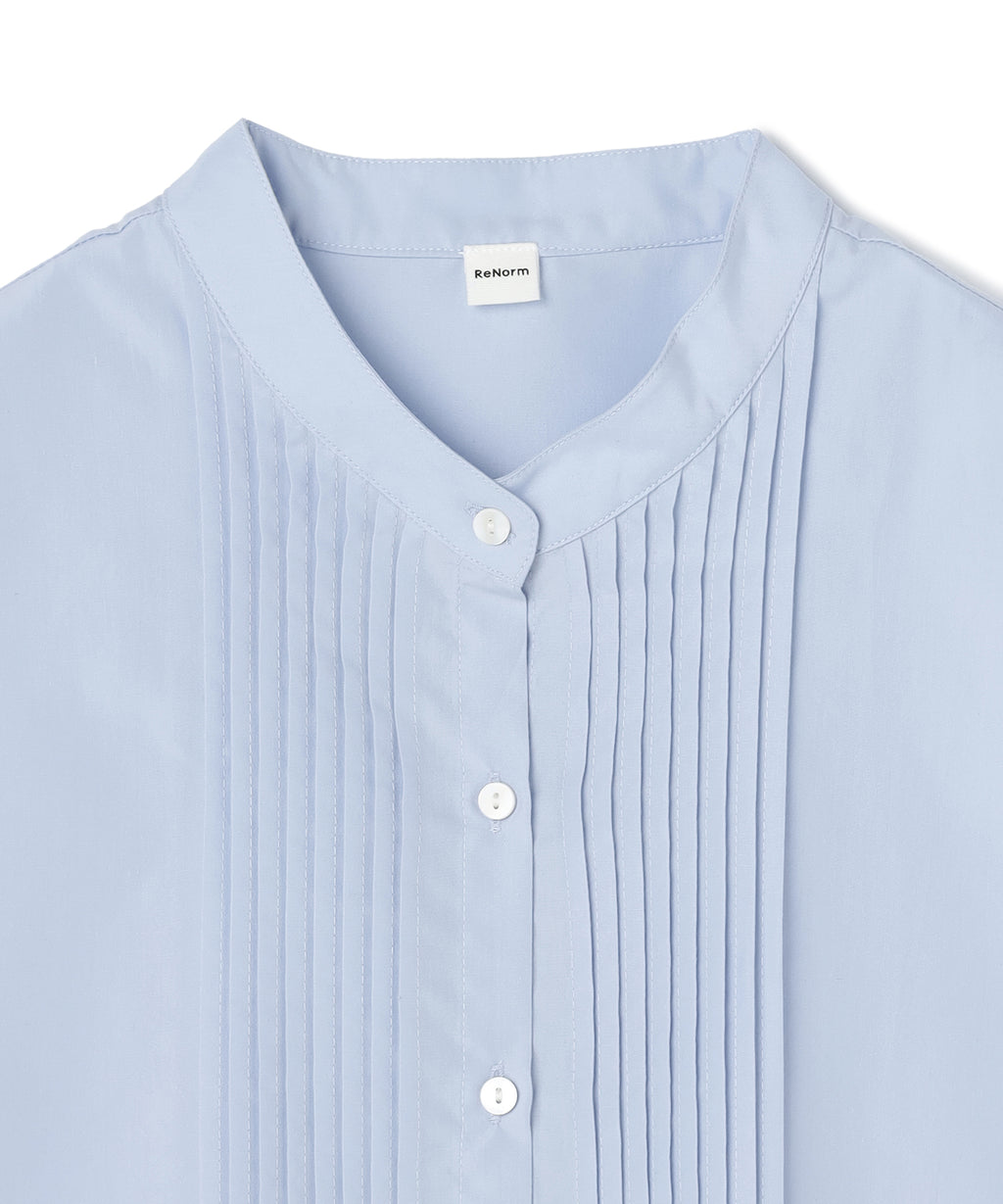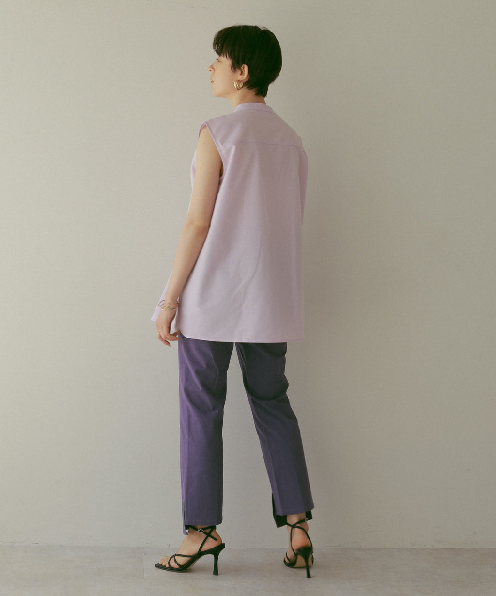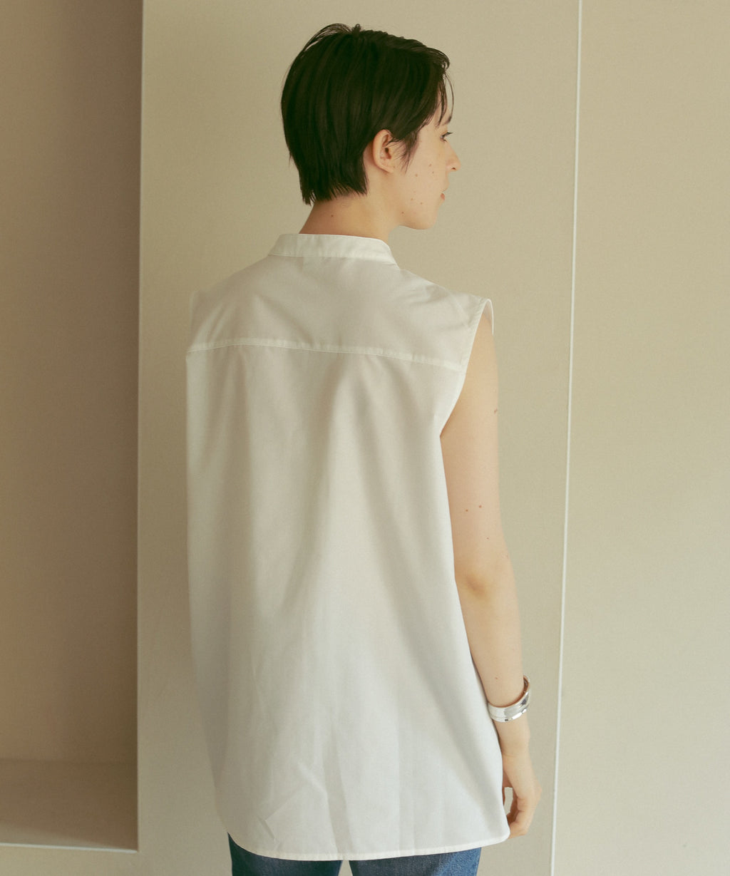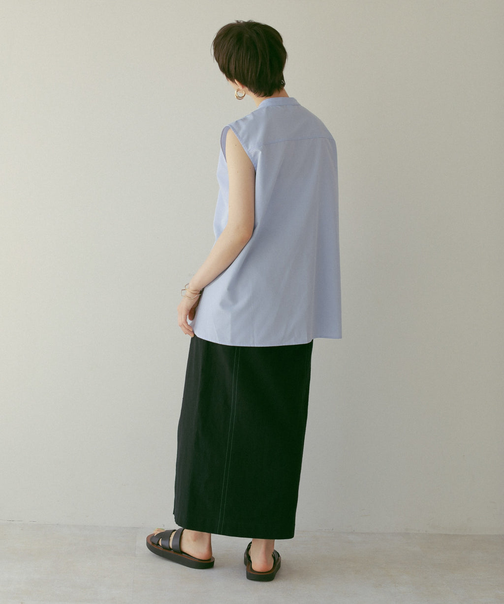 バンドカラーが首回りをすっきりと見せてくれます。カジュアルにデニムからカラーパンツまで相性抜群です。細身のボトムですっきりと合わせるのがオススメです。