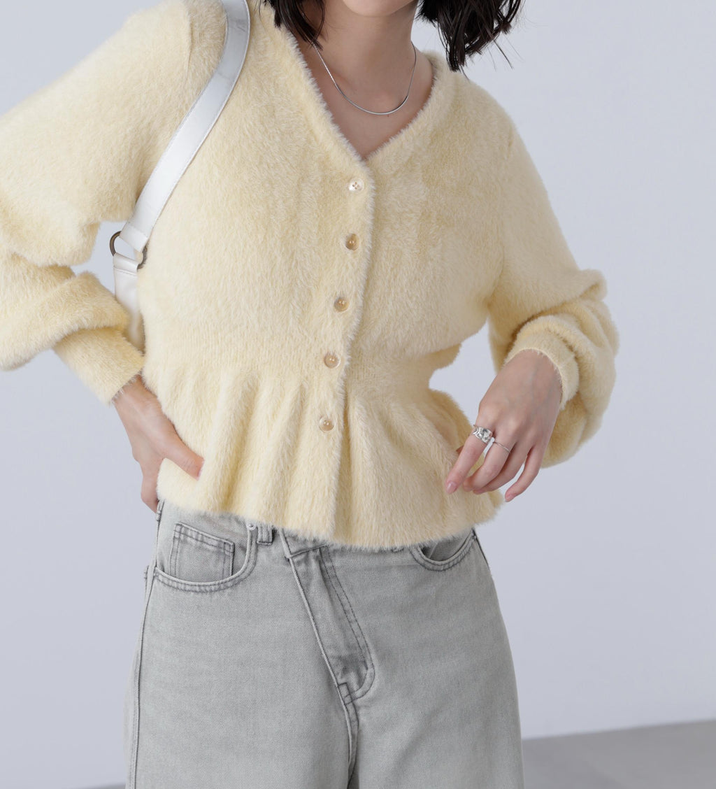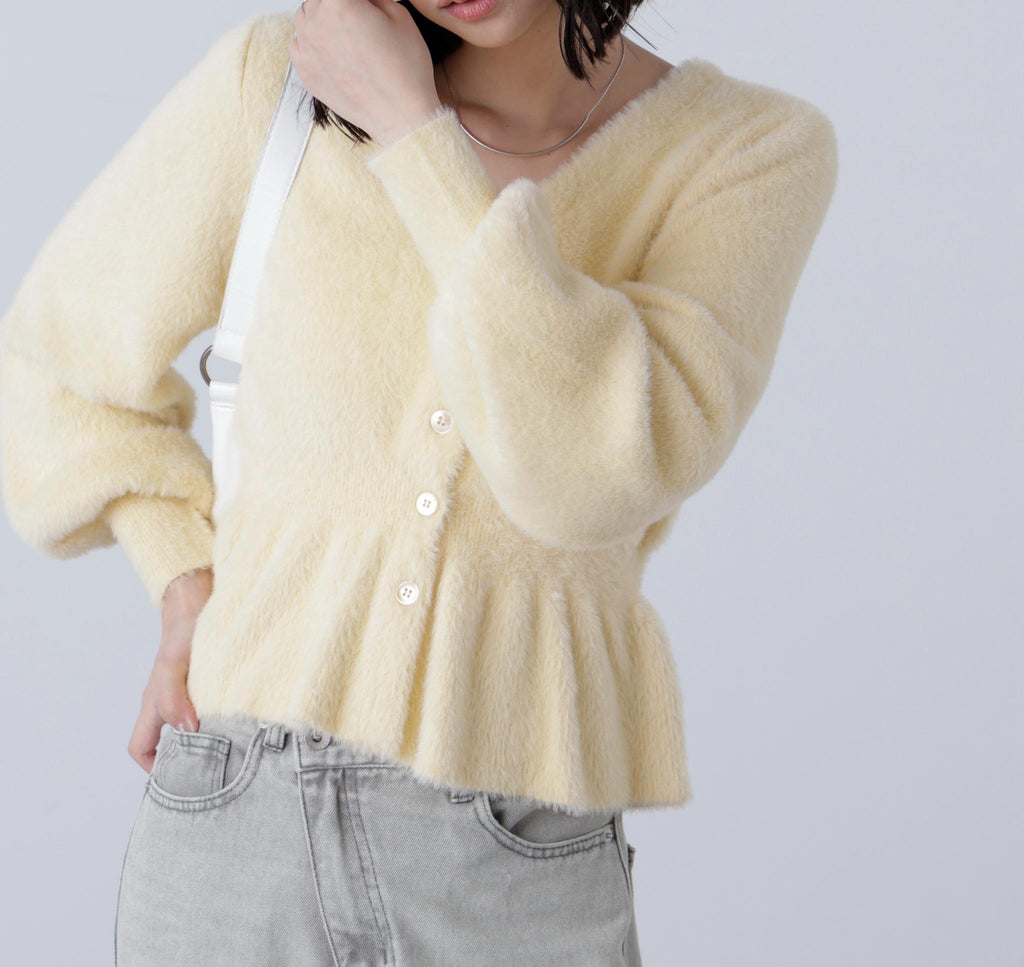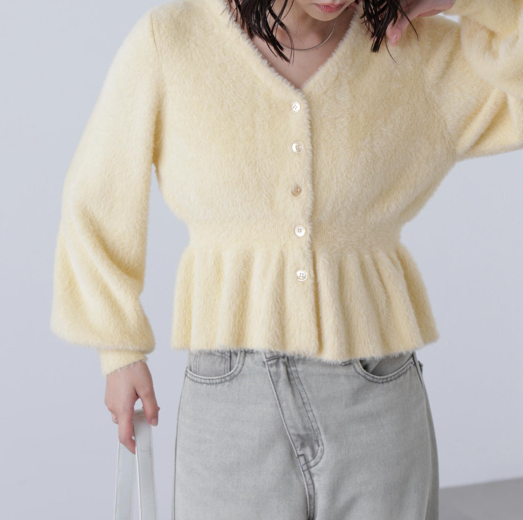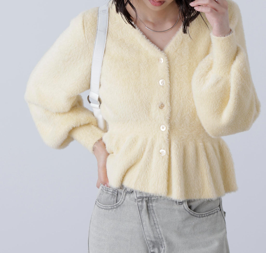 毎年ご好評のカーディガンが今年も登場!トップスとしても羽織りとしても使える、軽やかな着心地のシャギーニットカーディガン。毛足が短く肌に触れてもチクチクしにくい素材を使用、柔らかく滑らかなタッチの糸で仕上げました。シャギーの毛は抜けにくく、しっかりと目が詰まっています。ウエストをリブ編みにしてシェイプさせ、裾はペプラムにすることでスタイルアップを叶えるシルエット。袖口にはギャザーを寄せてボリュームスリーブになっています。1枚でニットプルオーバーのようにも、インナーにブラウスやハイネックトップスを合わせたり、前開きにしてワンピースなどの羽織りにも着回せます。