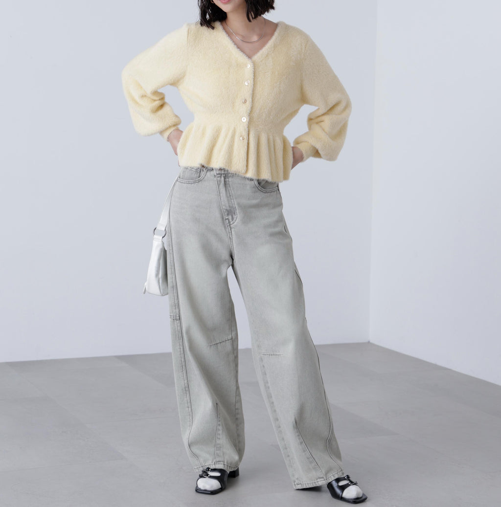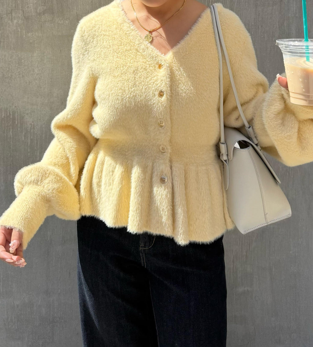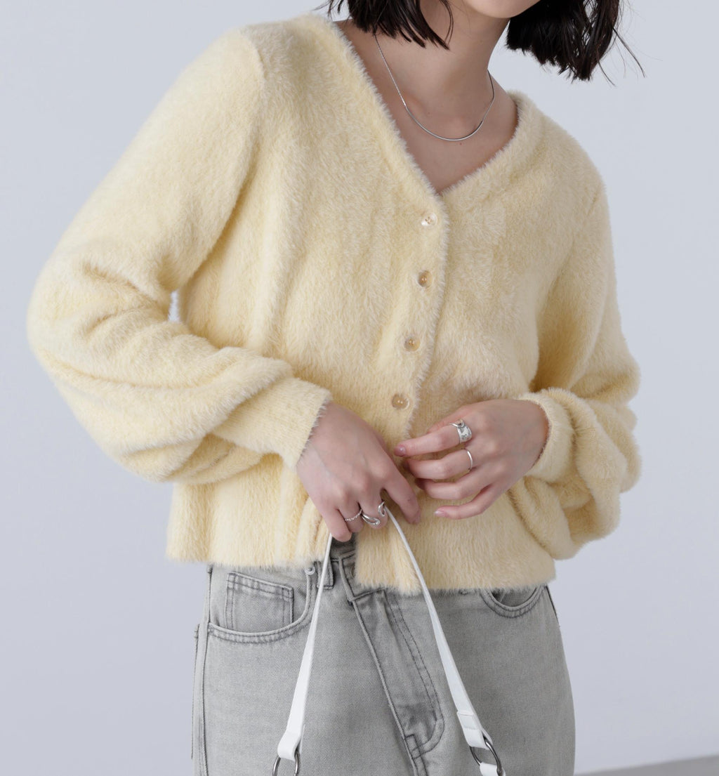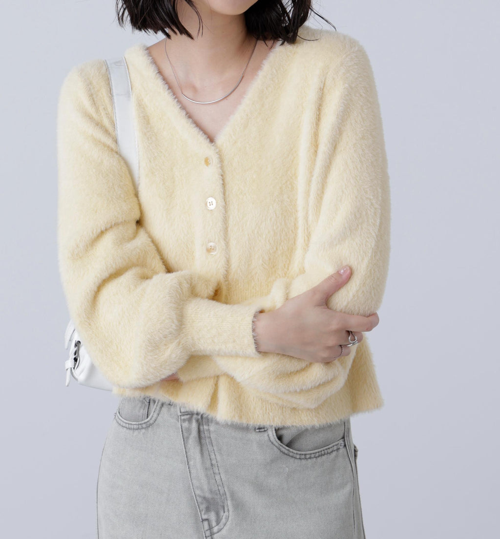 毎年ご好評のカーディガンが今年も登場!トップスとしても羽織りとしても使える、軽やかな着心地のシャギーニットカーディガン。毛足が短く肌に触れてもチクチクしにくい素材を使用、柔らかく滑らかなタッチの糸で仕上げました。シャギーの毛は抜けにくく、しっかりと目が詰まっています。ウエストをリブ編みにしてシェイプさせ、裾はペプラムにすることでスタイルアップを叶えるシルエット。袖口にはギャザーを寄せてボリュームスリーブになっています。1枚でニットプルオーバーのようにも、インナーにブラウスやハイネックトップスを合わせたり、前開きにしてワンピースなどの羽織りにも着回せます。