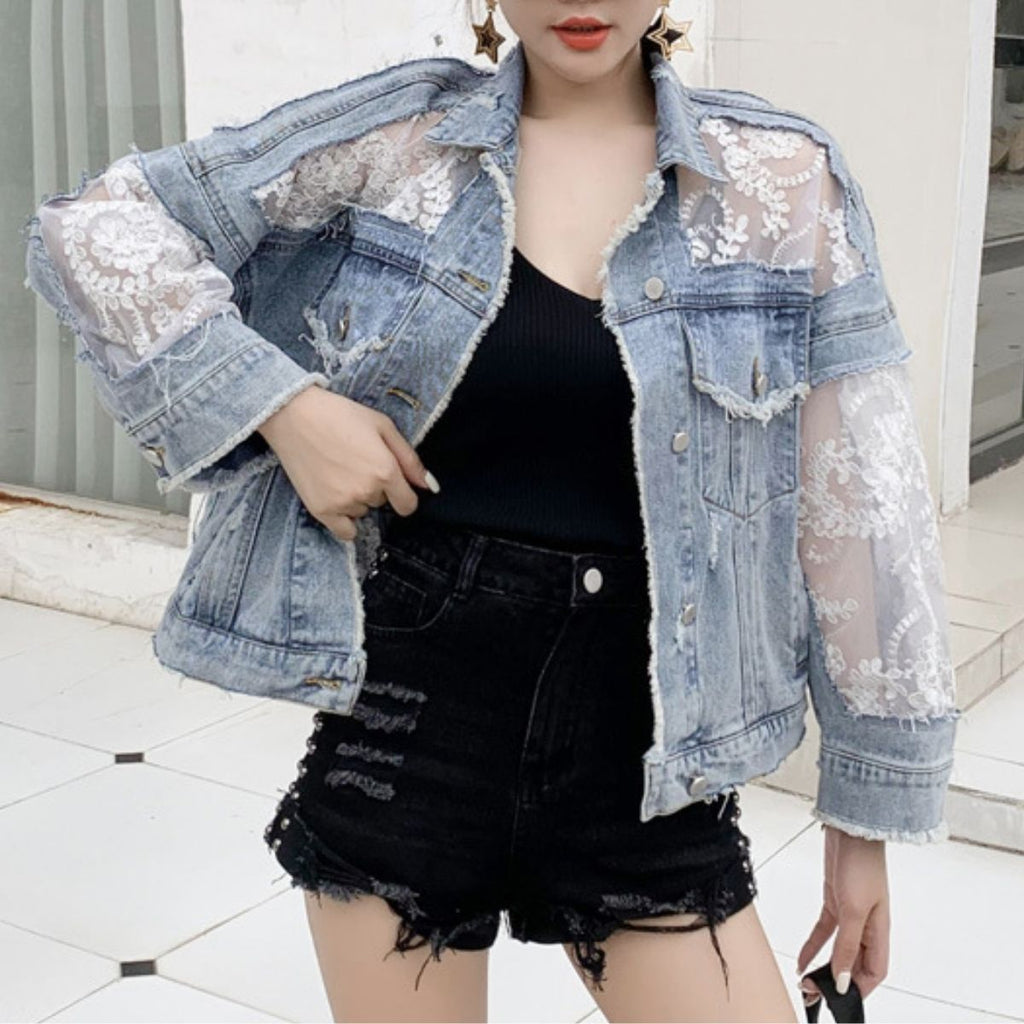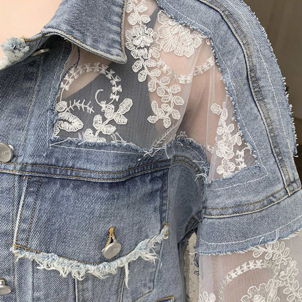 ベルシー Belle Cie デニムジャケット Gジャン 羽織り レース 切替 ビンテージ 春秋 レディース 韓国ファッション 甘辛ミックス レース切替 個性派 透け袖 異素材