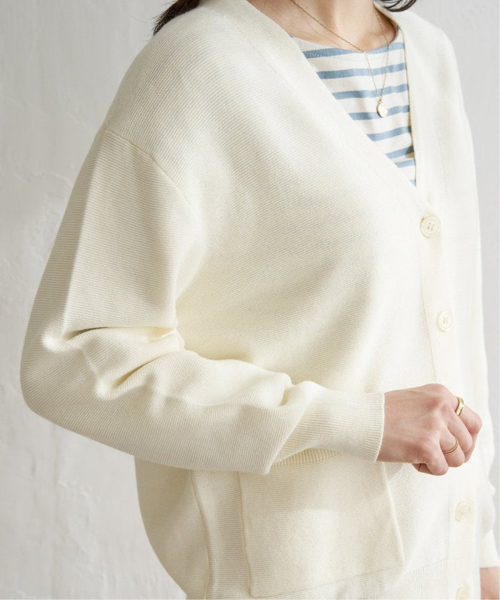 スッキリと見えるVネックにポケットを付け、利便性があり羽織った時にカジュアル感がプラスされます。
