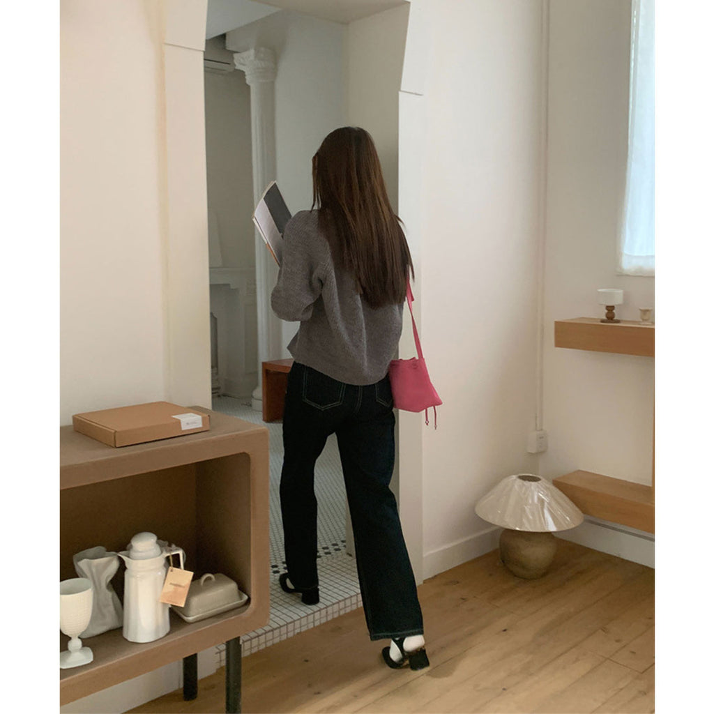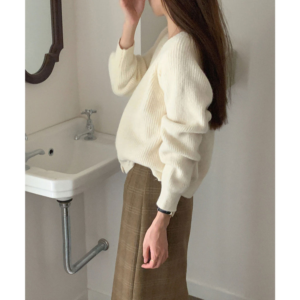 カーディガンは深めのVネックで、ボタンを留めても開けてもこなれた雰囲気に。