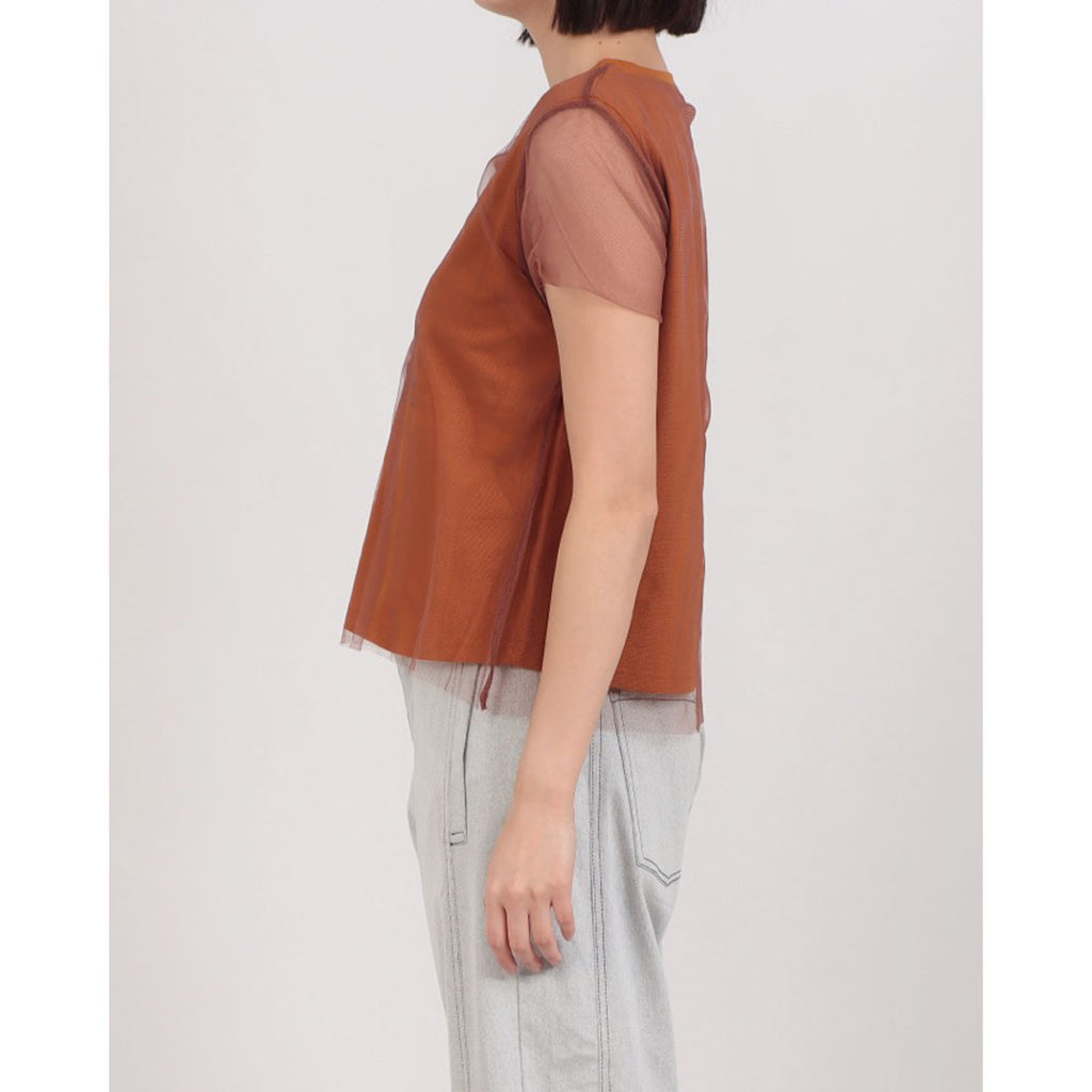 チュールを重ねたデザインが印象的なレイヤード風Tシャツ。
