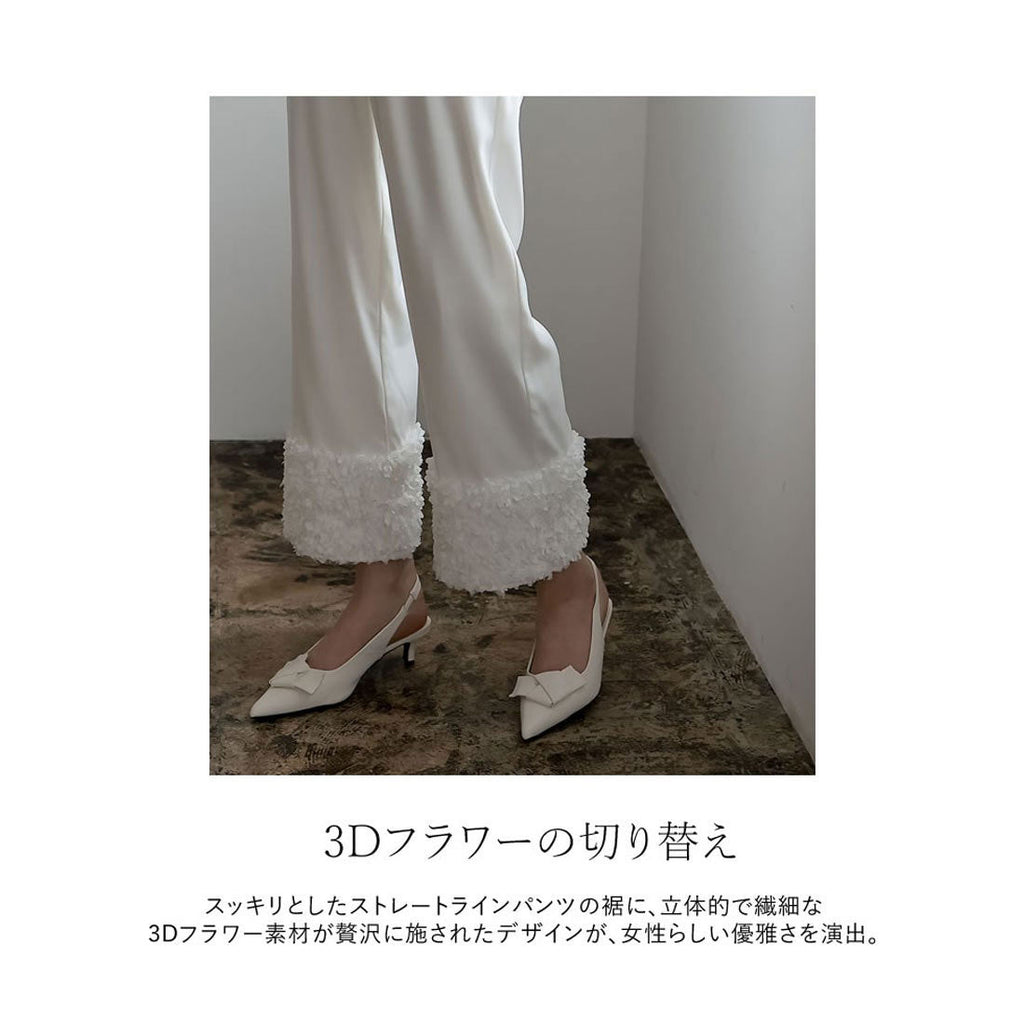 すっきりとしたストレートラインパンツの裾に、立体的で繊細な3Dフラワー素材が贅沢に施されたデザインが、女性らしい優雅さを演出してくれます。