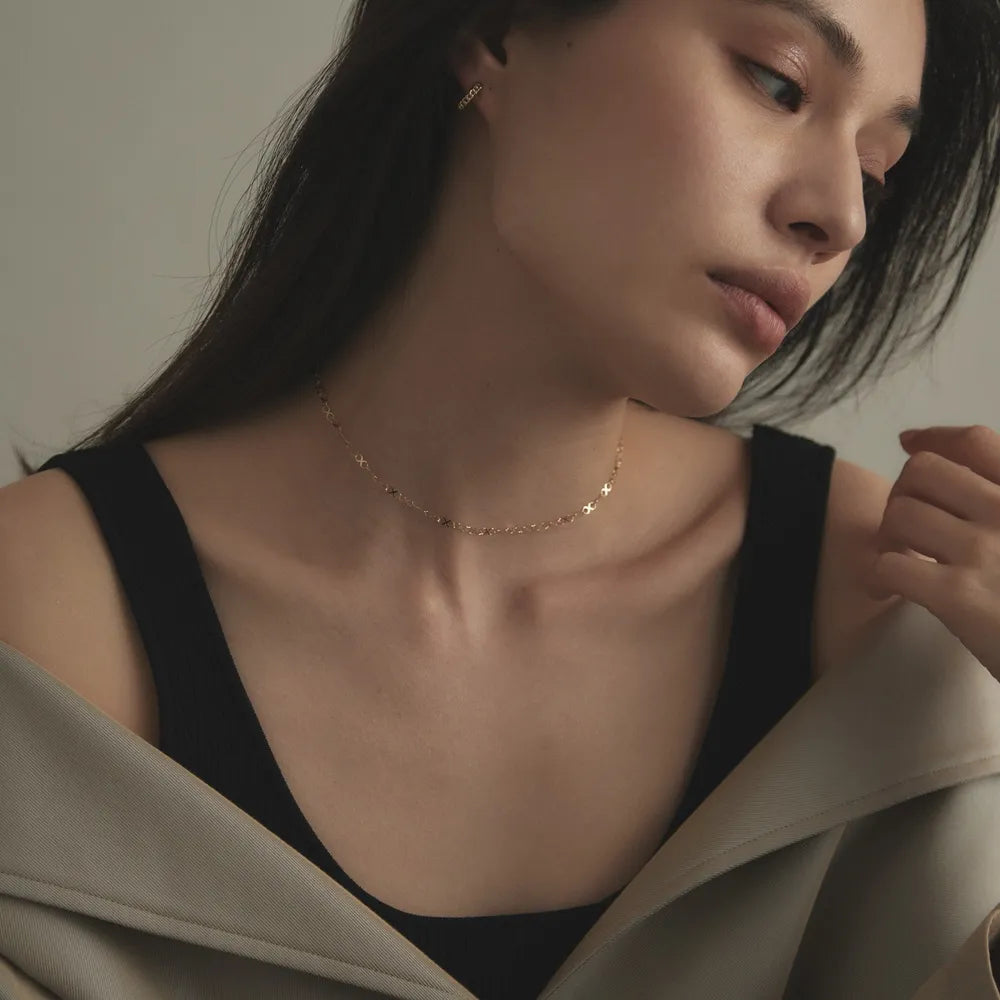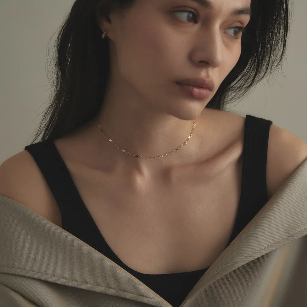トレンドのチョーカーは、チェーンタイプなら首にフィットしやすく手軽に取り入れられそう。