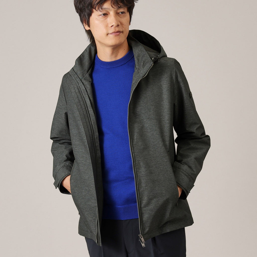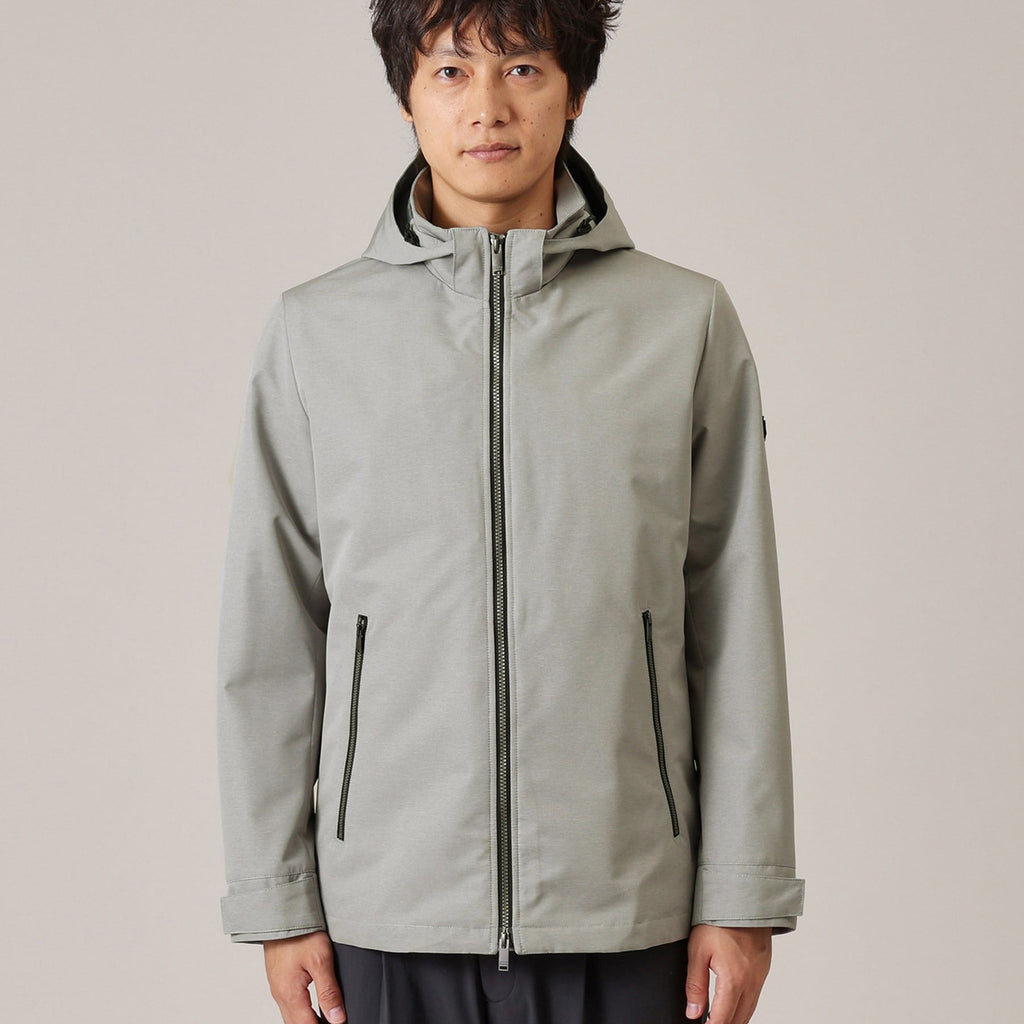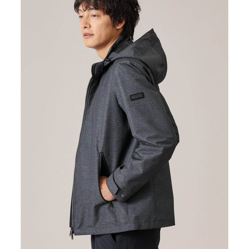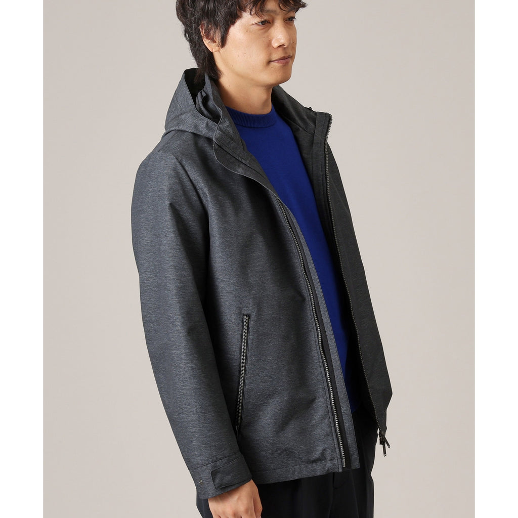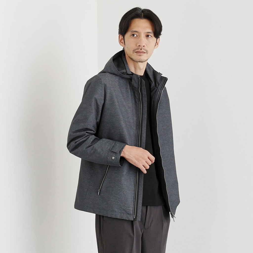 特殊染めによる特徴的なメランジ感のポリエステル素材に撥水加工を施したオリジナルファブリックを使用したフードの着脱が可能なブルゾンです。