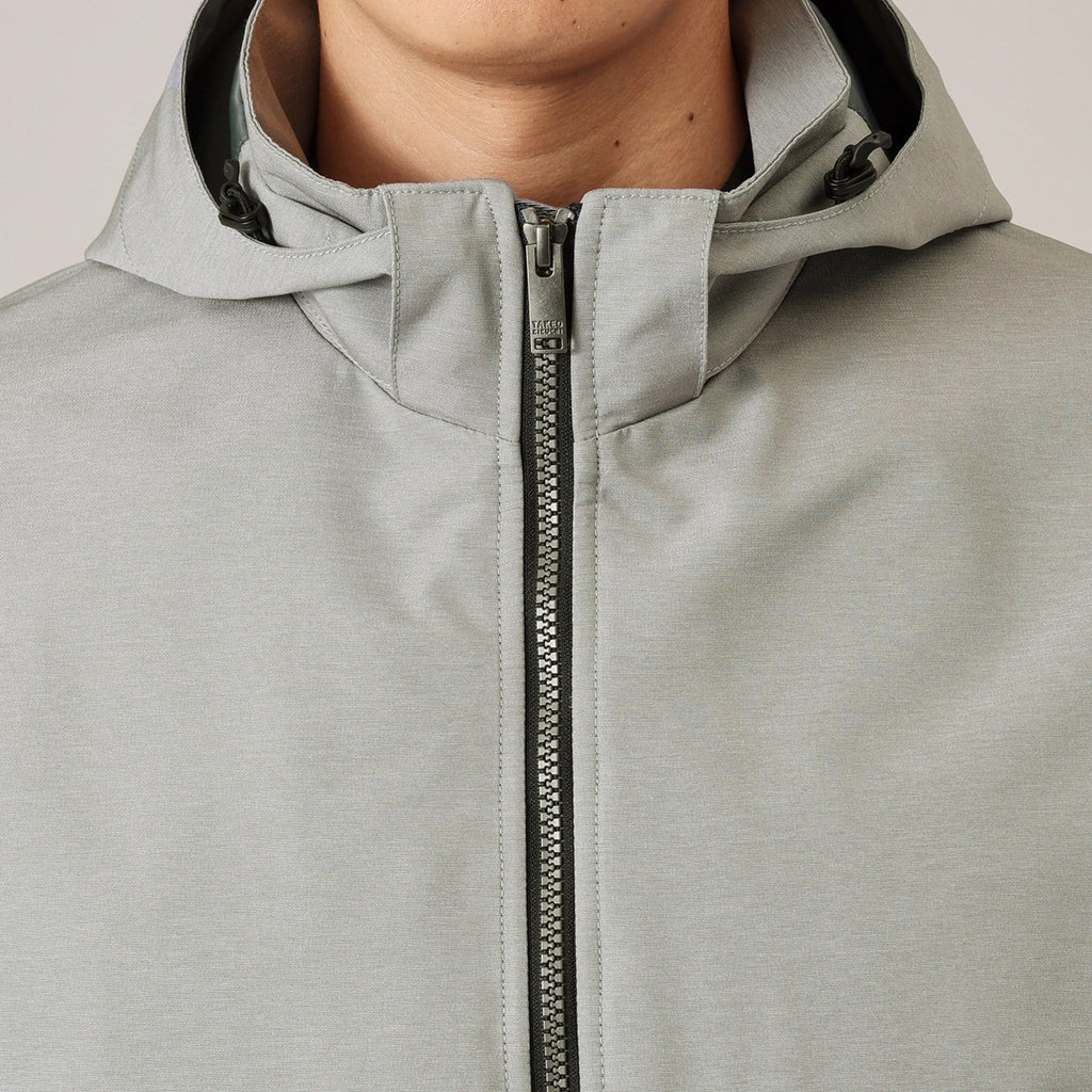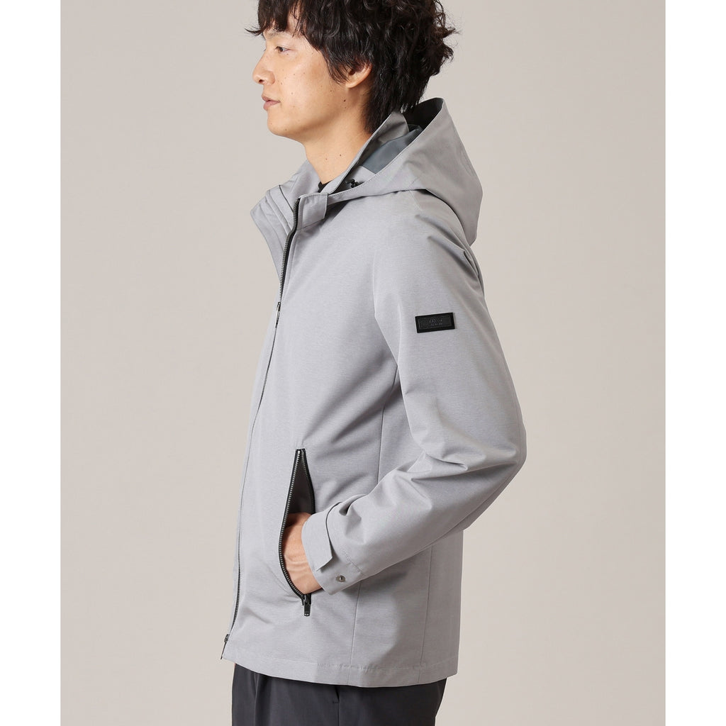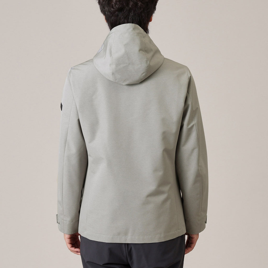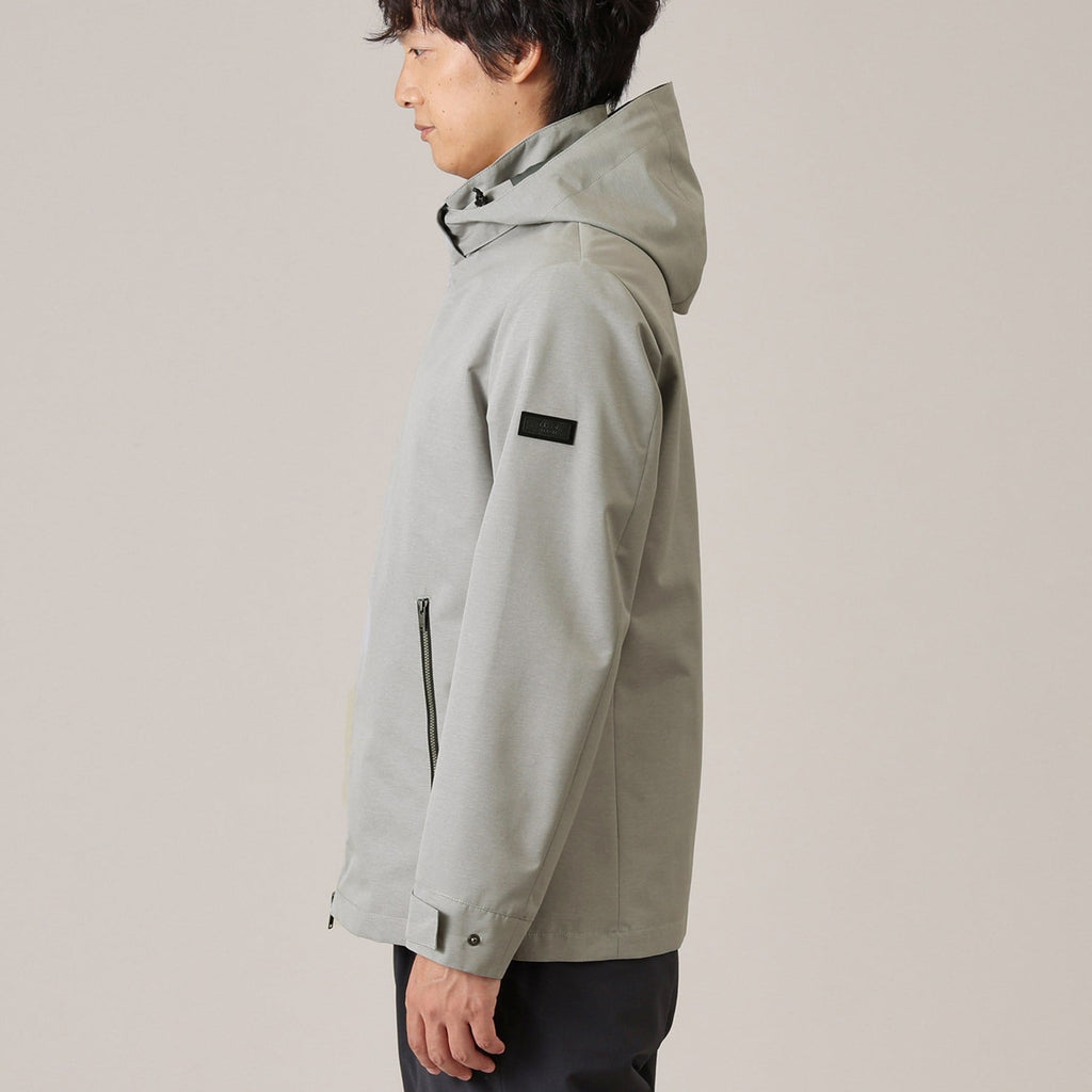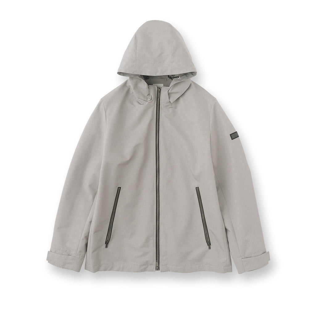 特殊染めによる特徴的なメランジ感のポリエステル素材に撥水加工を施したオリジナルファブリックを使用したフードの着脱が可能なブルゾンです。