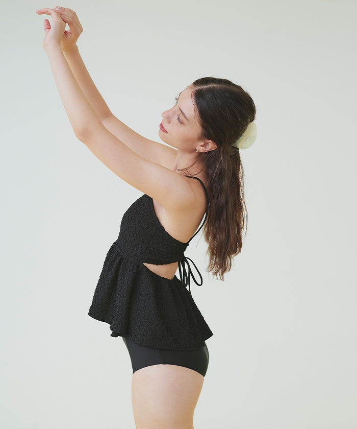 ・立体感のある素材が高級感あふれる大人可愛いペプラムデザインビキニ。
