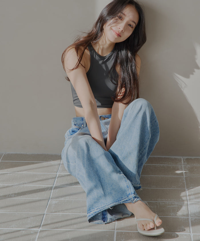 ・タンクトップとハイウエストショーツのこだわりの丈感でバランス良く着用できるのがポイント◎