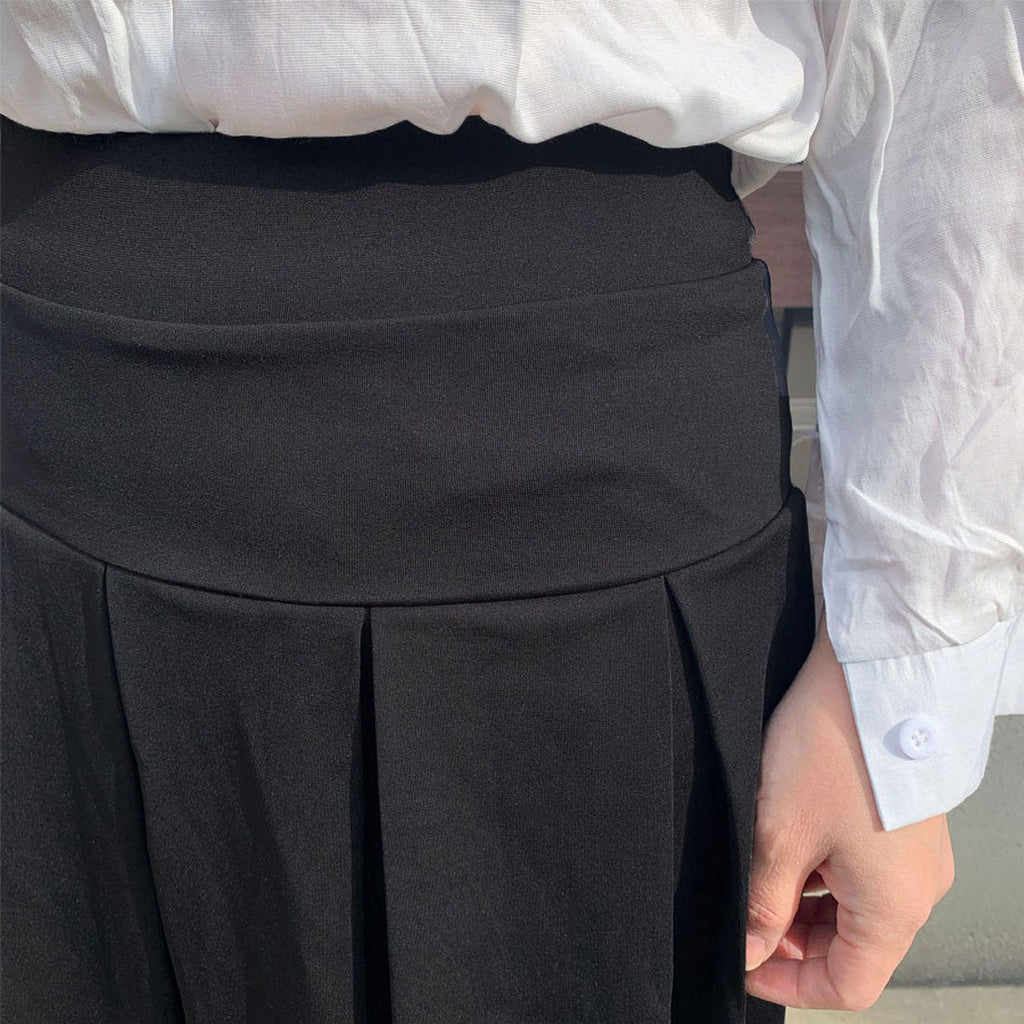 フレアデザインのaラインシルエットが足を長く細く見せてくれる。