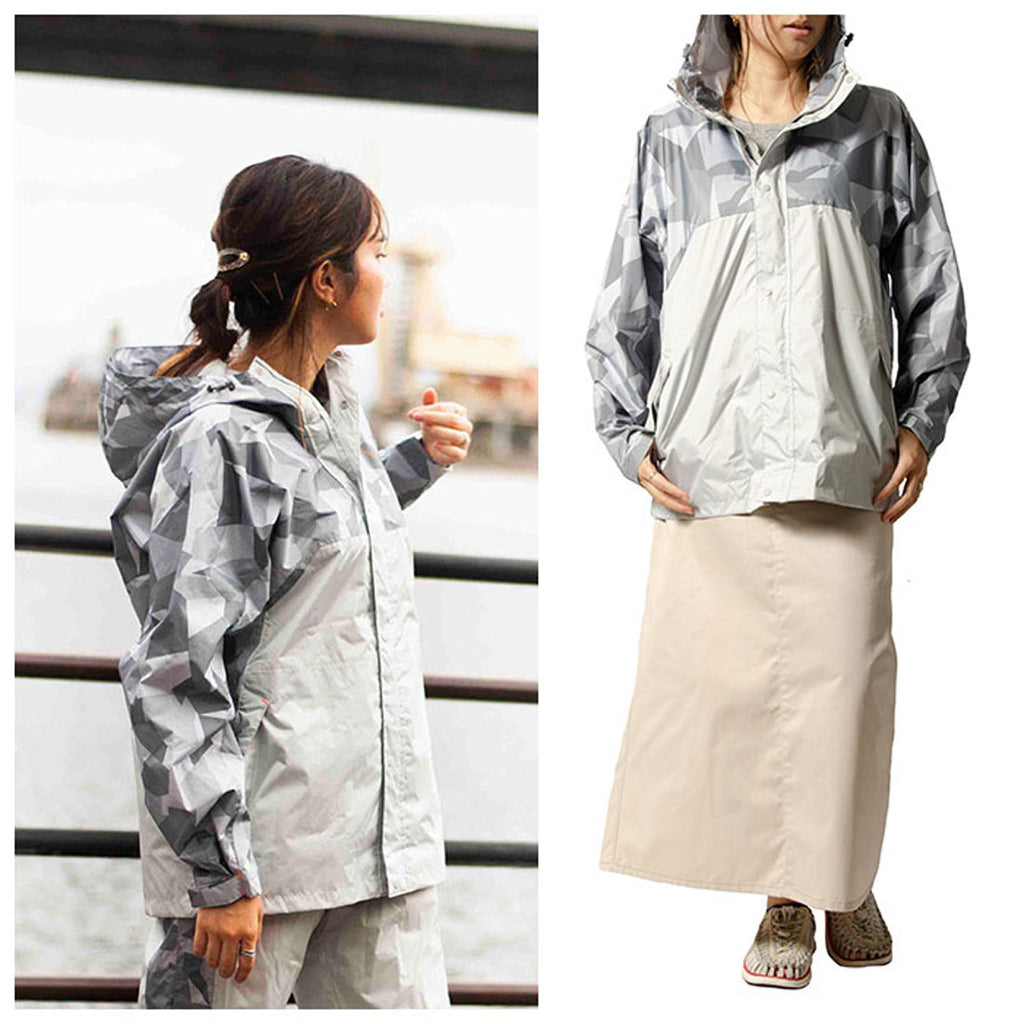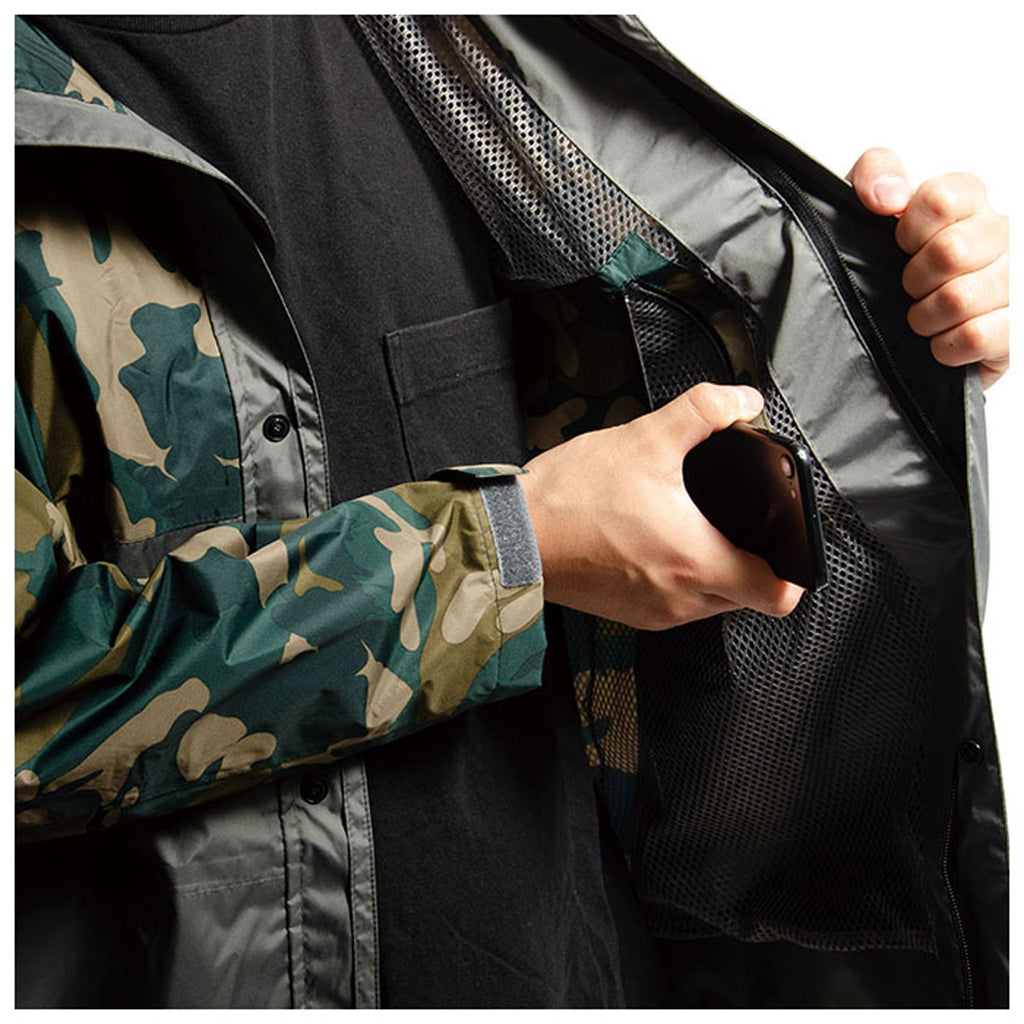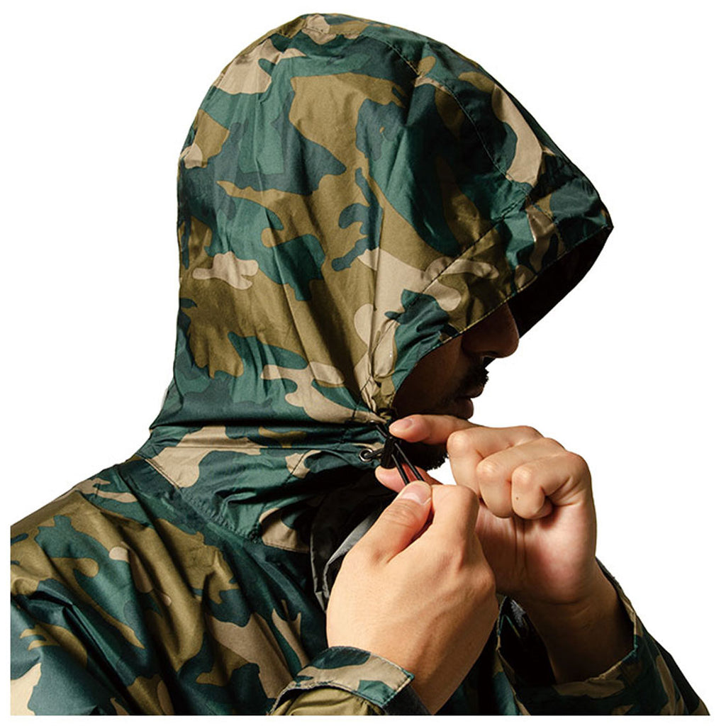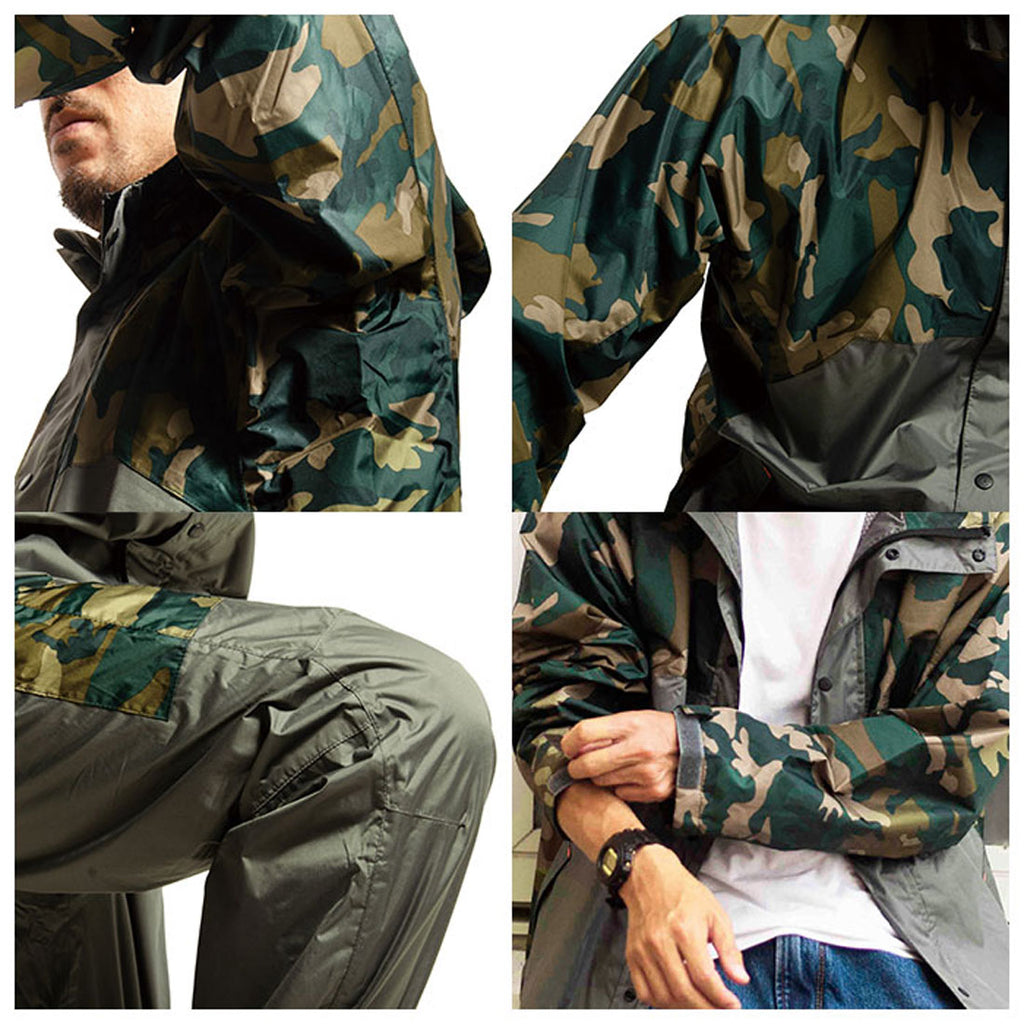 ・フードの内側やパンツのサイドラインなど随所にカモフラージュ柄を配置したデザインで、雨の日もスタイリッシュに着こなせる。