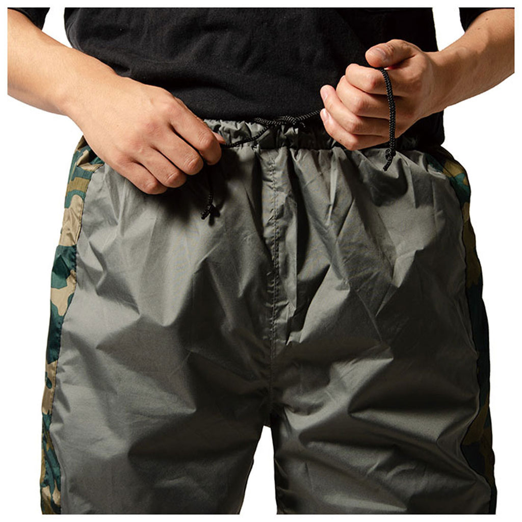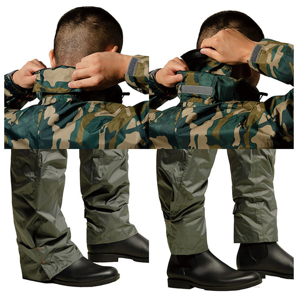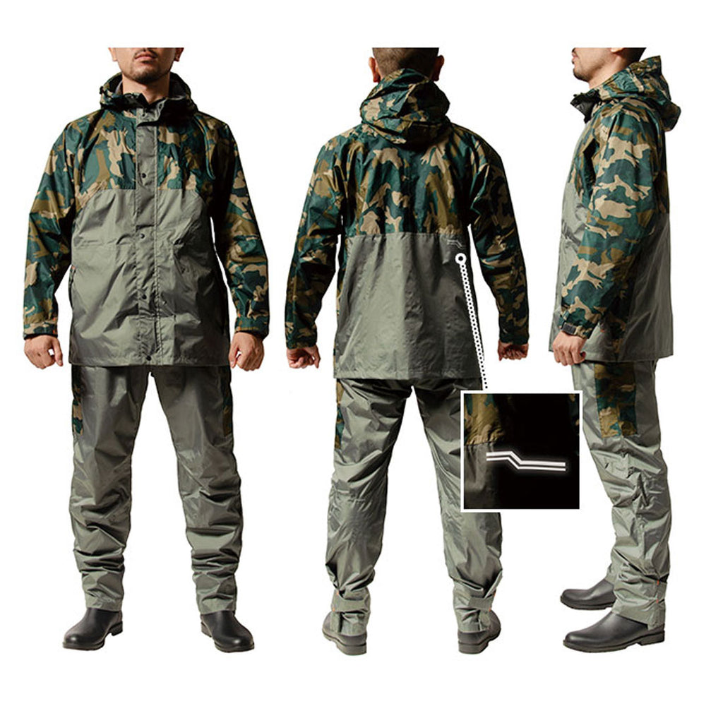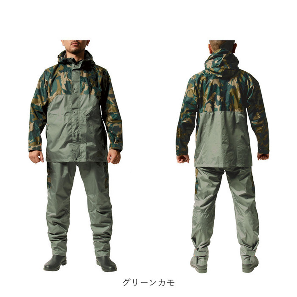 ・フードの内側やパンツのサイドラインなど随所にカモフラージュ柄を配置したデザインで、雨の日もスタイリッシュに着こなせる。