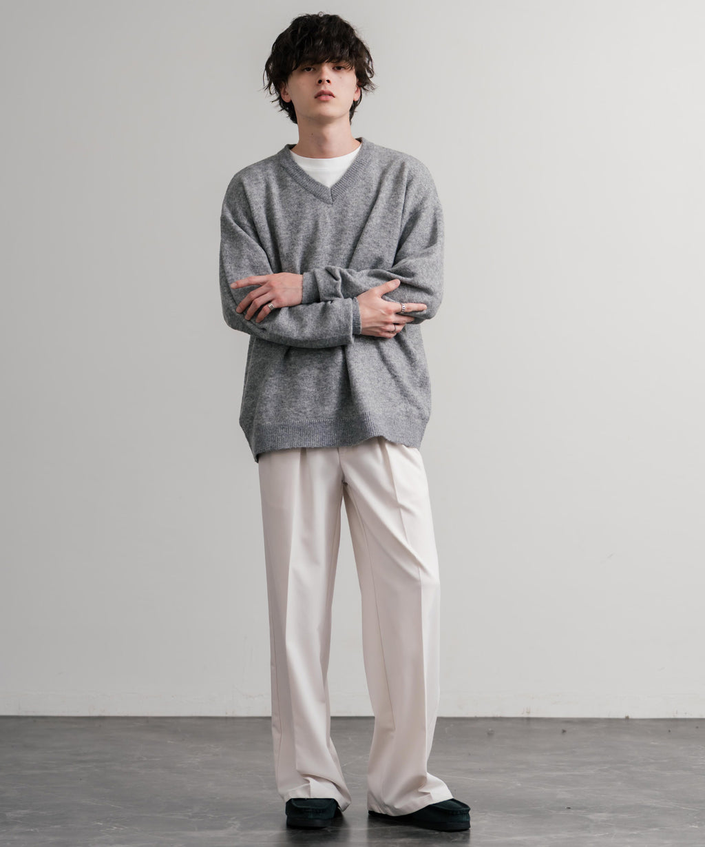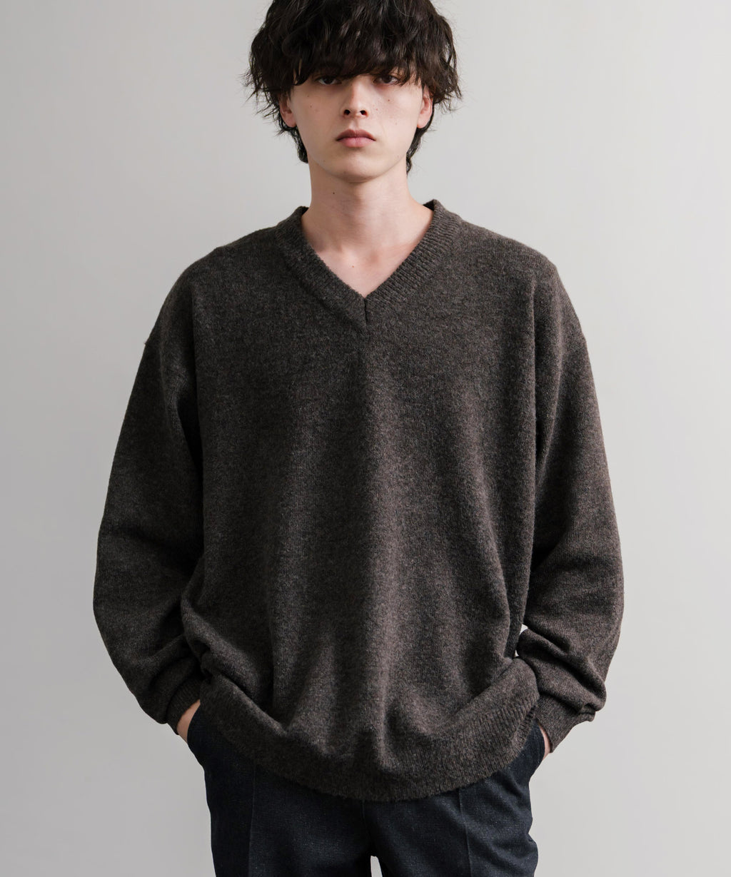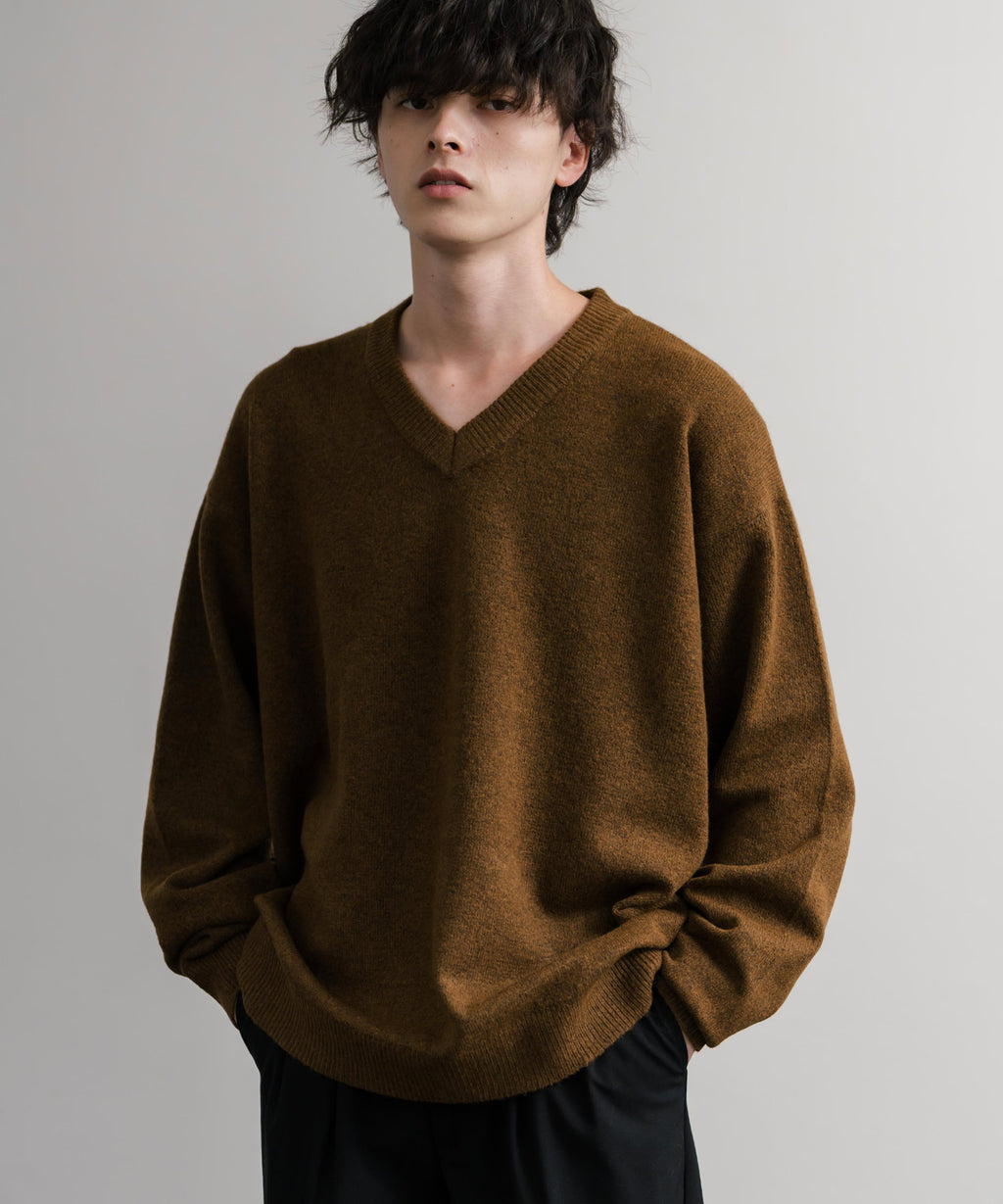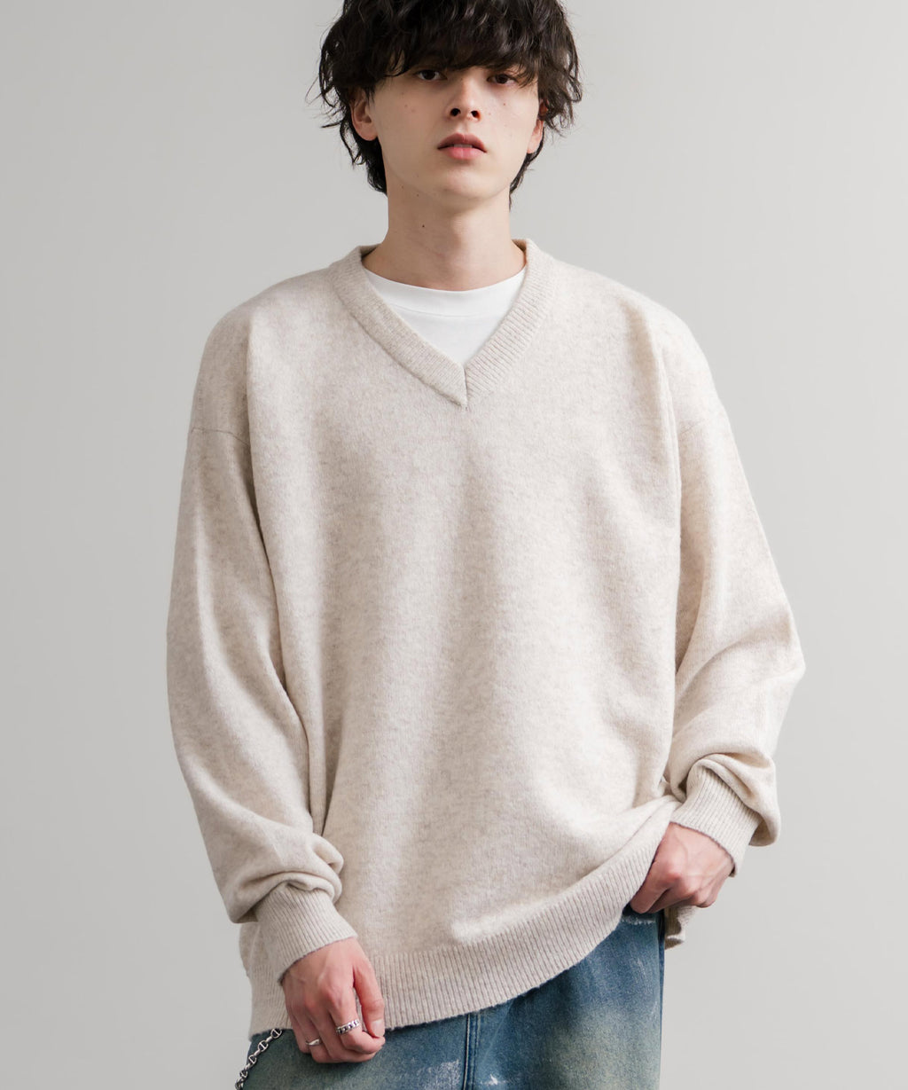 オーバーサイズ ウール混メランジVネックプルオーバーニット