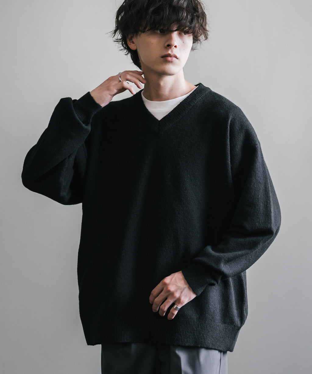 ロッキーモンロー Rocky Monroe ニット セーター 無地 メンズ レディース Vネック 長袖 天竺編み ウール混 メランジ オーバーサイズ リラックス プルオーバー 暖かい 秋冬 14715