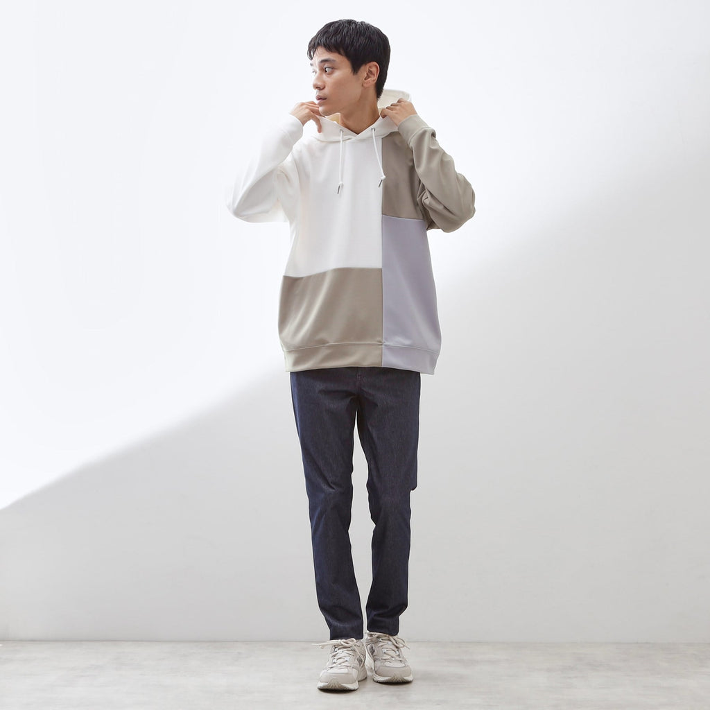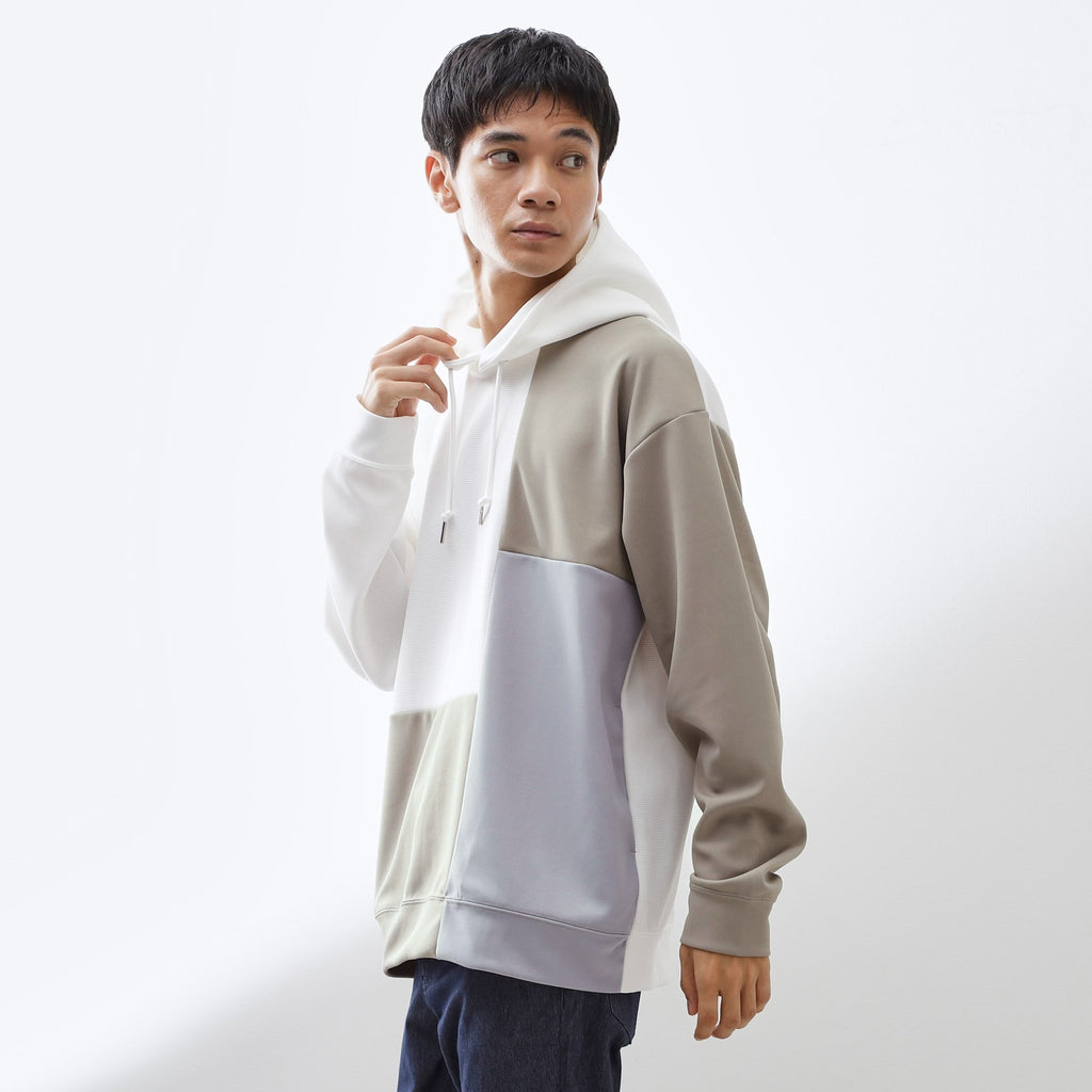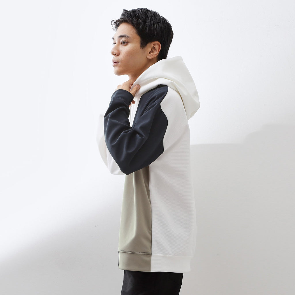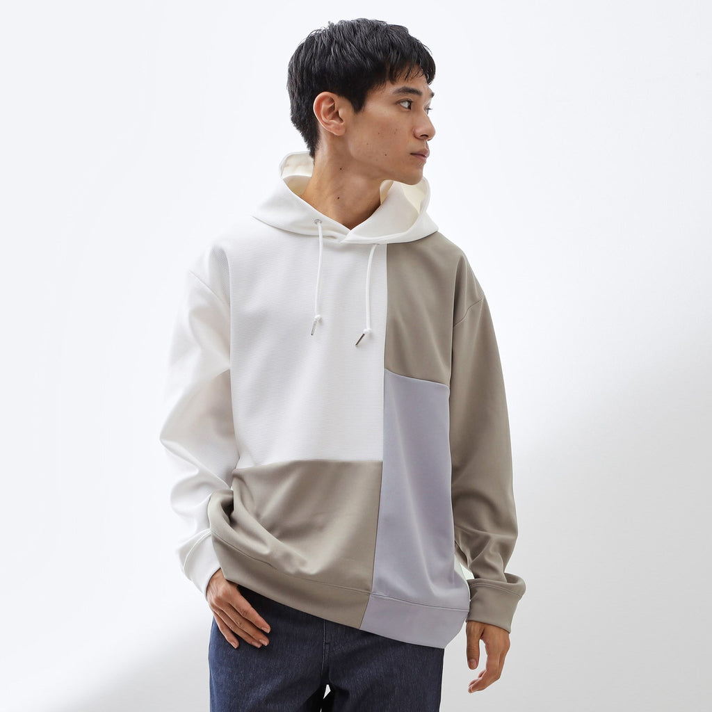 異なるカラーや素材を組み合わせたブロッキングデザインが特徴のプルパーカ。