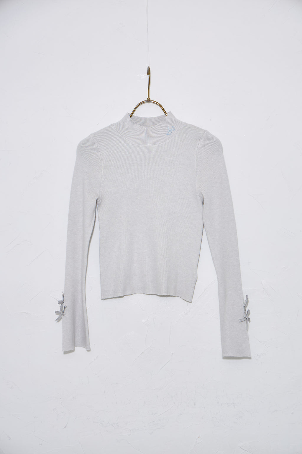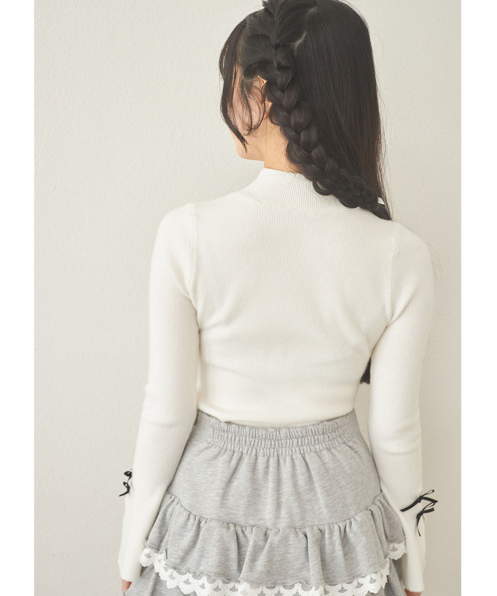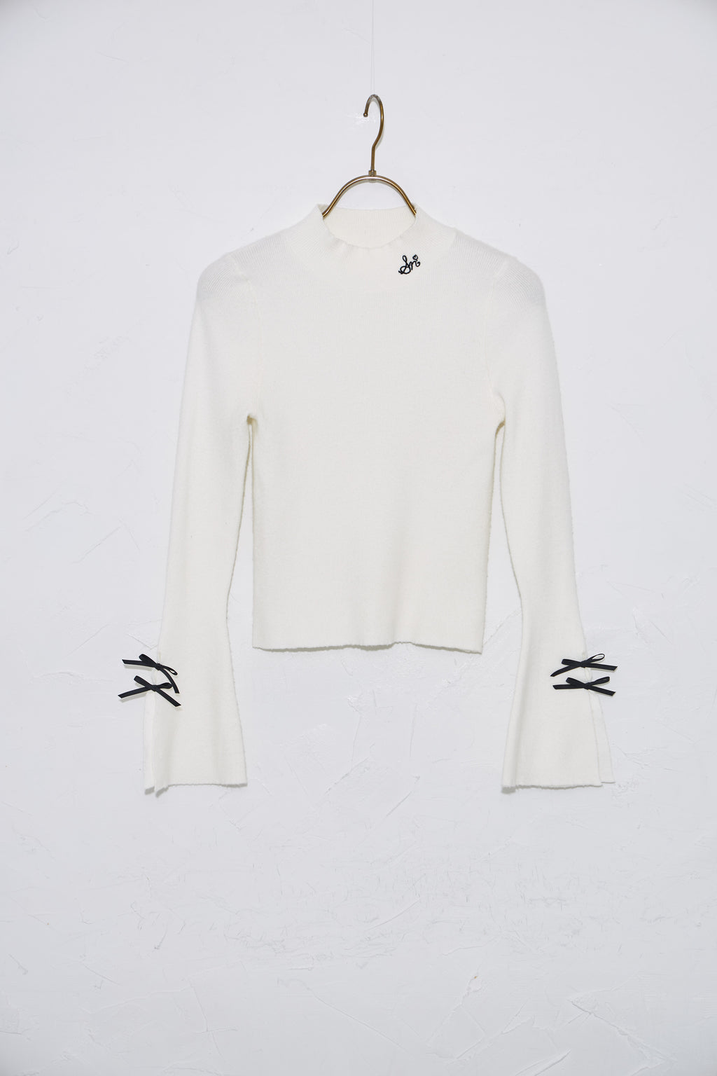 スユン Suyunn リボン付きフレアスリーブ刺繍入りハイネックリブニットプルオーバー