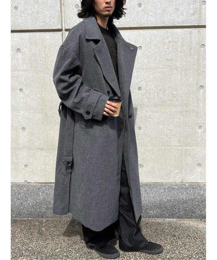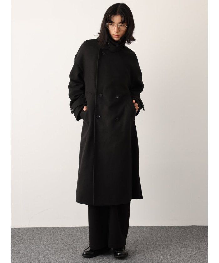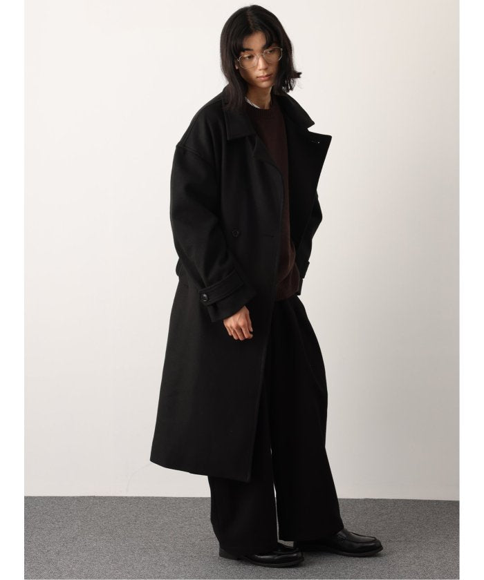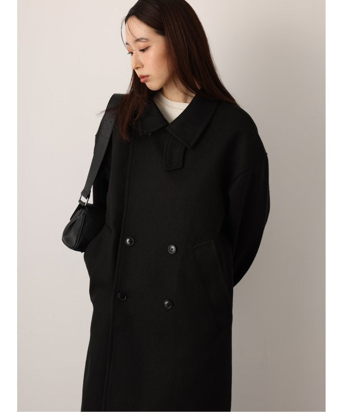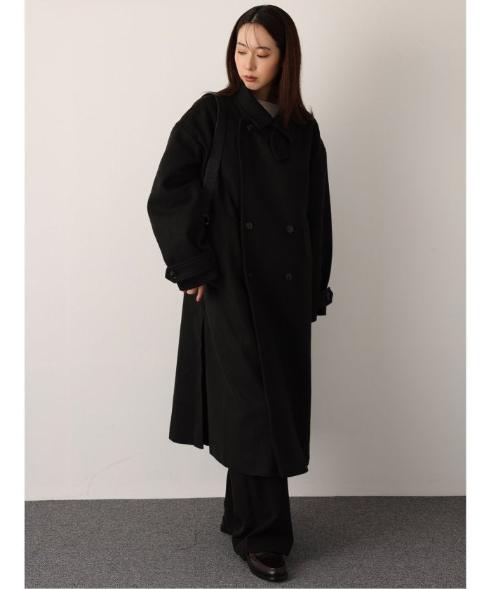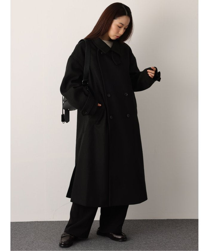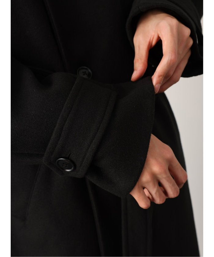 端正なテーラードカラーが目を引く、ロング丈のコート。