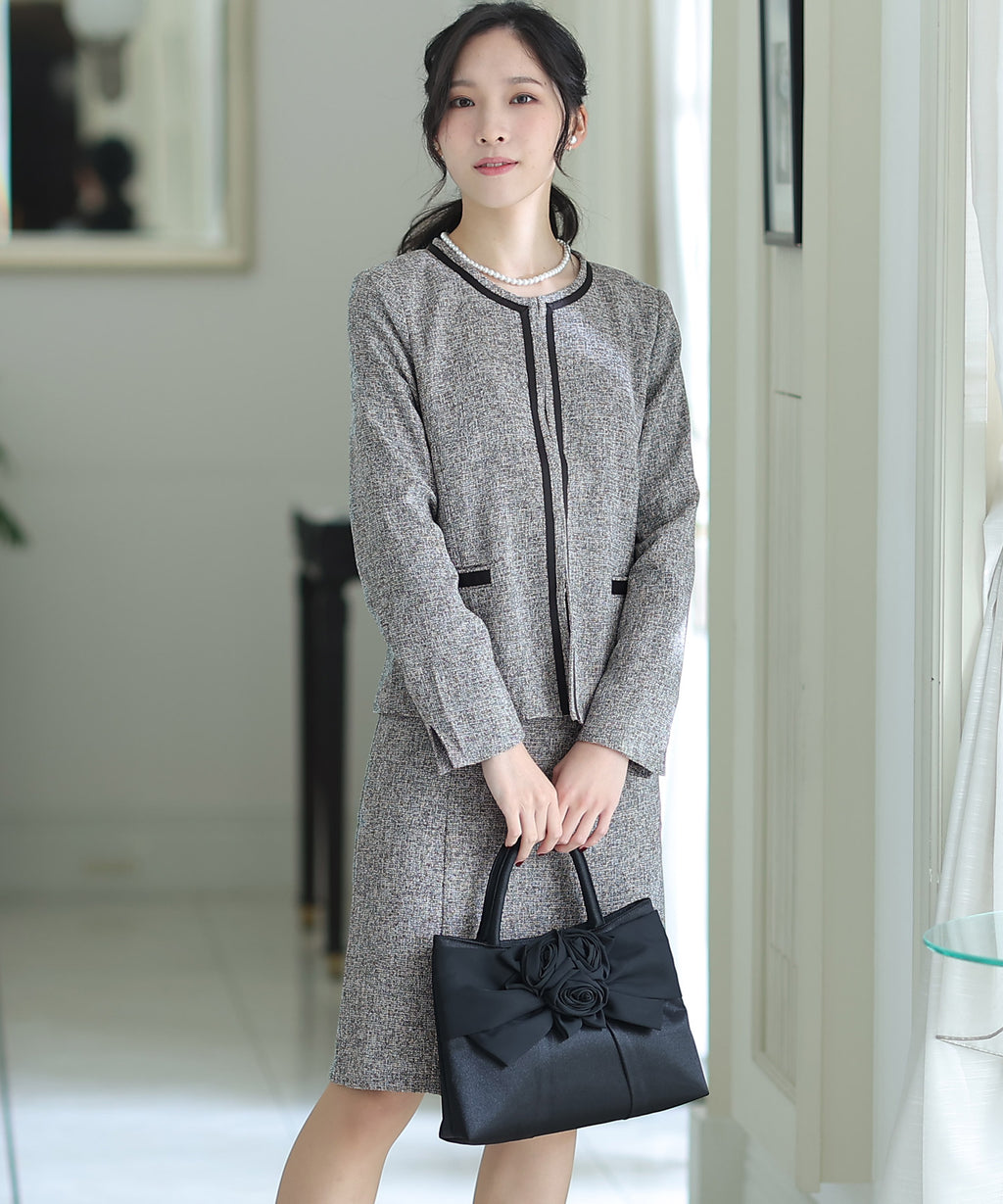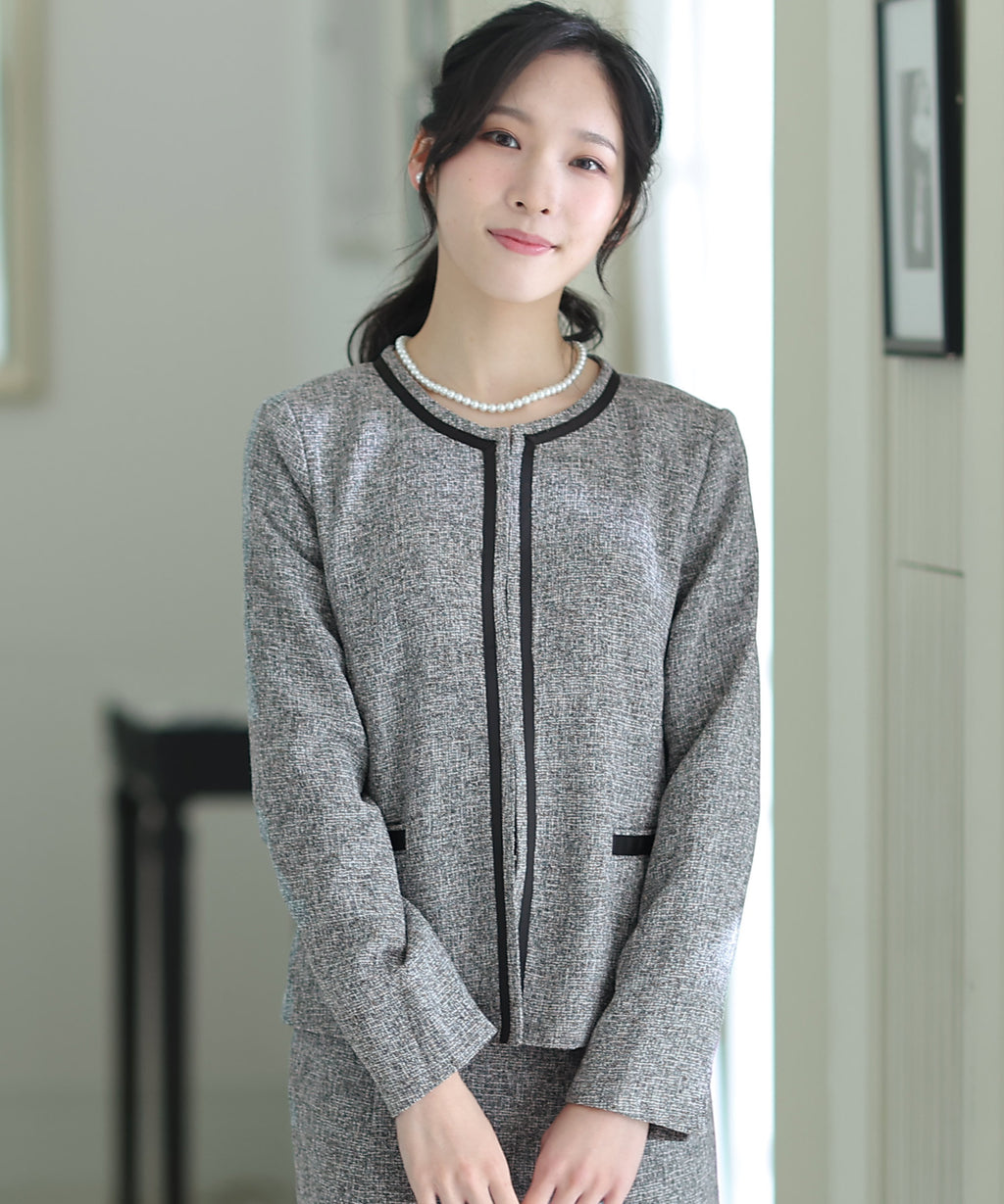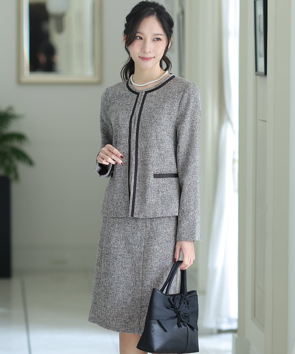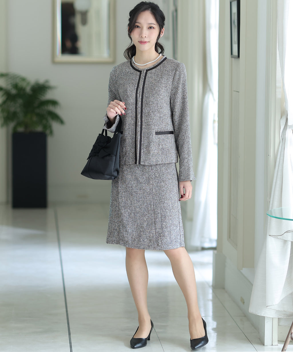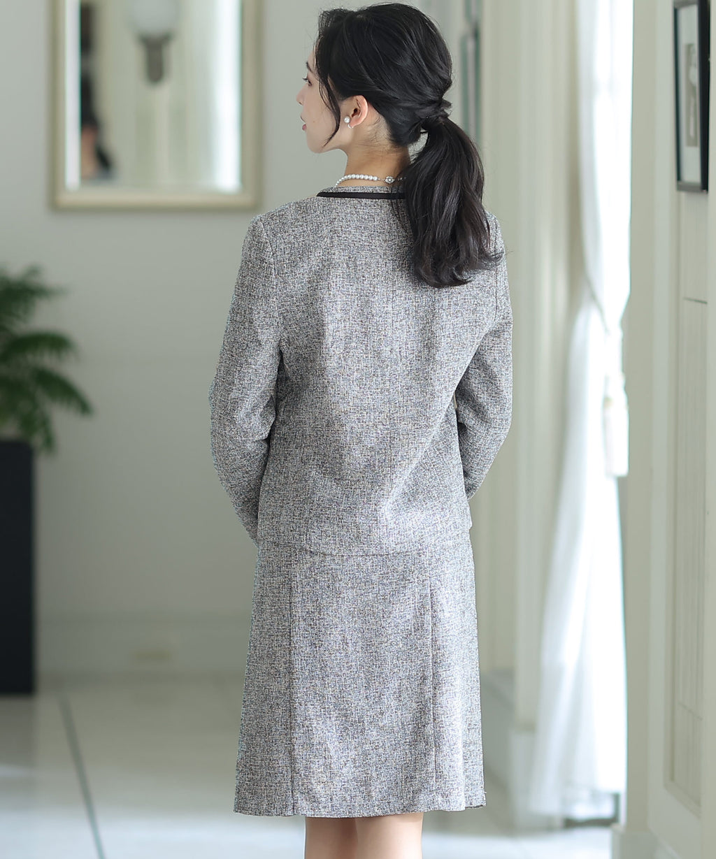ツイード生地を使ったジャケットとスカートスーツの2点セット。
