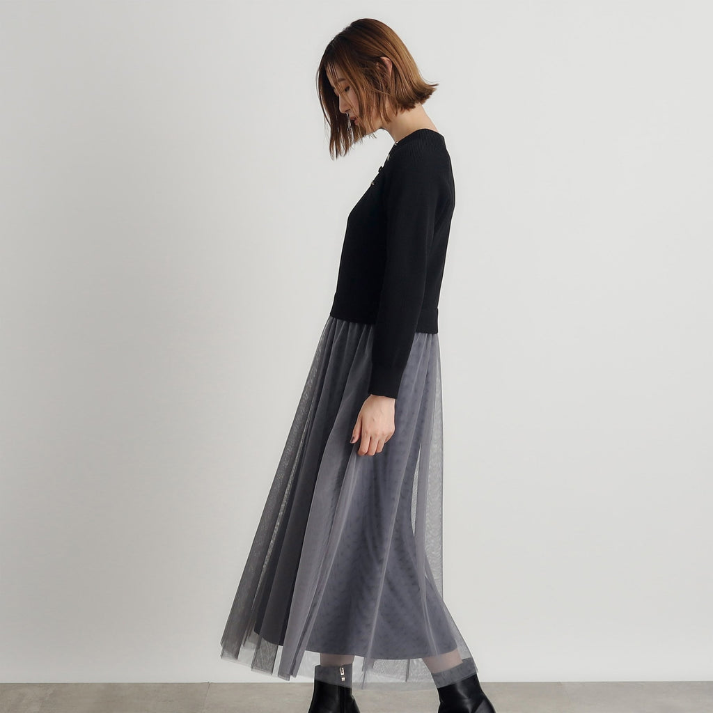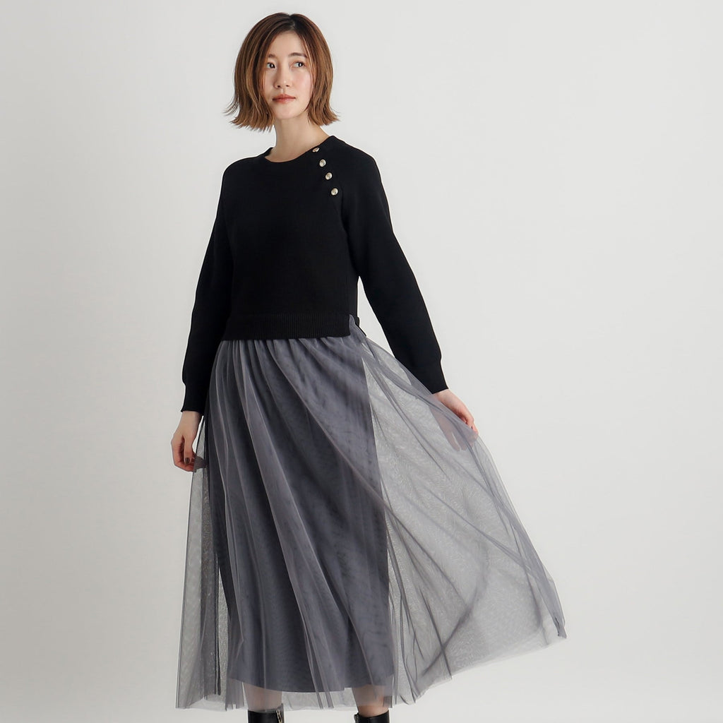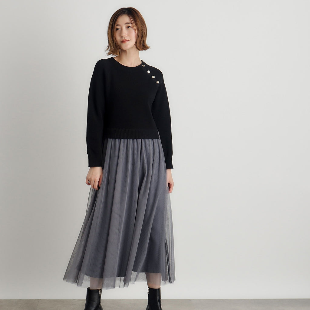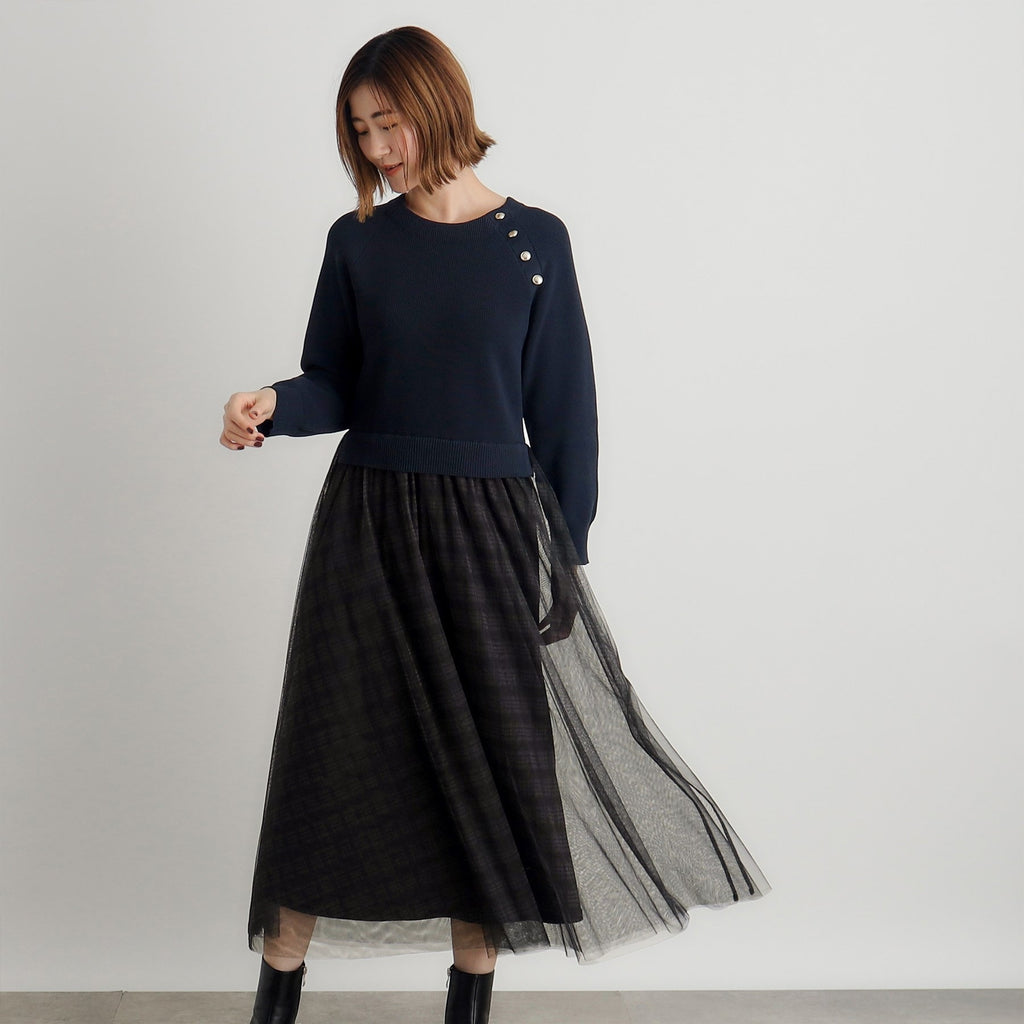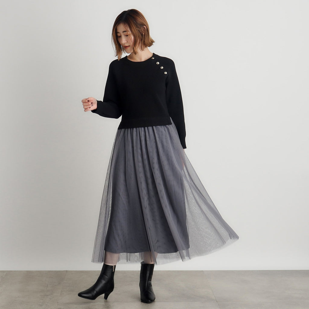 ニットプルオーバーとチュールスカートがドッキングされた、1枚で華やかに決まる時短ワンピースです。