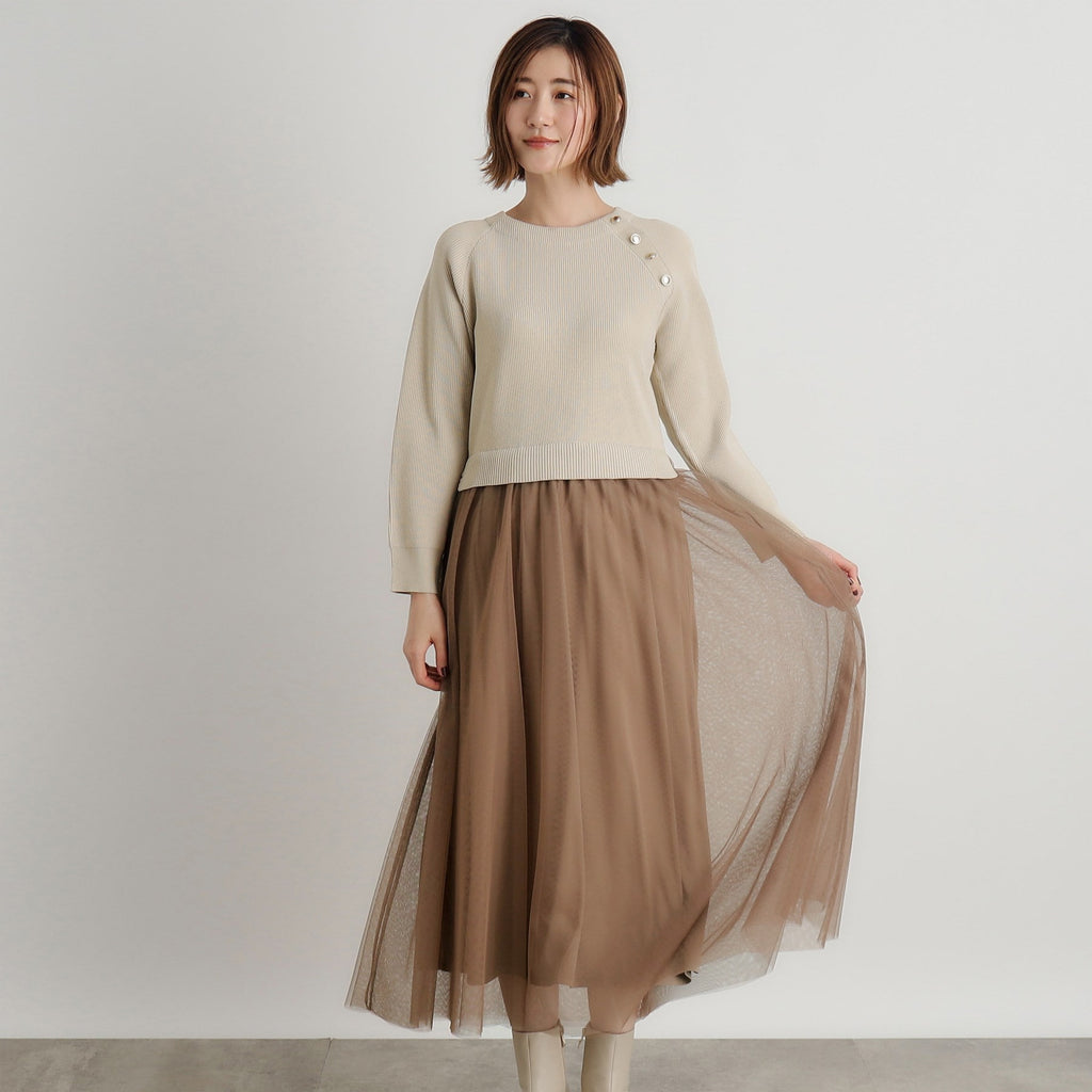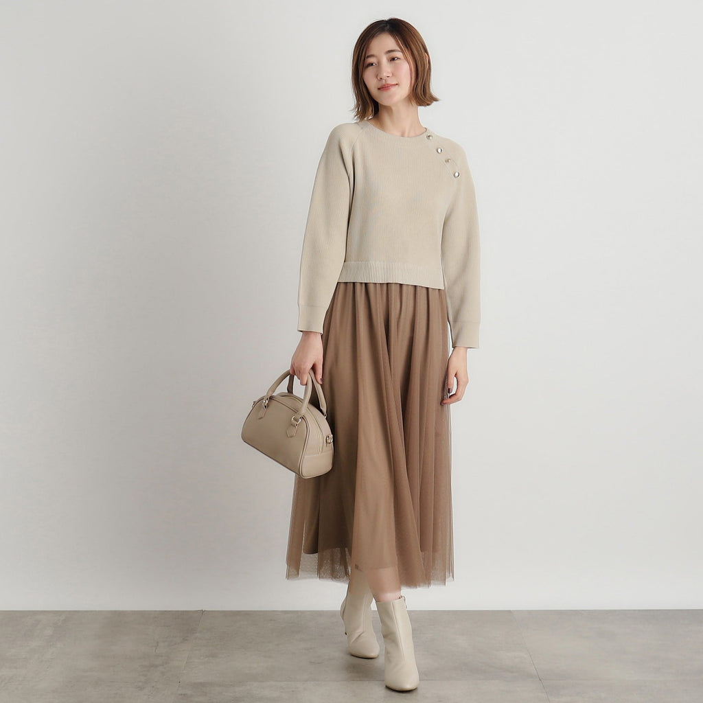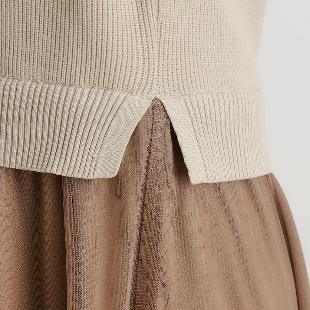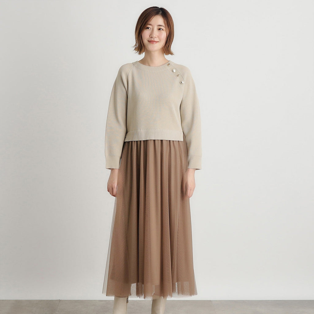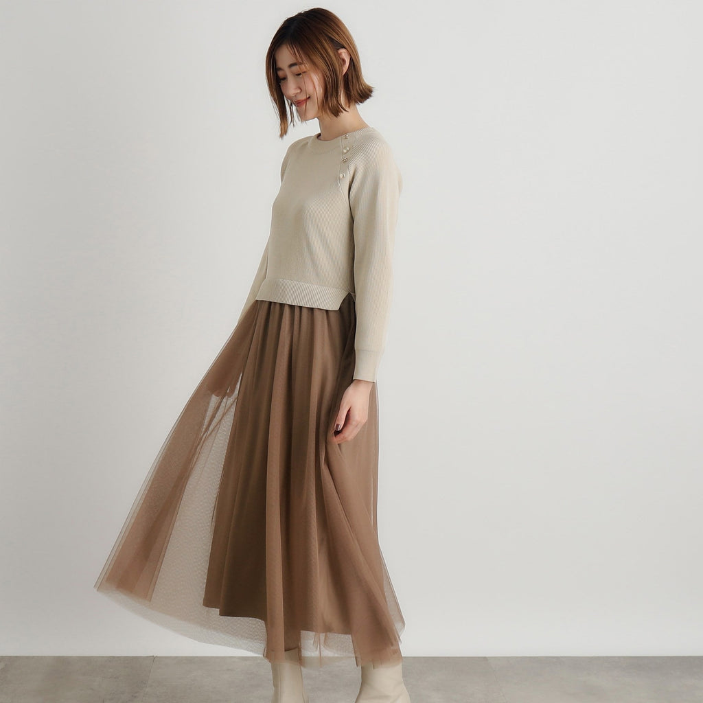 ニットプルオーバーとチュールスカートがドッキングされた、1枚で華やかに決まる時短ワンピースです。