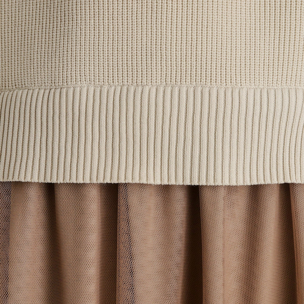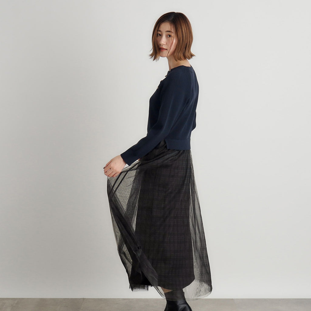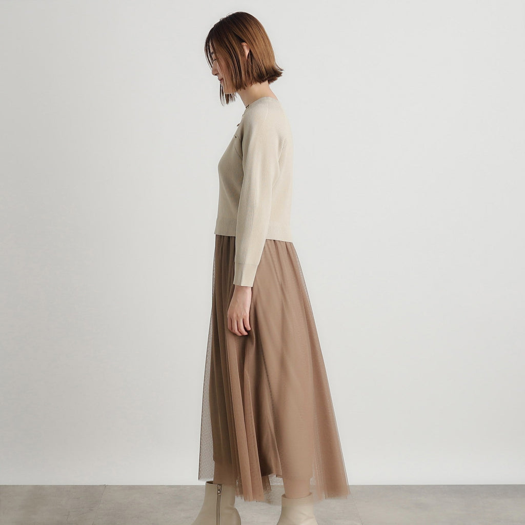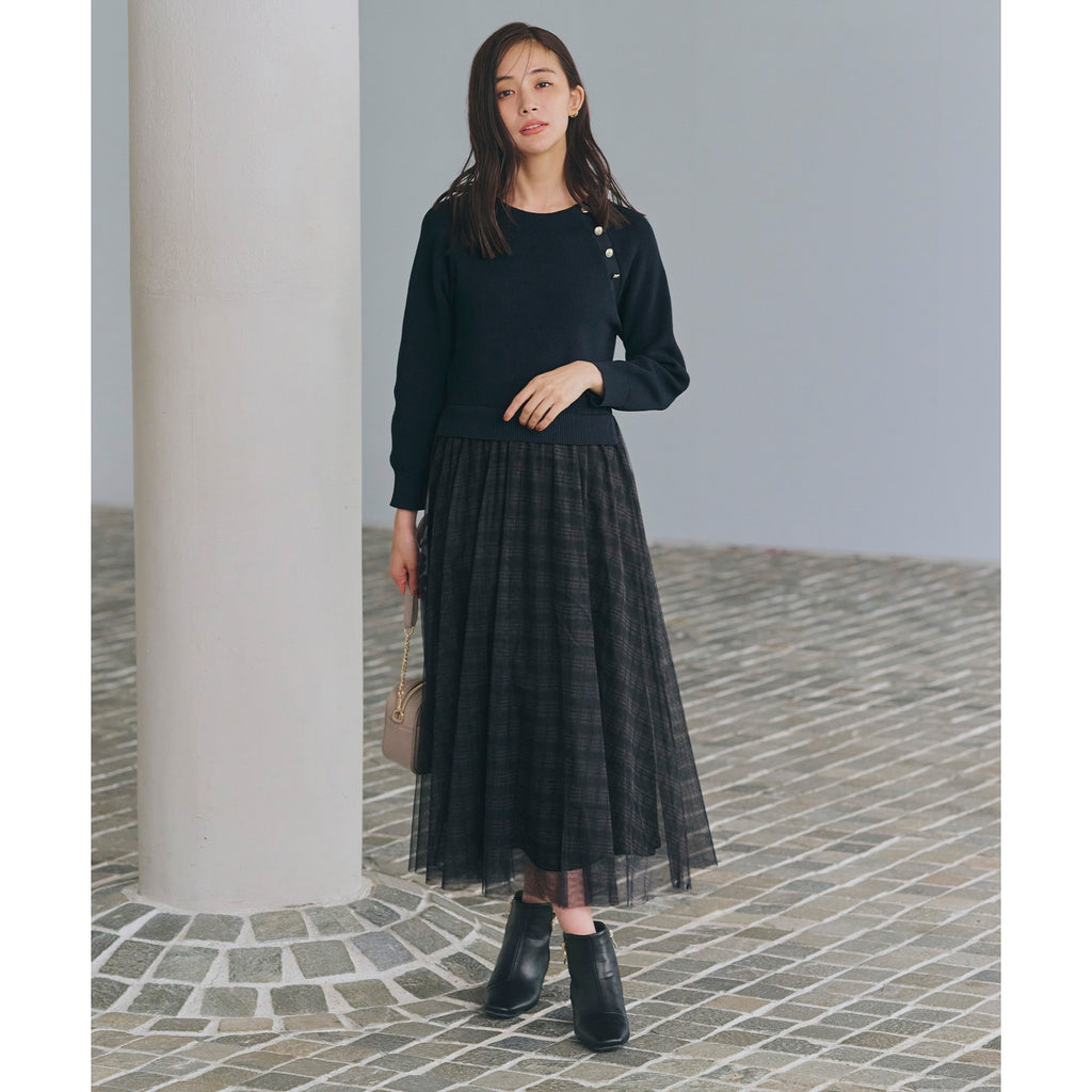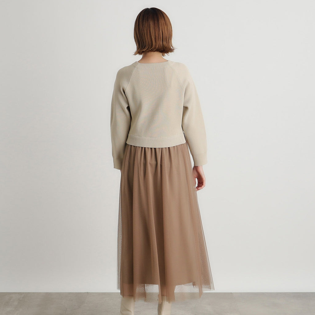 ニットプルオーバーとチュールスカートがドッキングされた、1枚で華やかに決まる時短ワンピースです。
