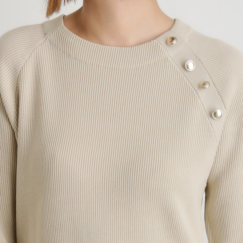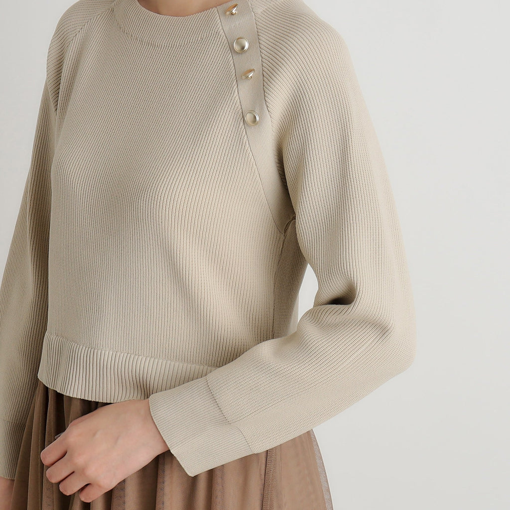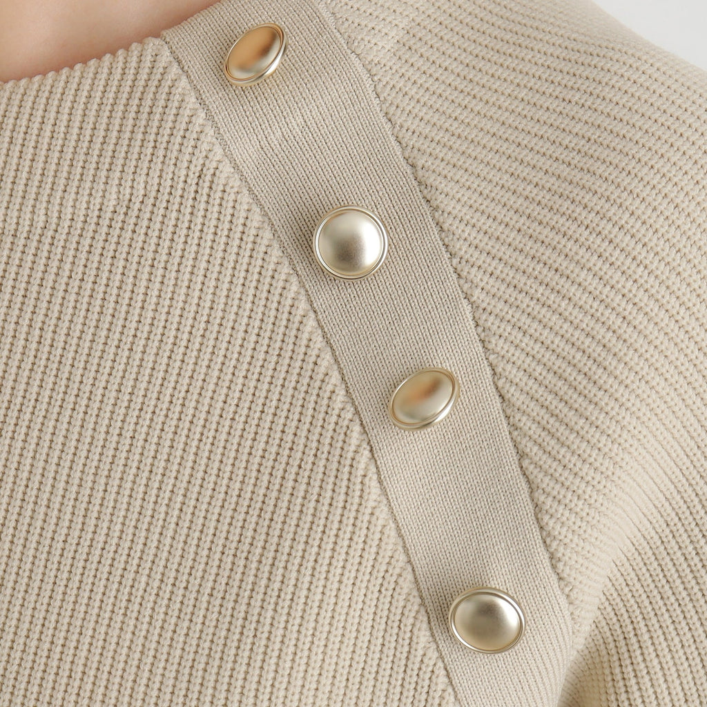 片側に金ボタンデザインをあしらって、トップスにもポイントを持たせているのでお顔まわり華やかに着用いただけます。