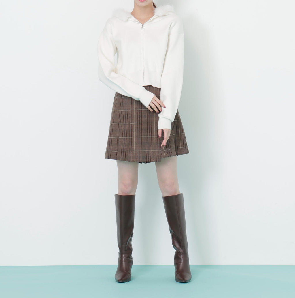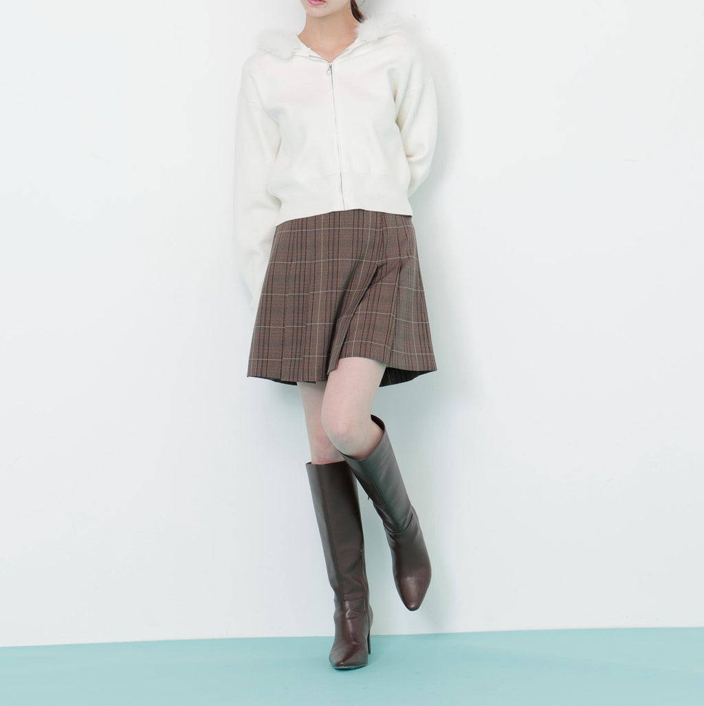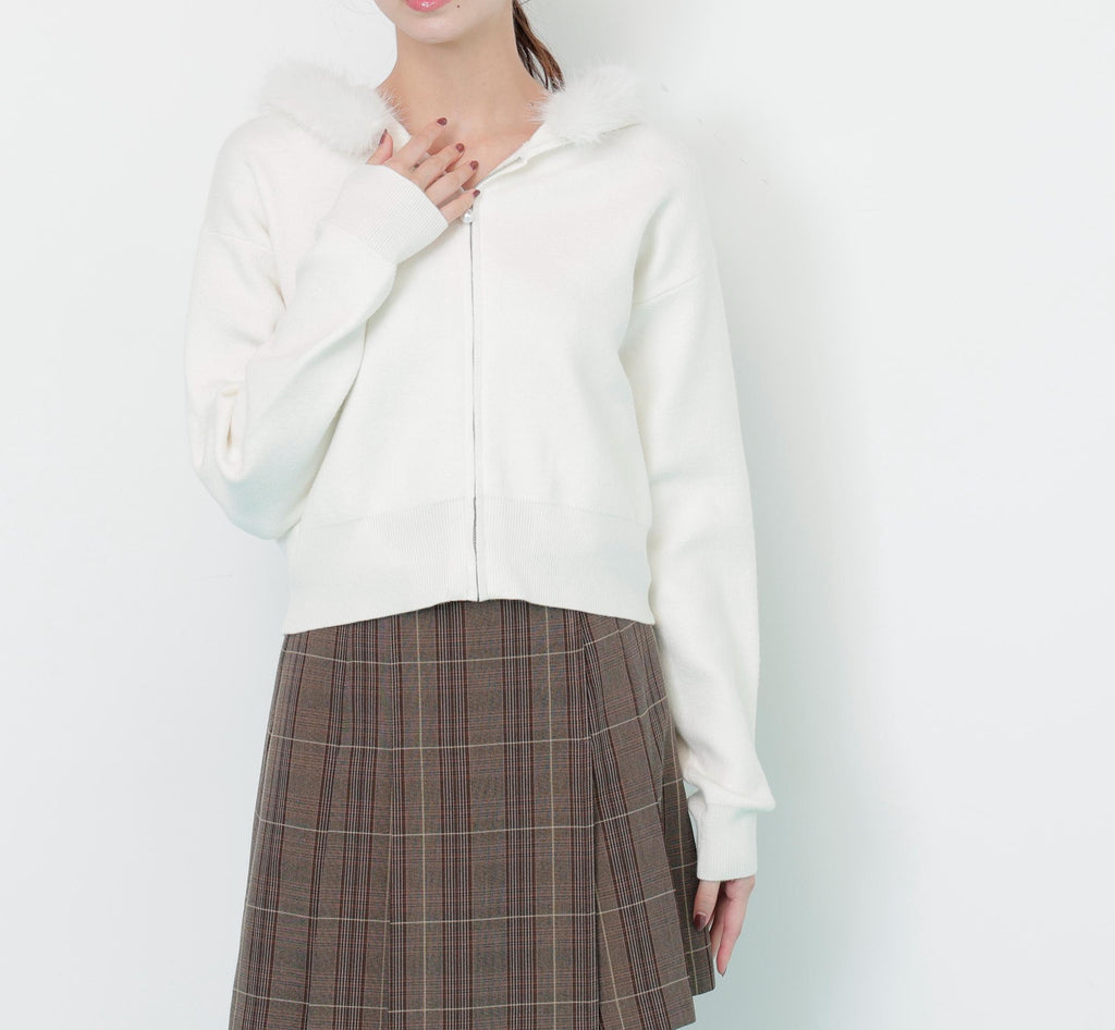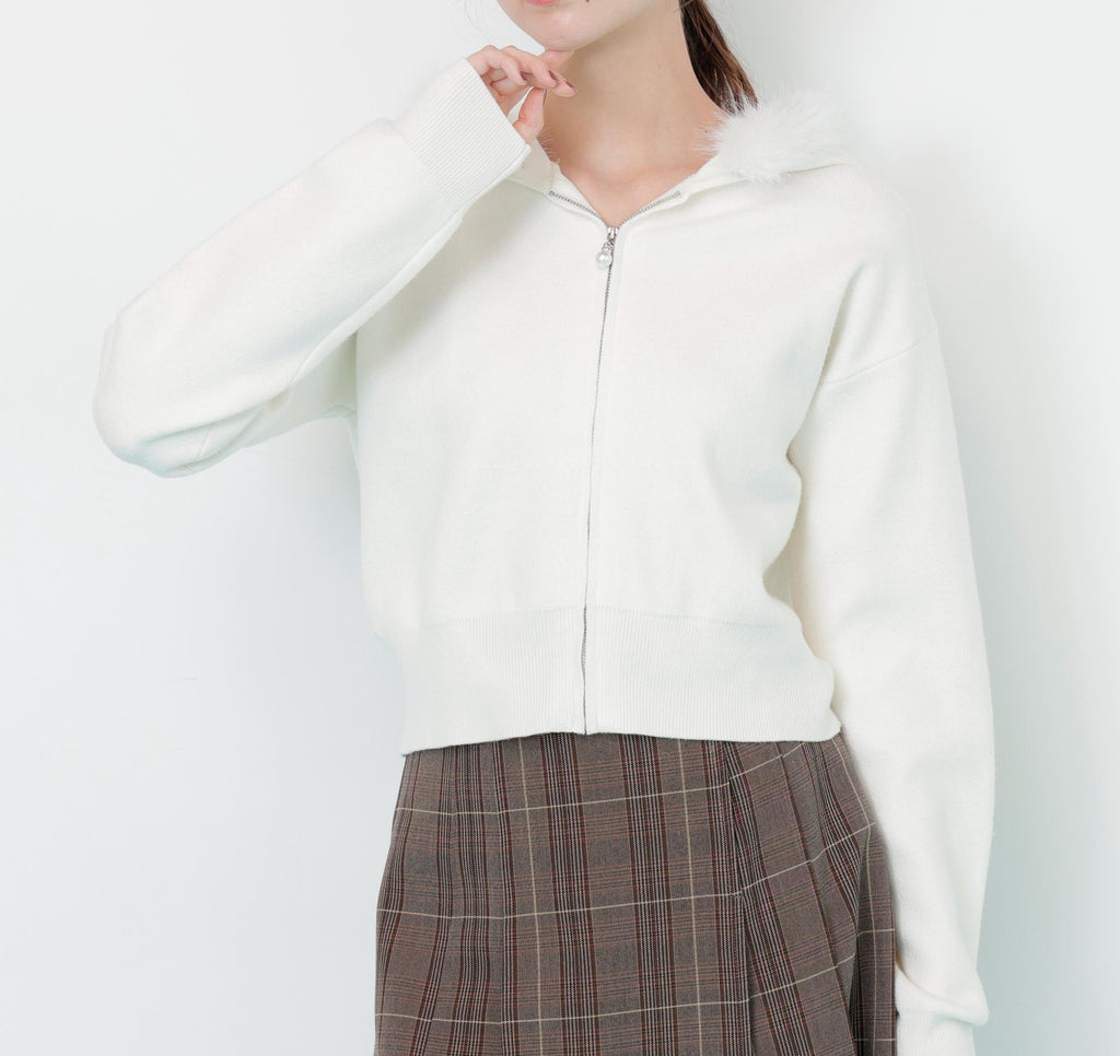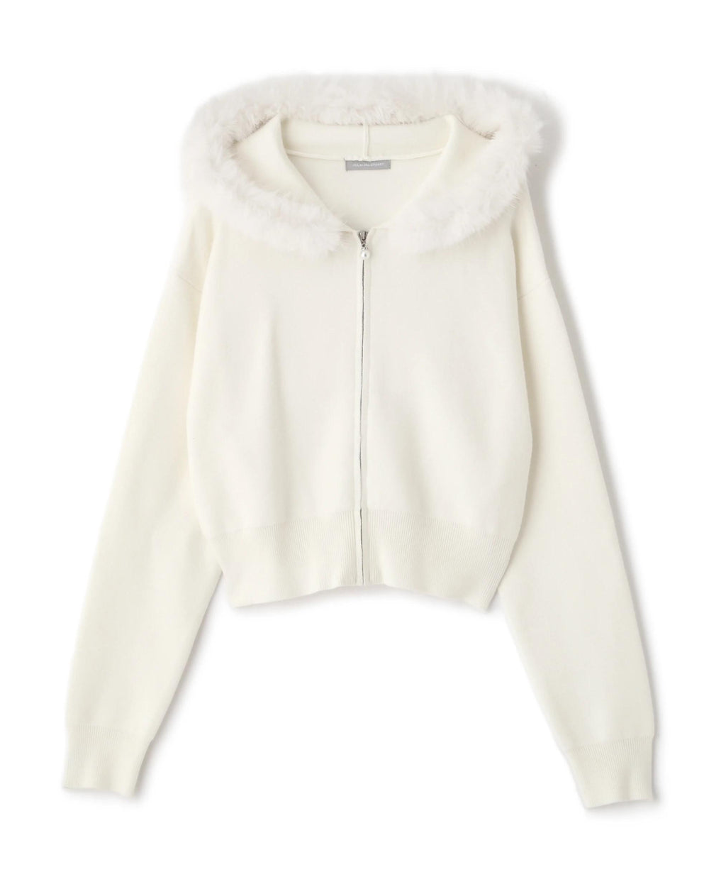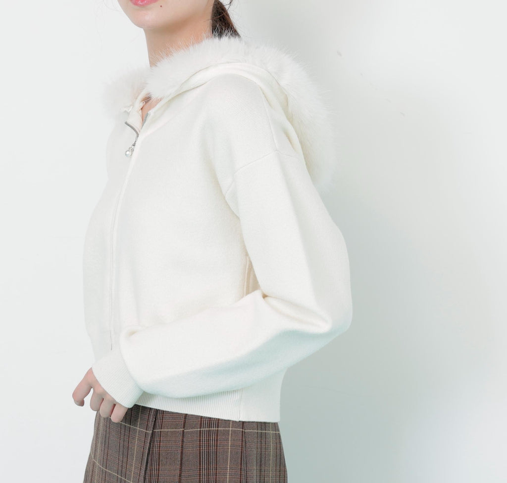 ふわふわのフェイクファーをフードに付けたニットパーカー。季節感があり、羽織るだけでコーディネートを可愛らしくアップデート。パール調の引き手ファスナーもきらっとアクセントになっています。デニムやスカートとも好相性な、冬のマストアイテムです。※撮影時照明の関係により、色味が違って見える場合がございます。